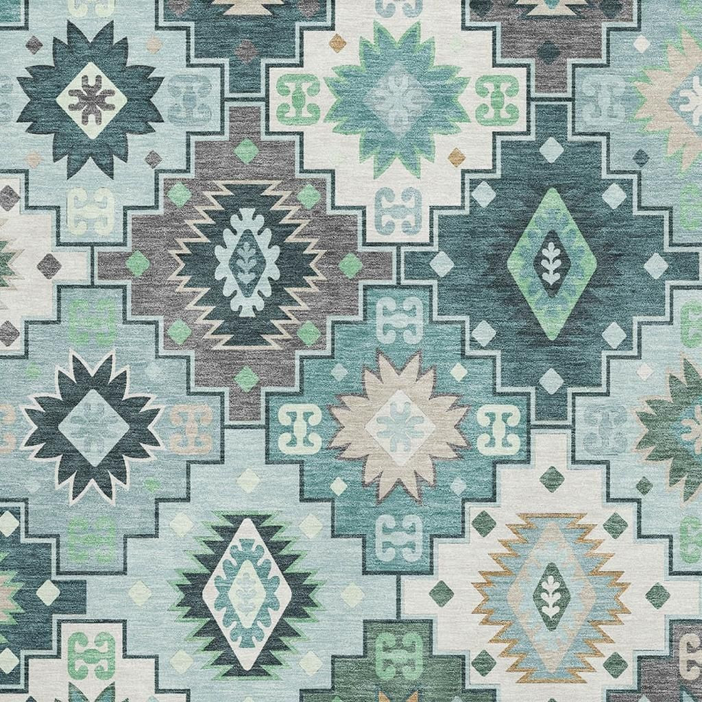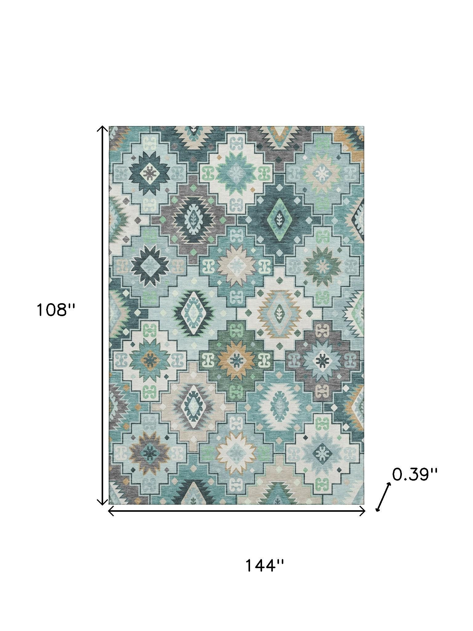 Add great coloration and comfortable texture to your space with this 9-foot x 12-foot teal and ivory geometric washable area rug with uv protection. Ideal for spaces with kids and pets, this rug is stain resistant to help repel dirt and spilled liquids. Built to last, this rug crafted from polyester fibers is known for its durability and long lasting appeal. Rugs are a great way to showcase your style, hide imperfections, warm your home and reduce noise. This larger sized, transitional styled rug is ready to create a focal point or statement piece in your room. 108.00-inch h x 144.00-inch w x 0.39-inch d.