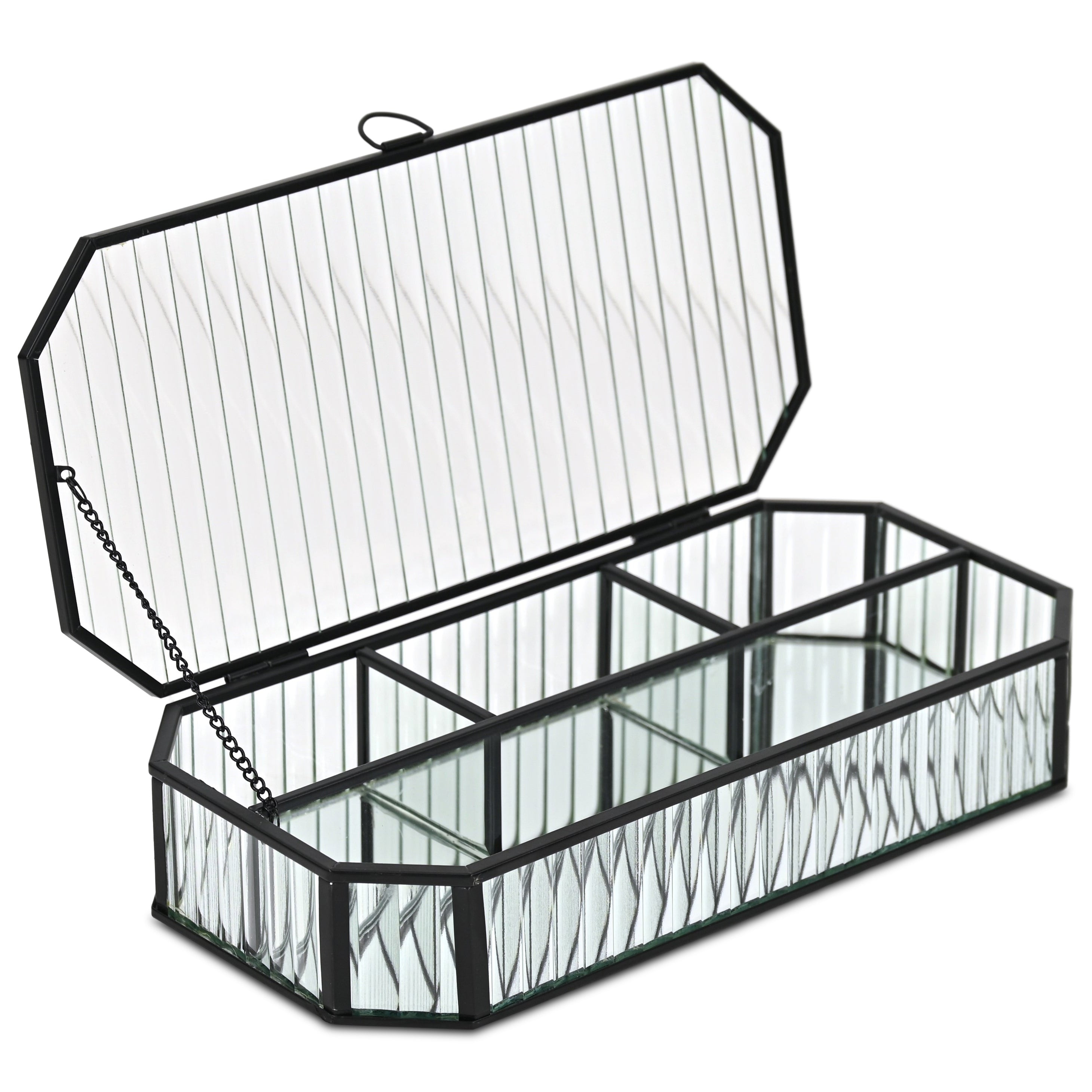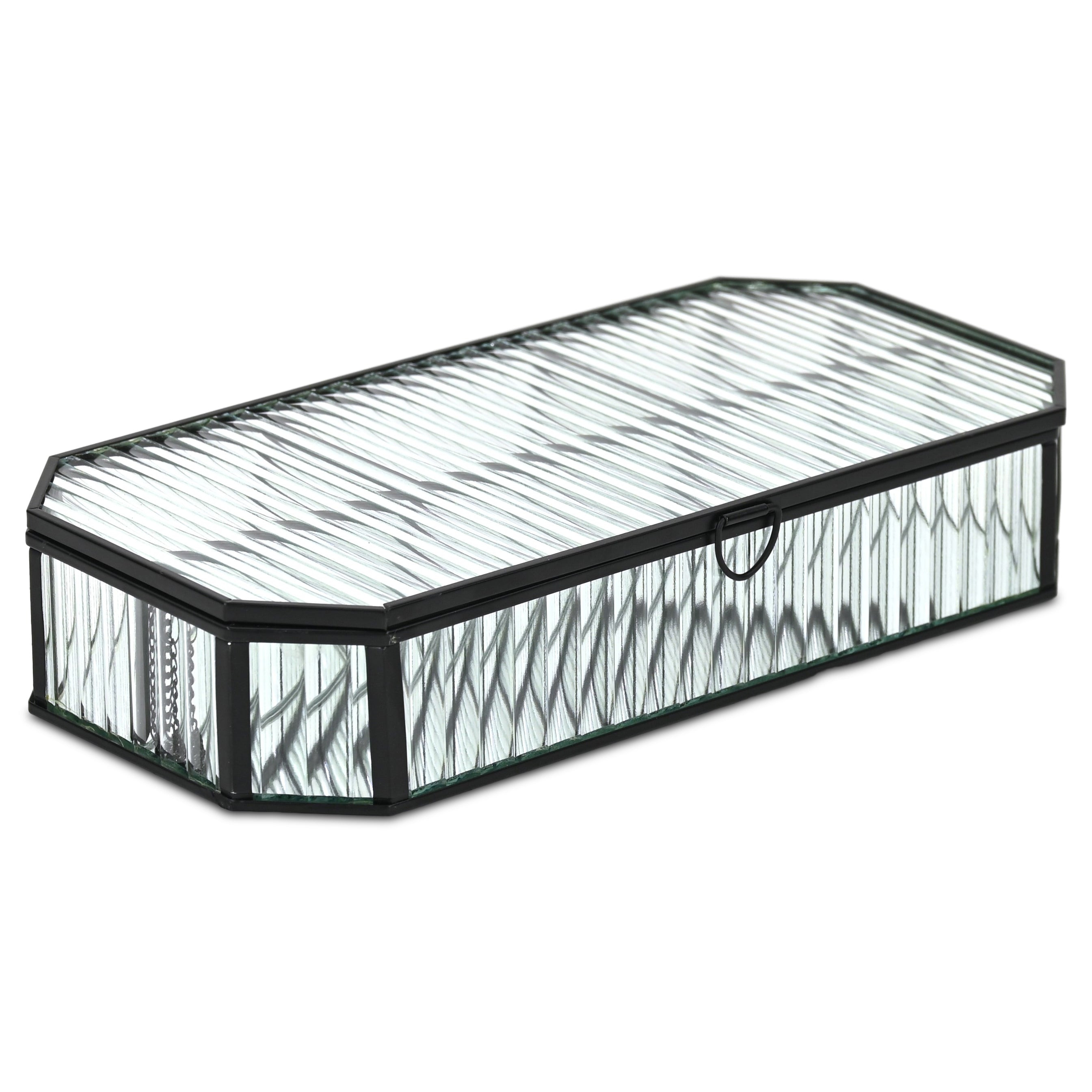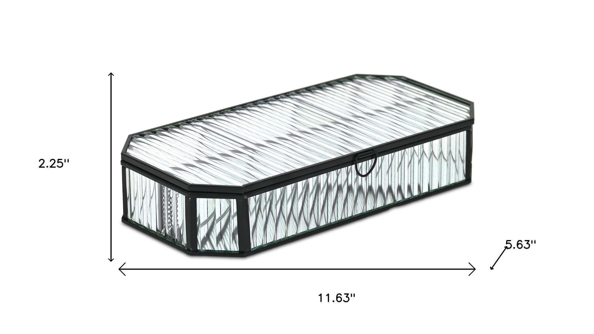 Unique and decorative, this 2-inch black glass hand painted decorative box will leave a lasting impression. This unique decorative object makes a great piece for your coffee table, desk, or bookshelf. It's a perfect addition for those who love an up-to-the-minute look and feel. 2.25-inch h x 11.63-inch w x 5.63-inch d.