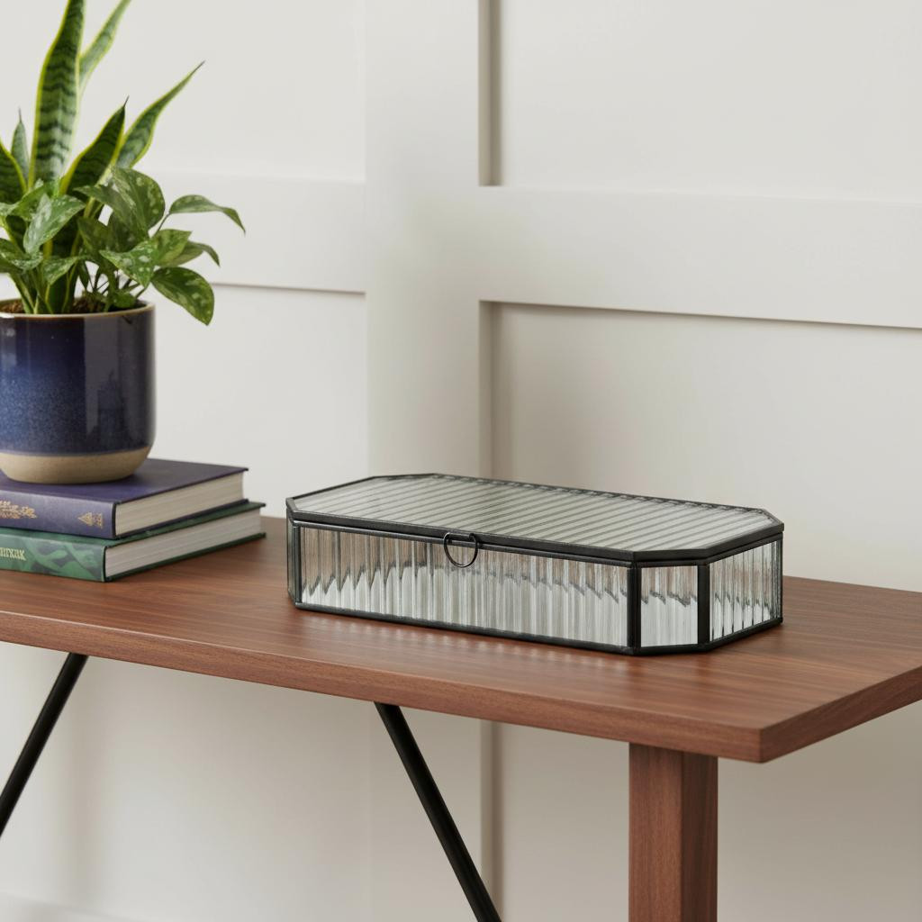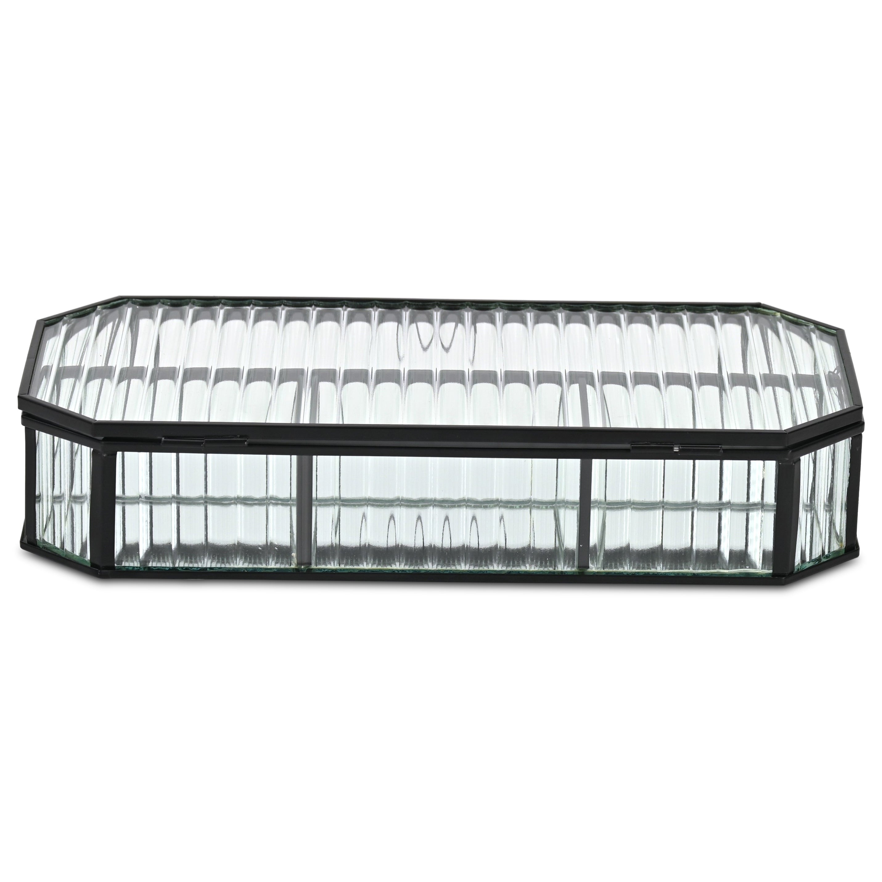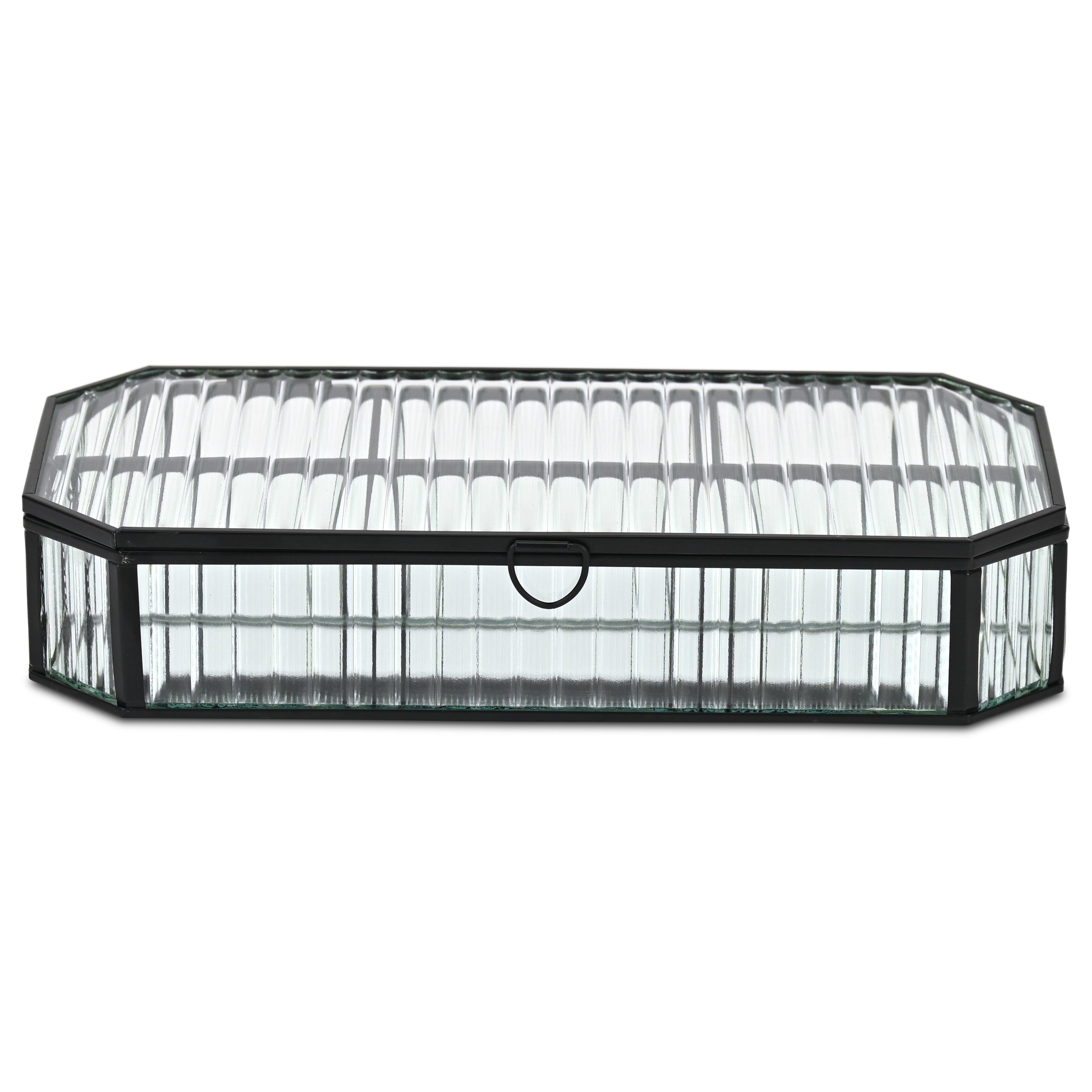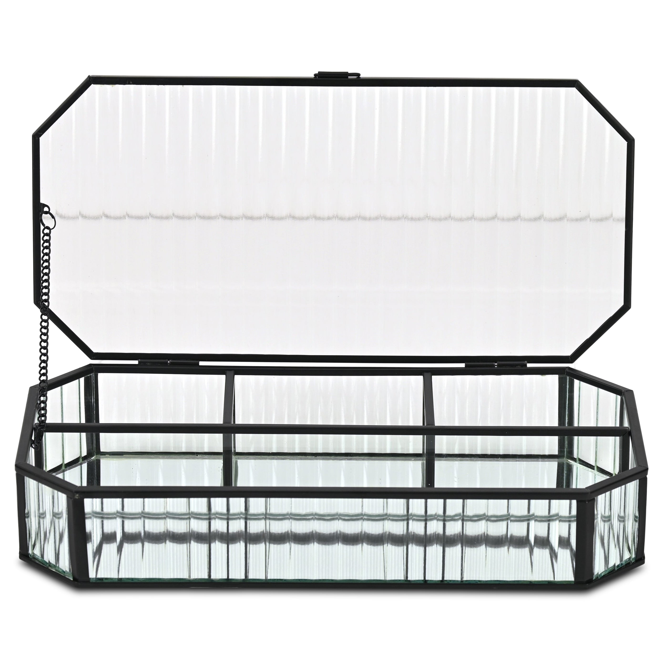 Unique and decorative, this 2-inch black glass hand painted decorative box will leave a lasting impression. This unique decorative object makes a great piece for your coffee table, desk, or bookshelf. It's a perfect addition for those who love an up-to-the-minute look and feel. 2.25-inch h x 11.63-inch w x 5.63-inch d.