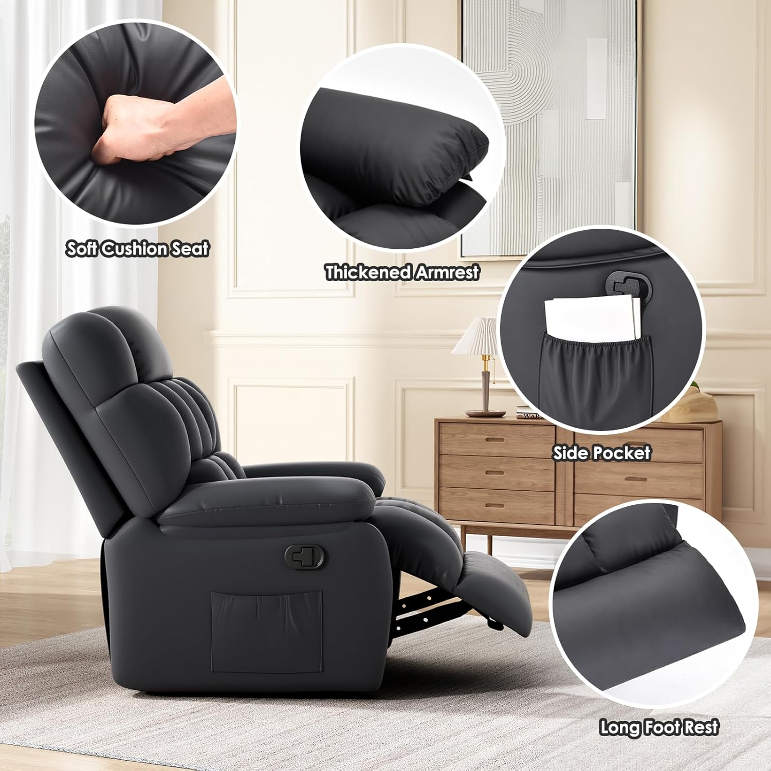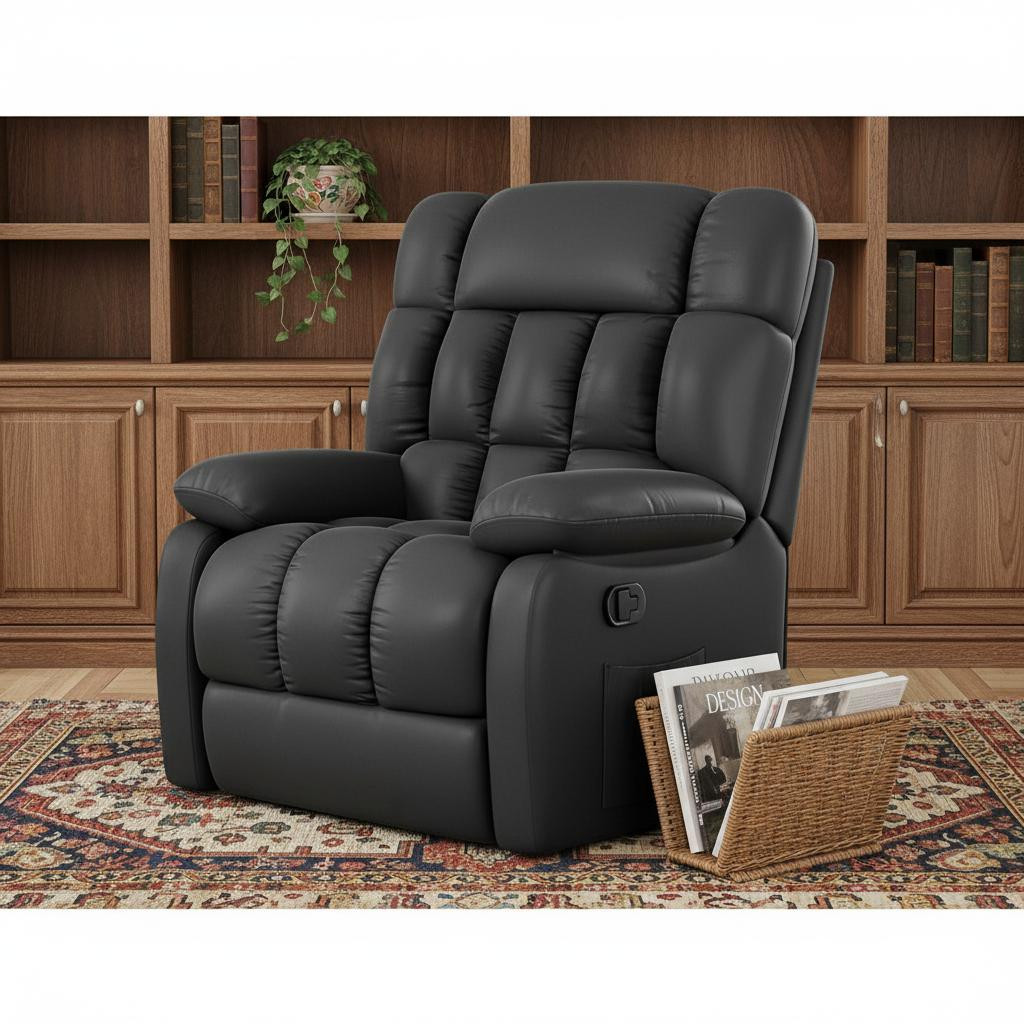 Comfortable and designed with convenience in mind, this 39-inch black faux leather manual recliner has everything you are looking for. Durable faux leather upholstery is soft to the touch, easy to maintain, and simple to clean with only a damp cloth. Bold black gives this chair a modern chic look and feel. This manual recliner makes it easy for you to shift positions with a manual handle lever. From morning coffee to evening tv/movie nights and everything in between, this cozy chair will be a welcome addition to your rest and relaxation routine. Take relaxation to the next level with this comfy reclining chair. 42.00-inch h x 39.00-inch w x 36.00-inch d.