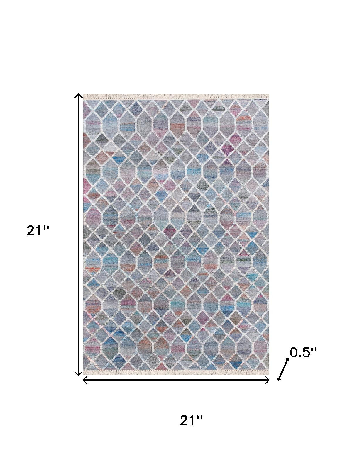 This 2-foot x 2-foot blue and gray geometric hand woven square rug, is a great way to add warmth to a room. Crafted by skilled artisans, this hand woven rug is genuine and unique. No two will be exactly alike. Crafted from eco-friendly recycled pet fibers that are made from recycled water bottles and other biodegradable items to give this rug a comfortable feel, stain resistance and the added benefit of reducing waste in our landfills. Rugs are a great way to showcase your style, hide imperfections, warm your home and reduce noise. This smaller sized, modern styled rug is just what you need for your walkway, bedside, in front of door, cabinet, refrigerator, or chair. 21.00-inch h x 21.00-inch w x 0.50-inch d.