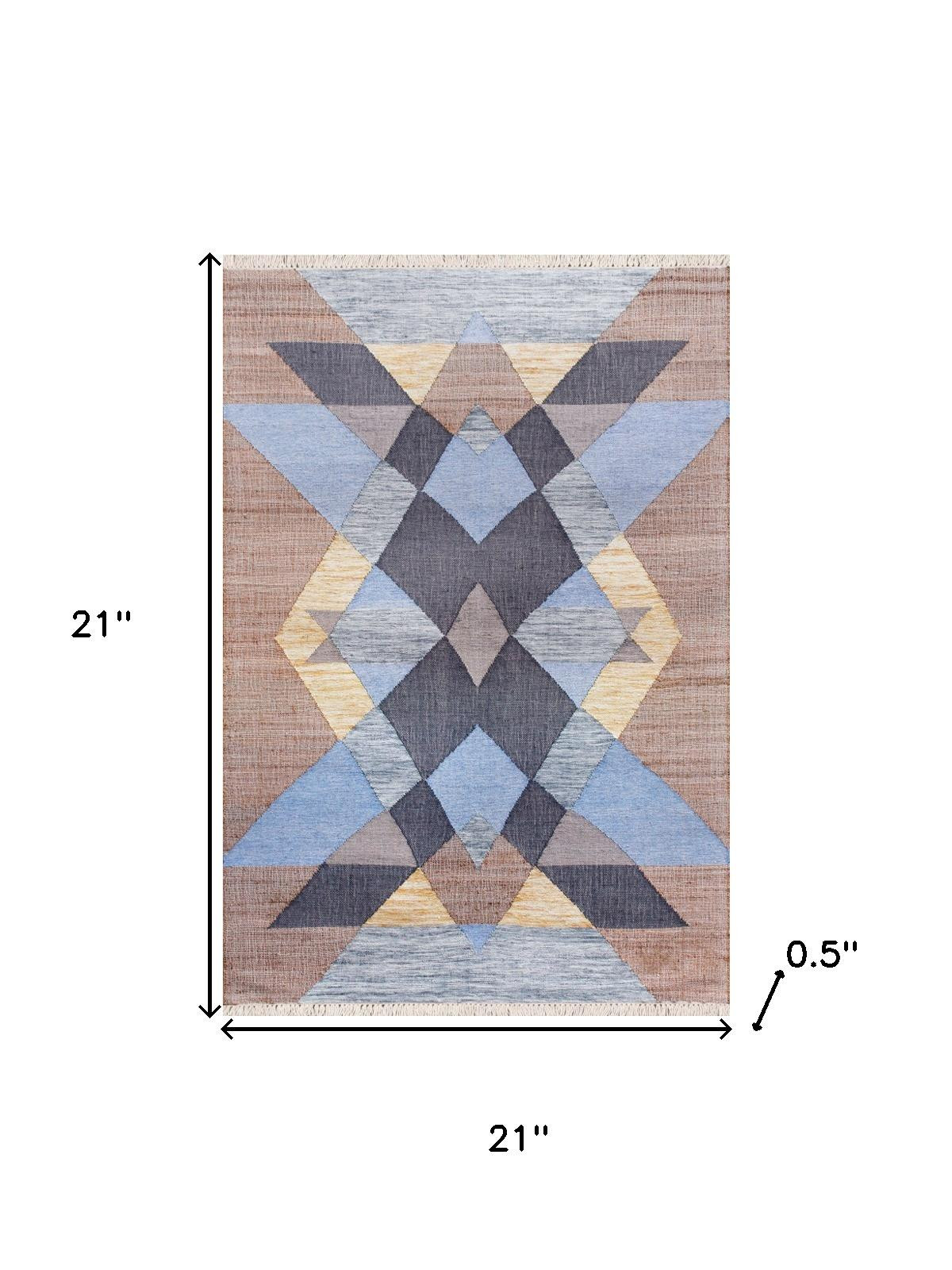 This 2-foot x 2-foot beige and blue jute geometric hand woven square rug, is a great way to add warmth to a room. Crafted by skilled artisans, this hand woven rug is genuine and unique. No two will be exactly alike. Crafted from jute fibers that give this piece premium texture, refinement, and appeal. Rugs are a great way to showcase your style, hide imperfections, warm your home and reduce noise. This smaller sized, modern styled rug is just what you need for your walkway, bedside, in front of door, cabinet, refrigerator, or chair. 21.00-inch h x 21.00-inch w x 0.50-inch d.