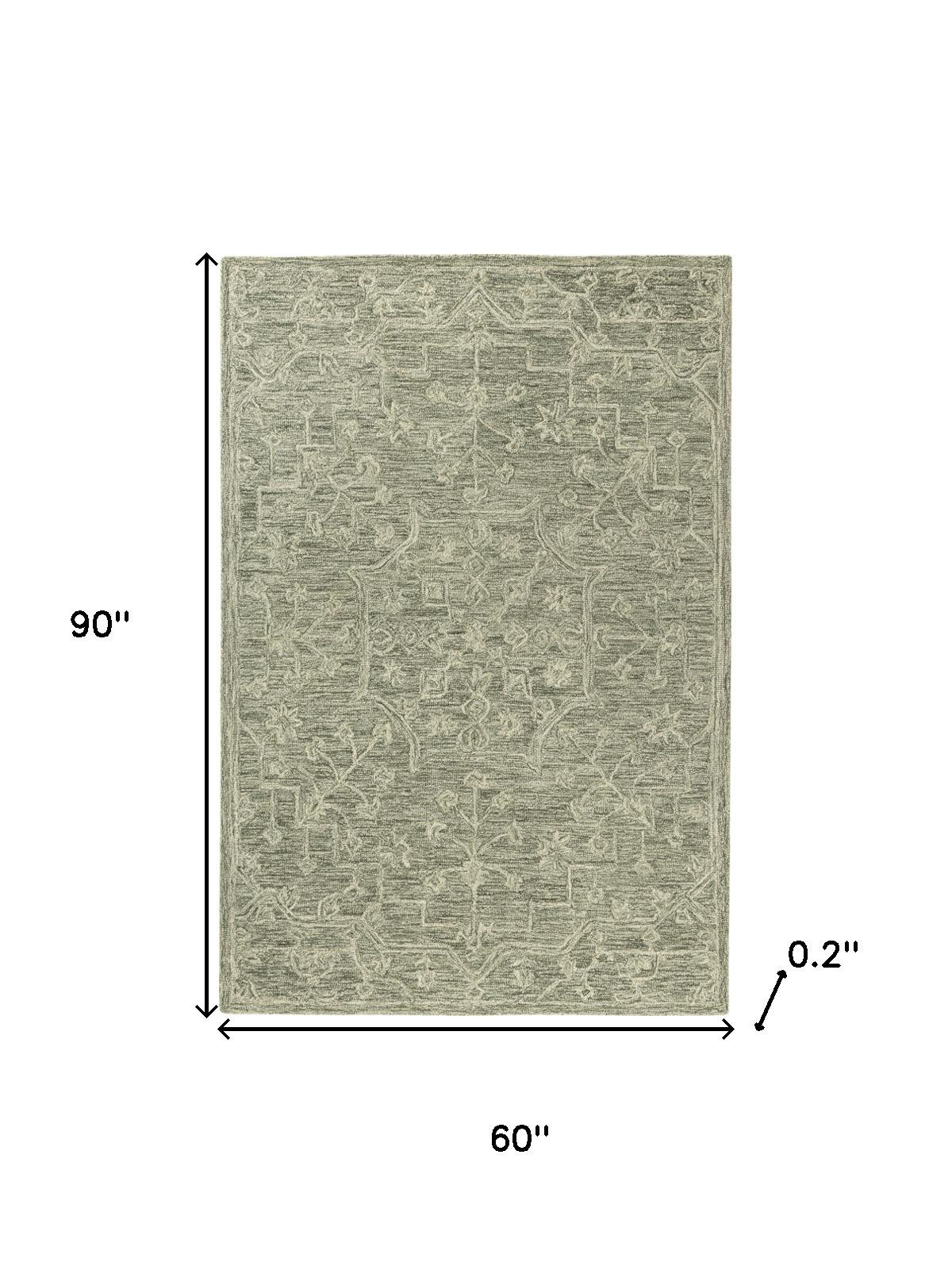 Set an inviting tone in your space with this 5-foot x 8-foot green and ivory wool floral hand tufted area rug. Crafted by skilled artisans, this hand tufted rug is genuine and unique. No two will be exactly alike. Rugs are a great way to showcase your style, hide imperfections, warm your home and reduce noise. This larger sized, transitional styled rug is ready to create a focal point or statement piece in your room. 90.00-inch h x 60.00-inch w x 0.20-inch d.