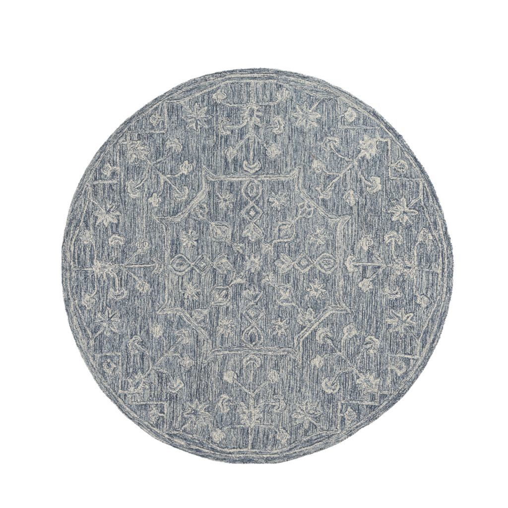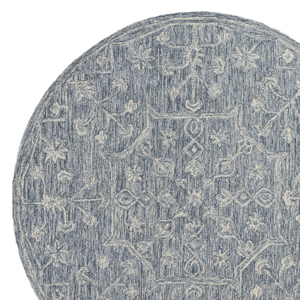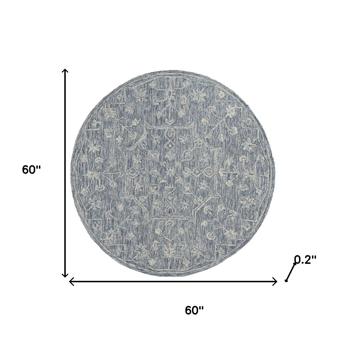 Add great coloration and comfortable texture to your space with this 5-foot blue and ivory wool floral hand tufted round rug. Crafted by skilled artisans, this hand tufted rug is genuine and unique. No two will be exactly alike. Rugs are a great way to showcase your style, hide imperfections, warm your home and reduce noise. This larger sized, transitional styled rug is ready to create a focal point or statement piece in your room. 60.00-inch h x 60.00-inch w x 0.20-inch d.