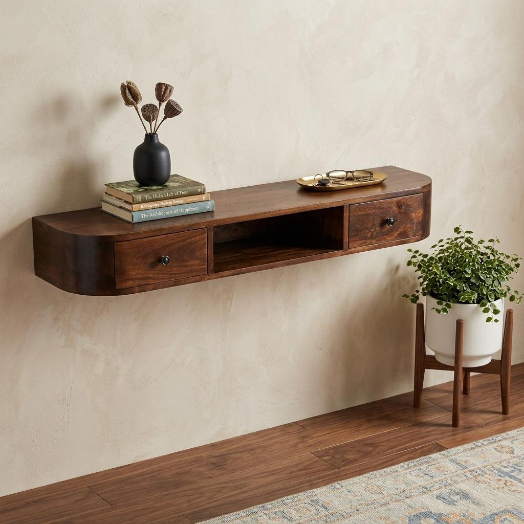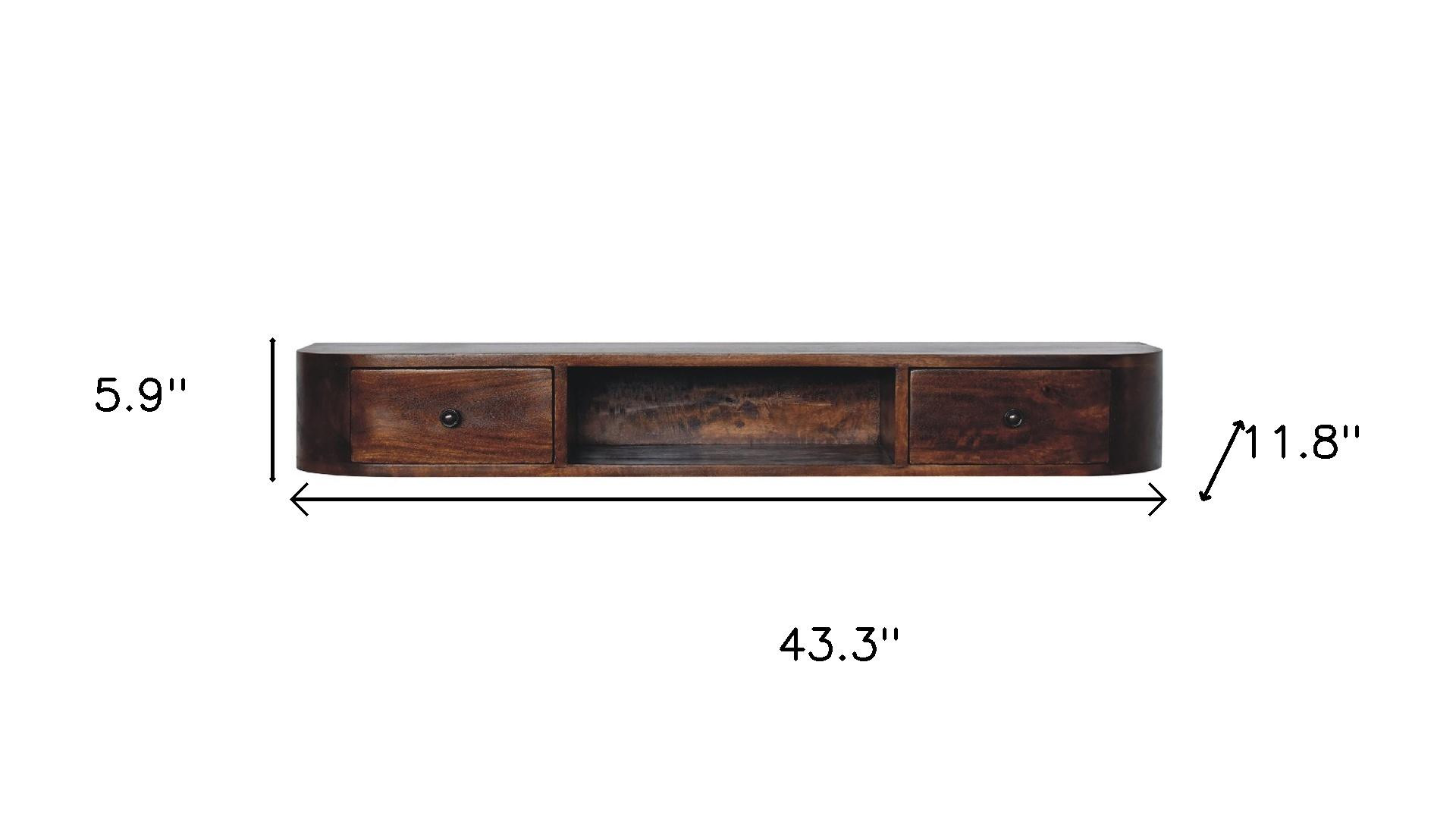 Transform your home with our elegant and versatile 43-inch brown solid wood solid floating console table with shelf and with two drawers. Don't miss out on the perfect finishing touch for your home. This rectangular table is ideal for up against the wall, can free stand in a room, or sit behind the sofa perfectly. The brown hardwood table surface makes this unit stand out with its high quality material and construction. The solid base is made of solid wood, the most strong and durable option available. Versatile in use, console tables can be used for a variety of purposes in a variety of rooms and settings. 5.90-inch h x 43.30-inch w x 11.80-inch d.