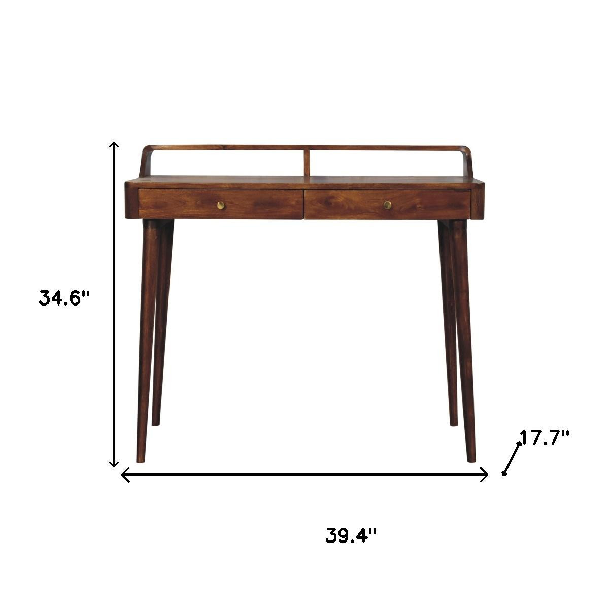 This 39-inch brown solid wood solid console table with shelf and with two drawers can provide a variety of practical functions such as providing extra storage space, serving as a display area for decorative items or acting as a catch-all for keys, mail, and other small items. This versatile table is a classic rectangular shape, which will easily fit into most any space in your home. This unit has a brown genuuine hardwood tabletop. The solid of this unit is crafted with solid wood, leaving you with a console table that is of the finest quality and materials. Ideal for living rooms, bedrooms, home offices, and lounge areas, this console table is not only good looking but multi-functional and practical addition to your space. 34.60-inch h x 39.40-inch w x 17.70-inch d.