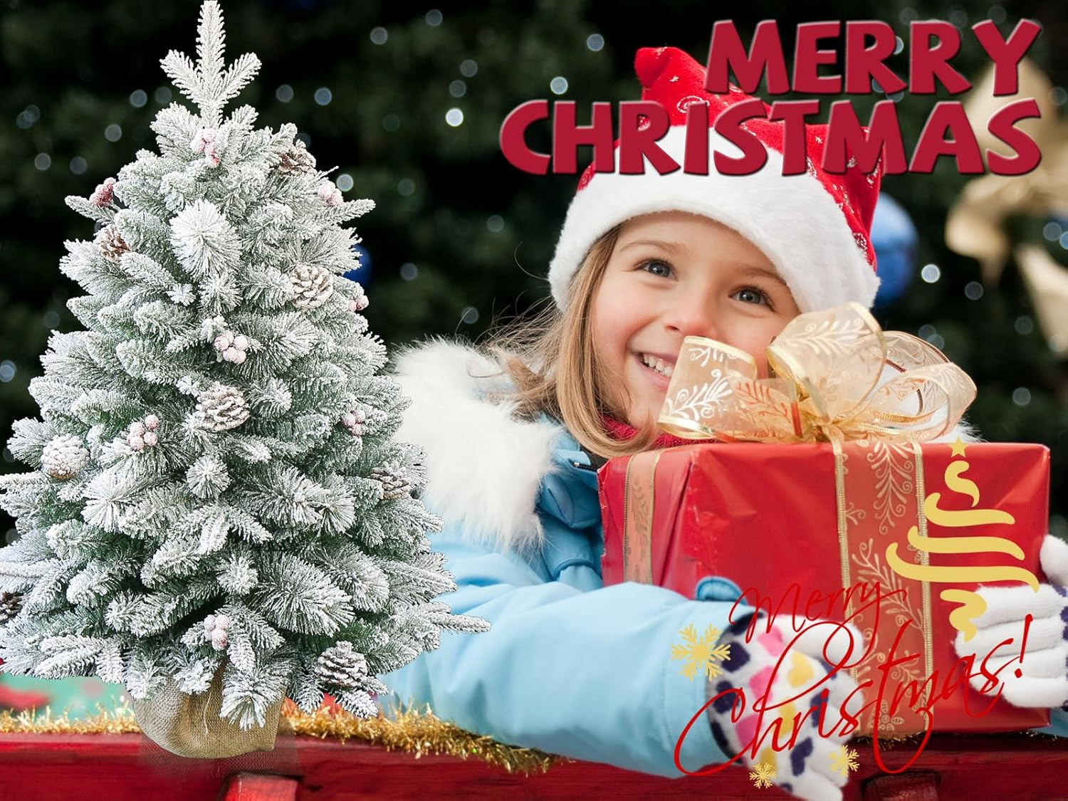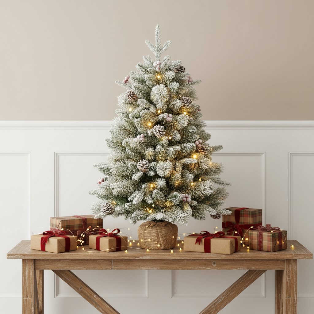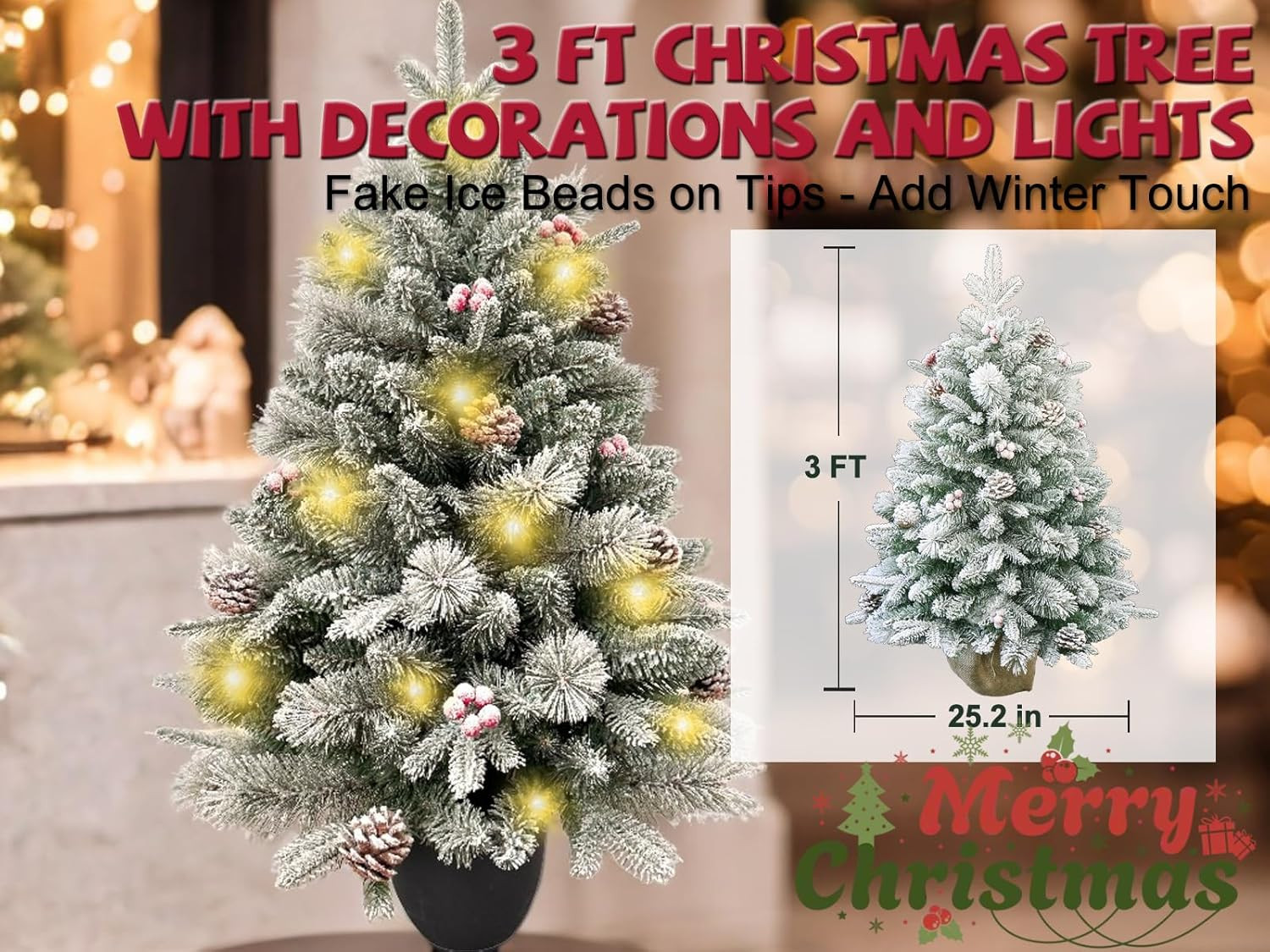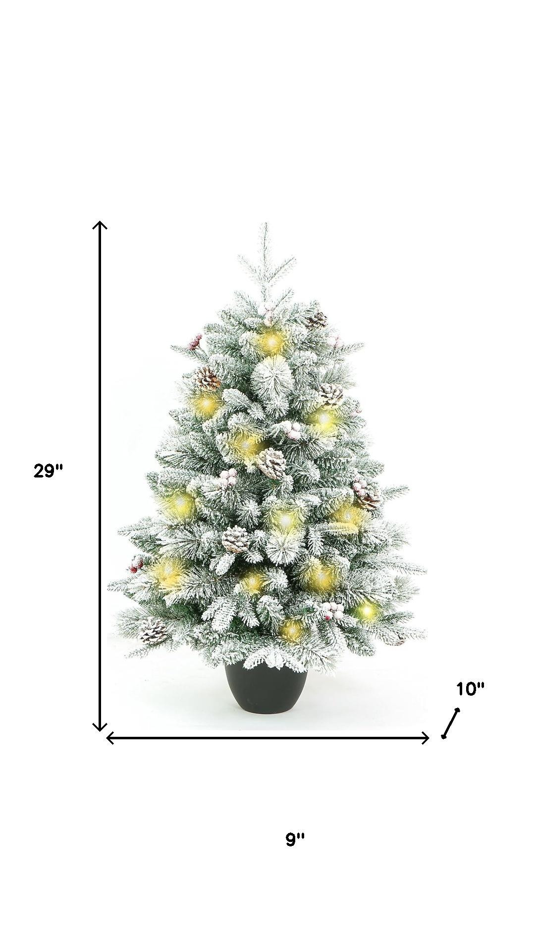 Add some festive spirit to your space with this 3-foot full flocked pine Christmas tree with decorations. This artificial tree features lush needles, pinecones, and berries that enhance its realistic and rustic appearance. Designed with a regular full shape that brings a balanced look to your holiday decor. The faux snow flocked branches add a charming touch, reminiscent of snowy winter days. With a sturdy potted stand included, you can easily set it up in your desired location. This cute tabletop tree also comes with burlap that you wrap the base in to create a more rustic look. 29.00-inch h x 9.00-inch w x 10.00-inch d.