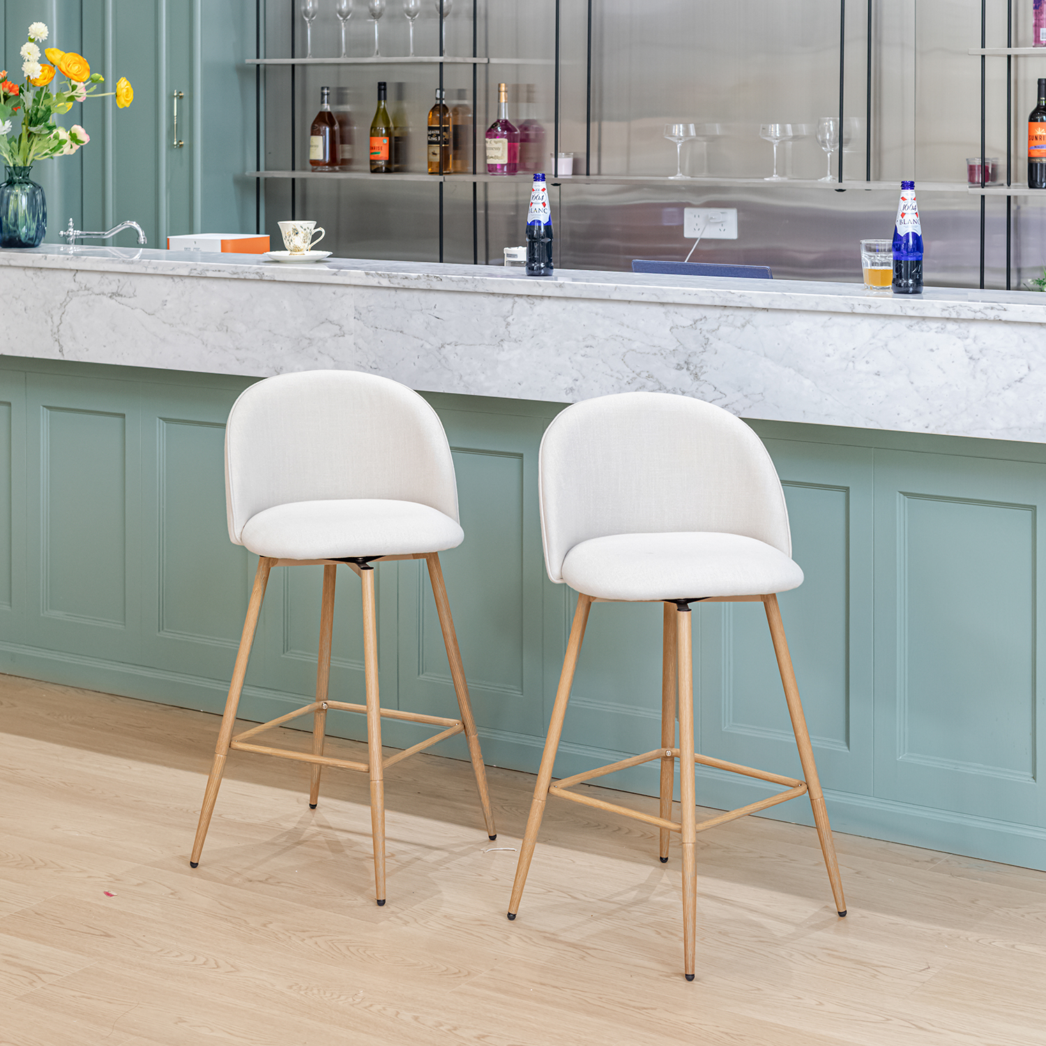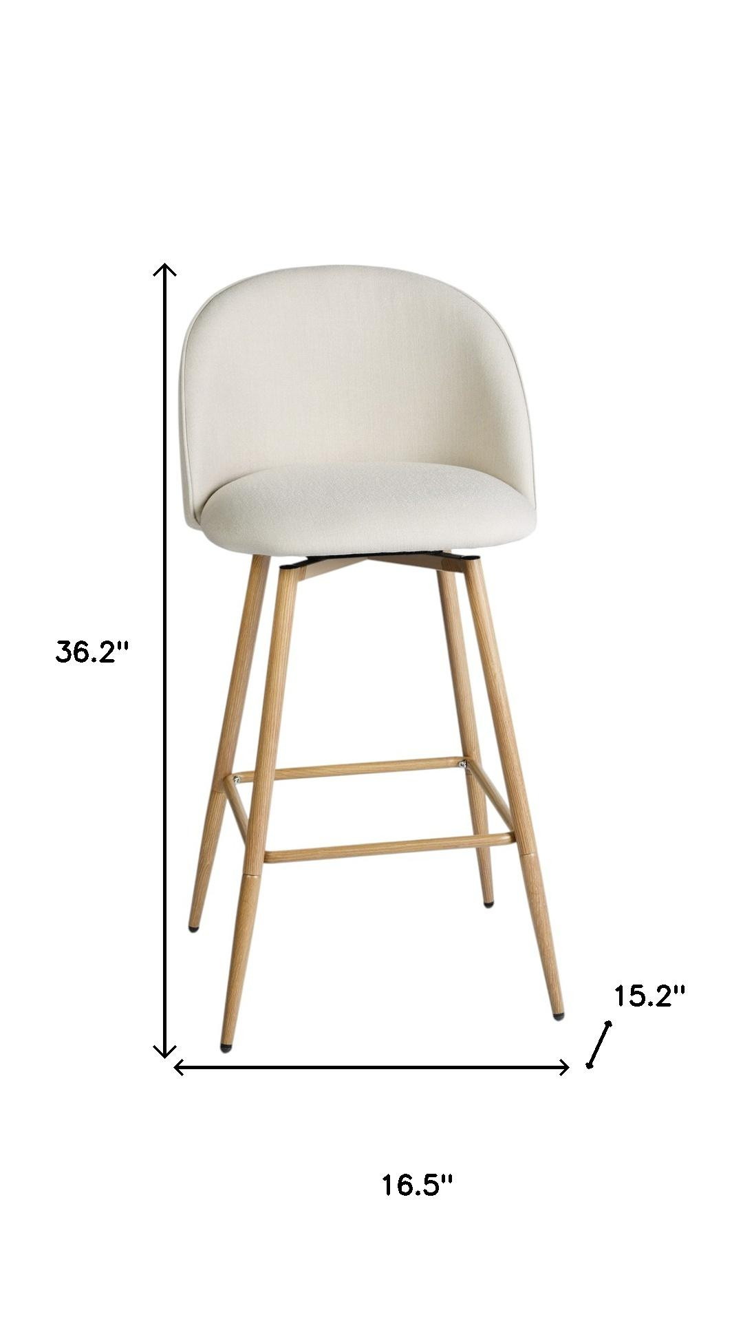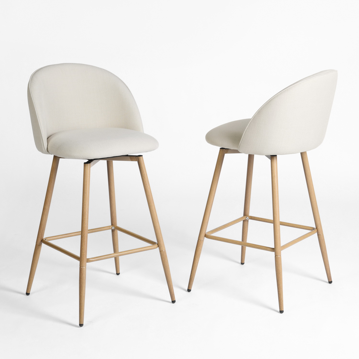 Comfortable enough to sit in for awhile, this set of two 27-inch beige and oak fabric and metal counter height swivel bar chairs will transcend the look of your room. Quality construction from metal with an oak brown faux wood finish combines with soft and durable polyester fabric to give these stools a fresh, neutral, and updated look. A slightly curved back and bucket shaped seat design makes these versatile bar chairs both comfortable and fashionable. 36.20-inch h x 16.50-inch w x 15.20-inch d.
