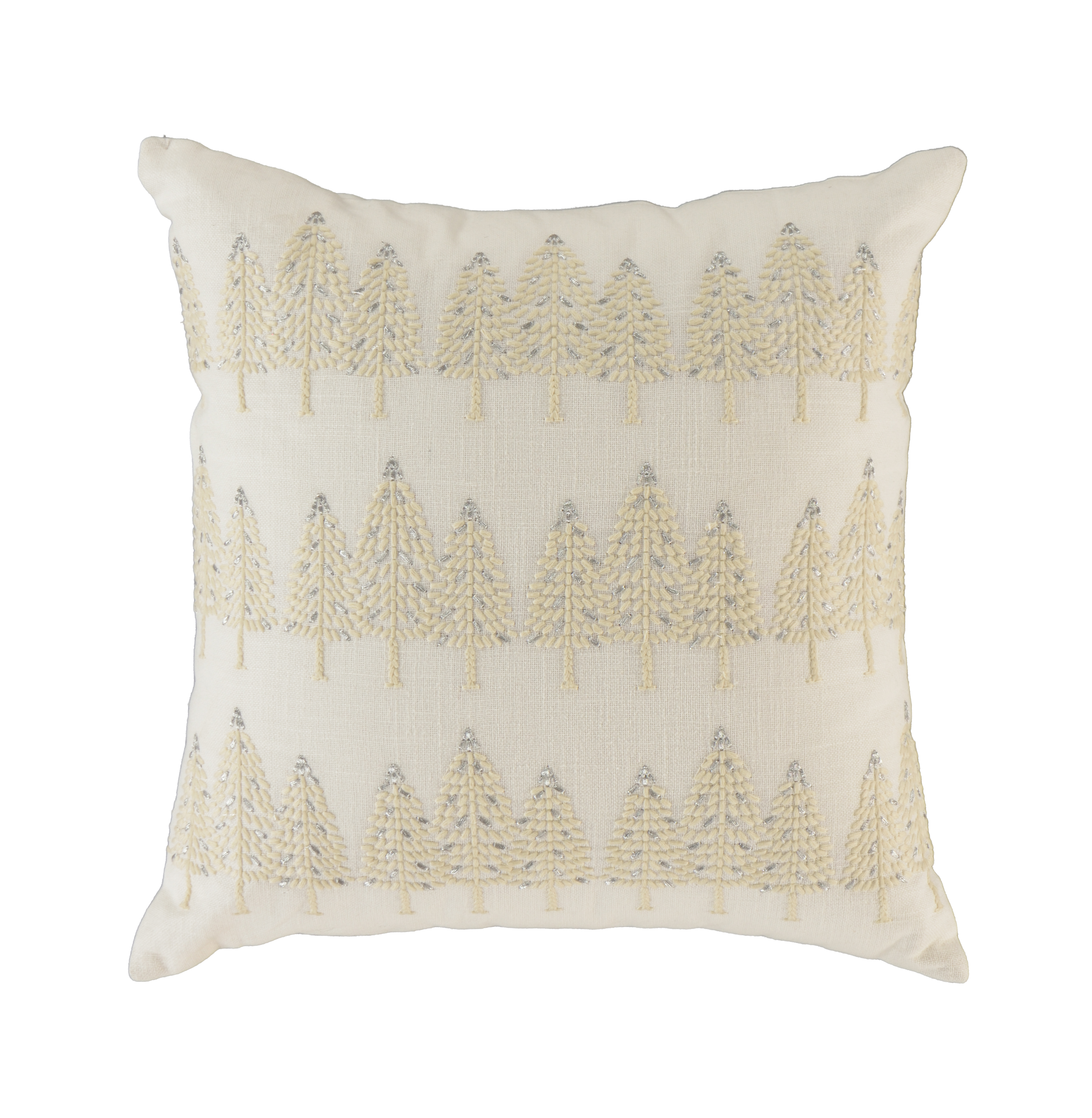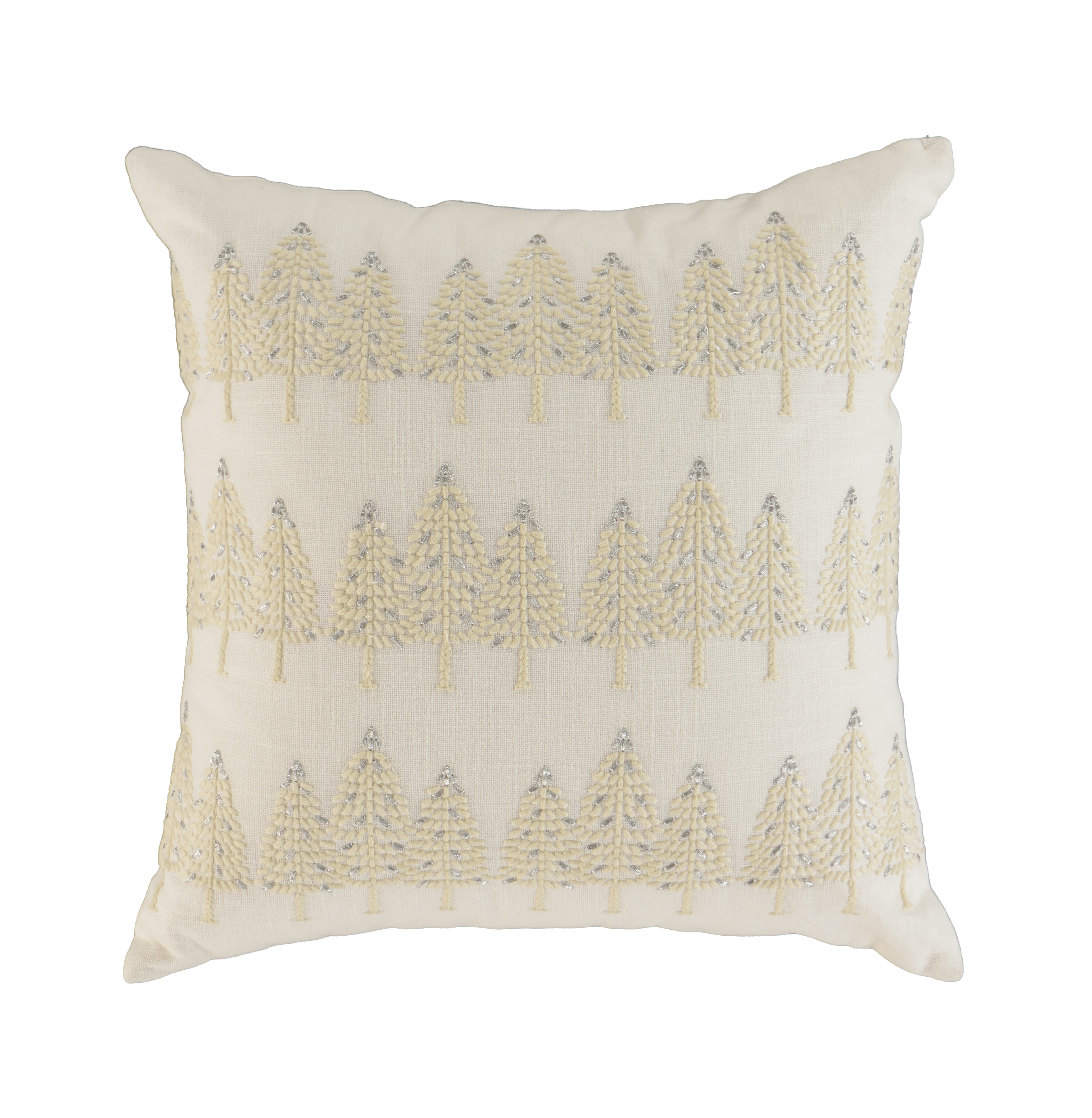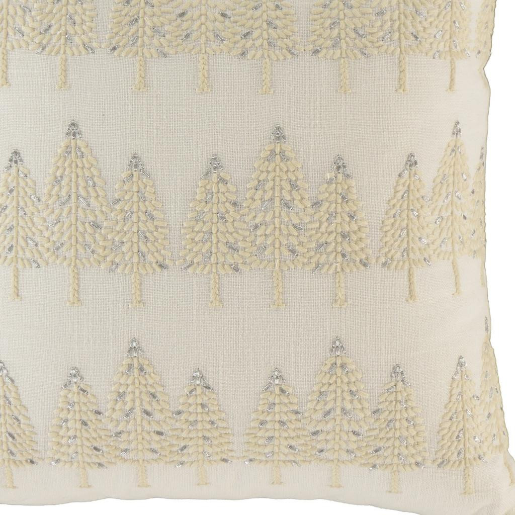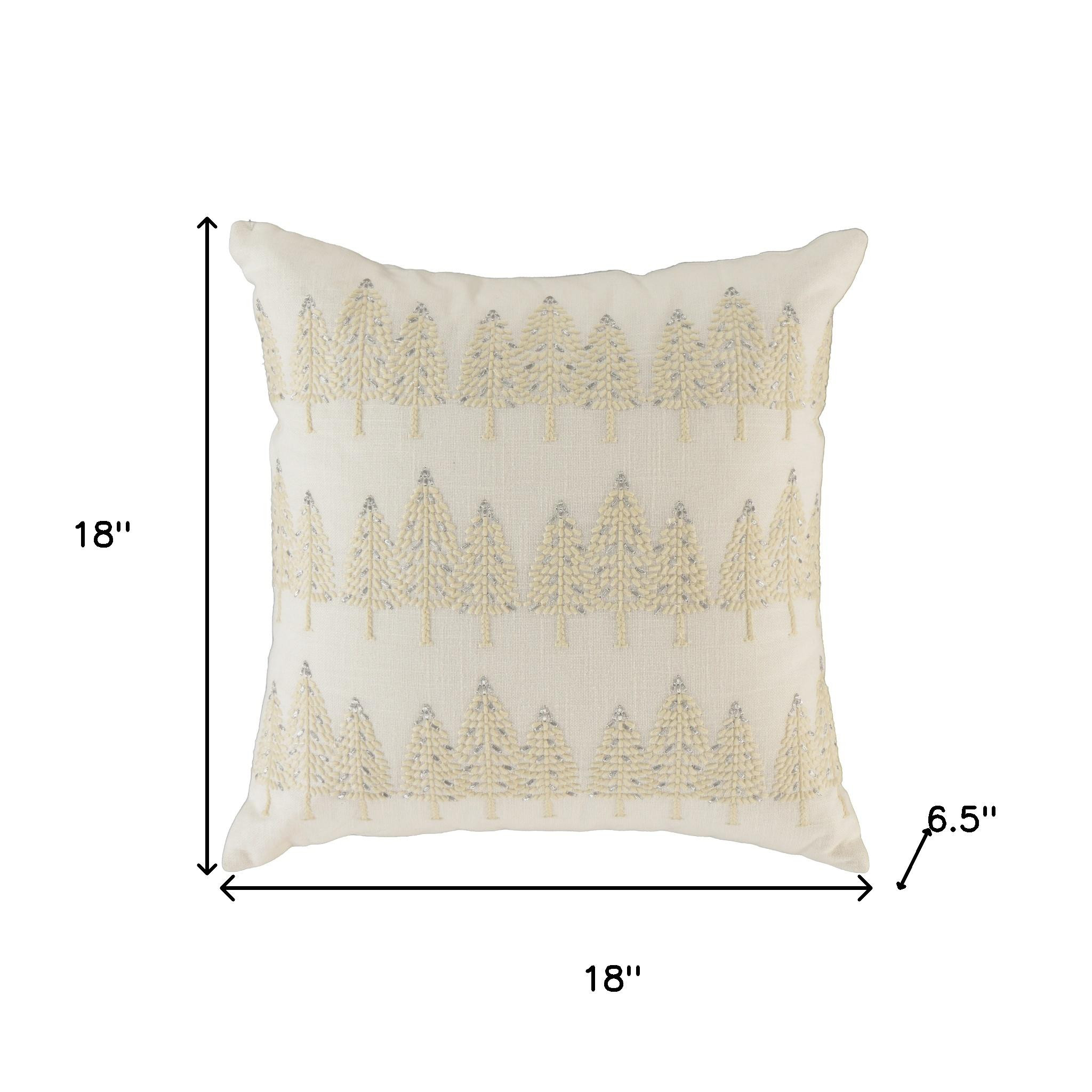 This 18-inch ivory and silver cotton Christmas trees throw pillow with embroidery is a great way to celebrate and decorate for the holidays. Features beautifully hand-embroidered decorative Christmas trees with metallic threads running through them that add some high end and hand-crafted textural designer touches. This soft polyfill filled pillow not only is decorative but made to be comfy and cozy all day long. For anyone that loves to decorate or accent their space with color and texture. A great decorative accessory to add color and dimension to your favorite chair, accent your sofa, or to use as part of your bed ensemble. 18.00-inch h x 18.00-inch w x 6.50-inch d.