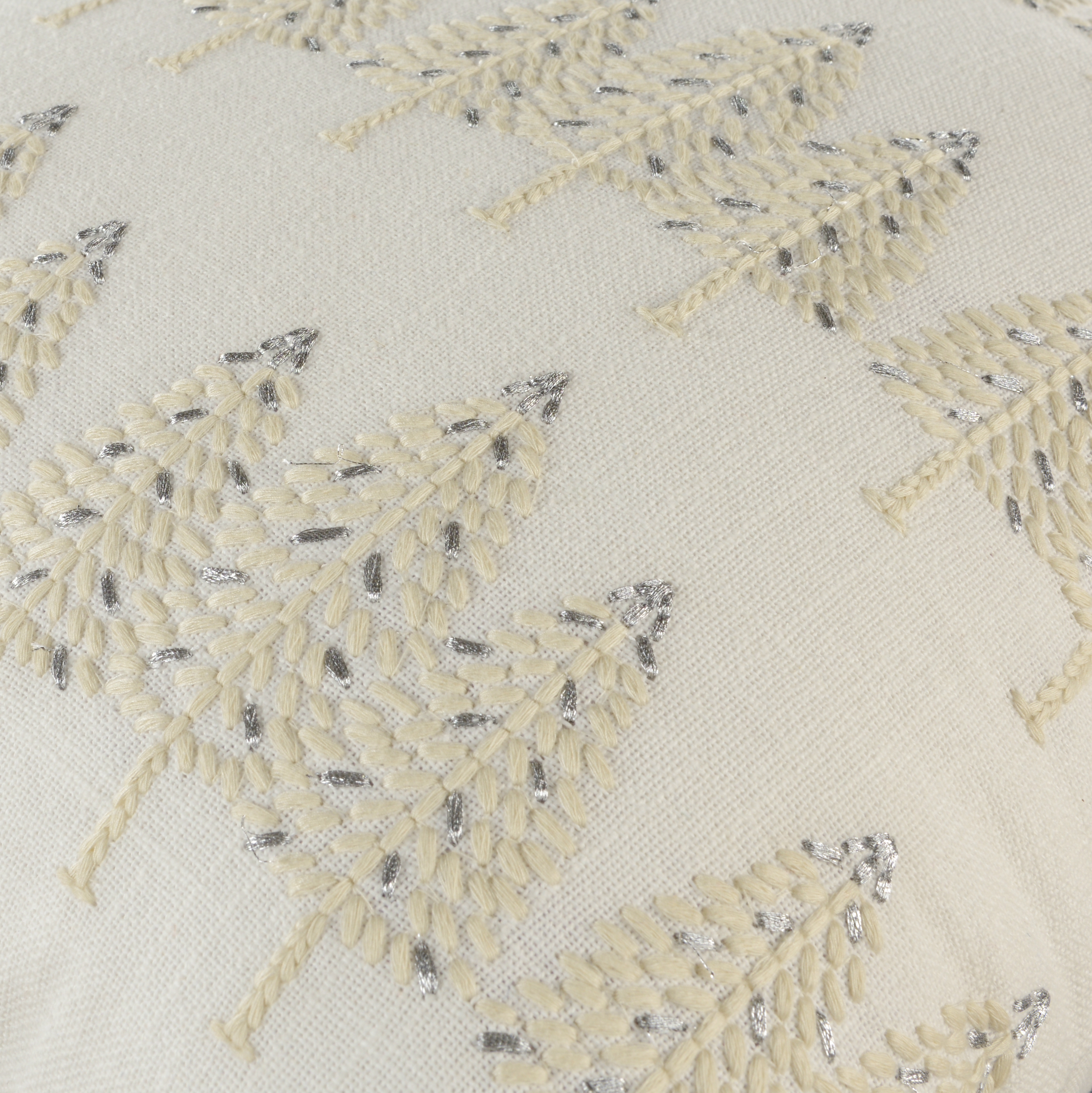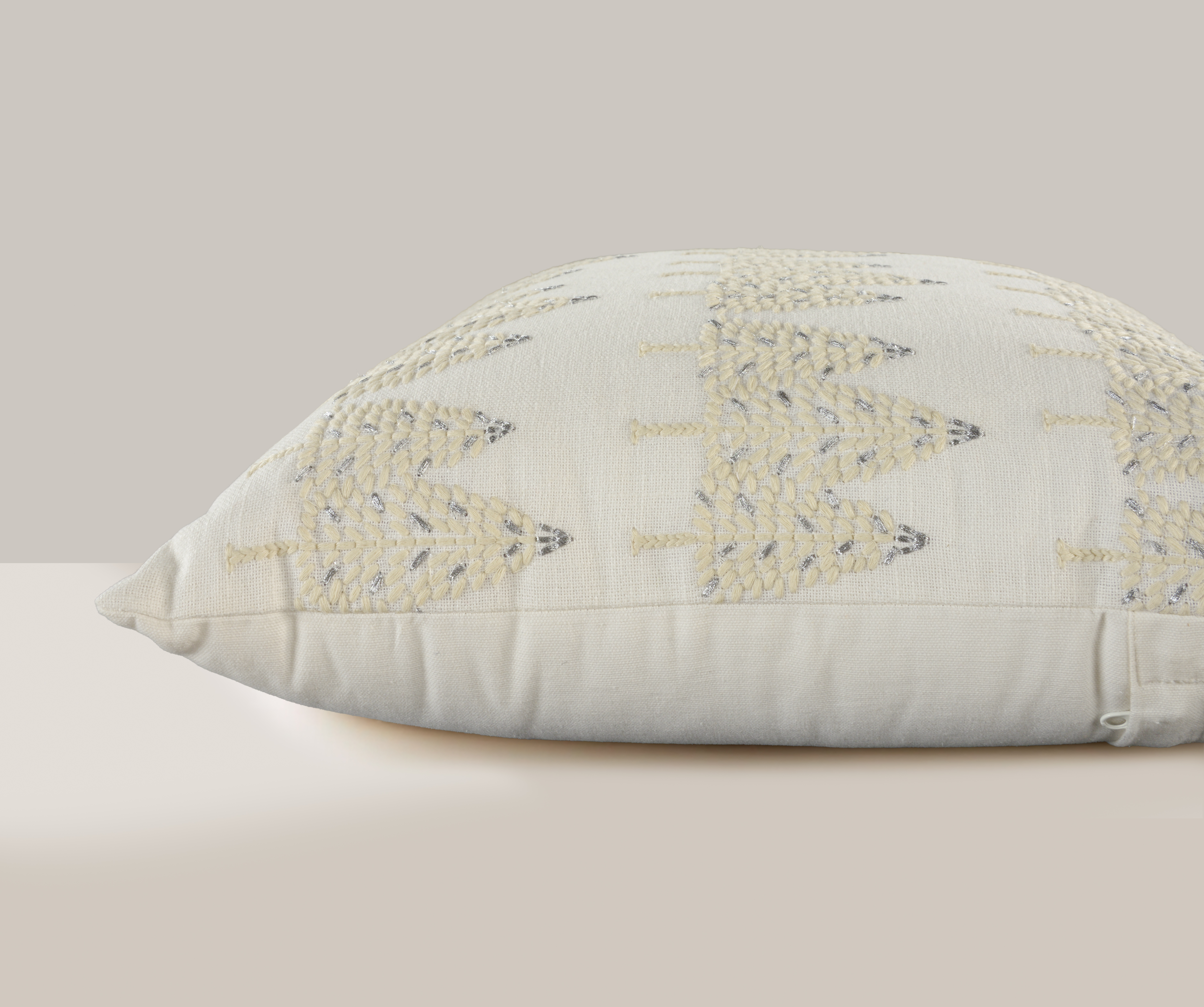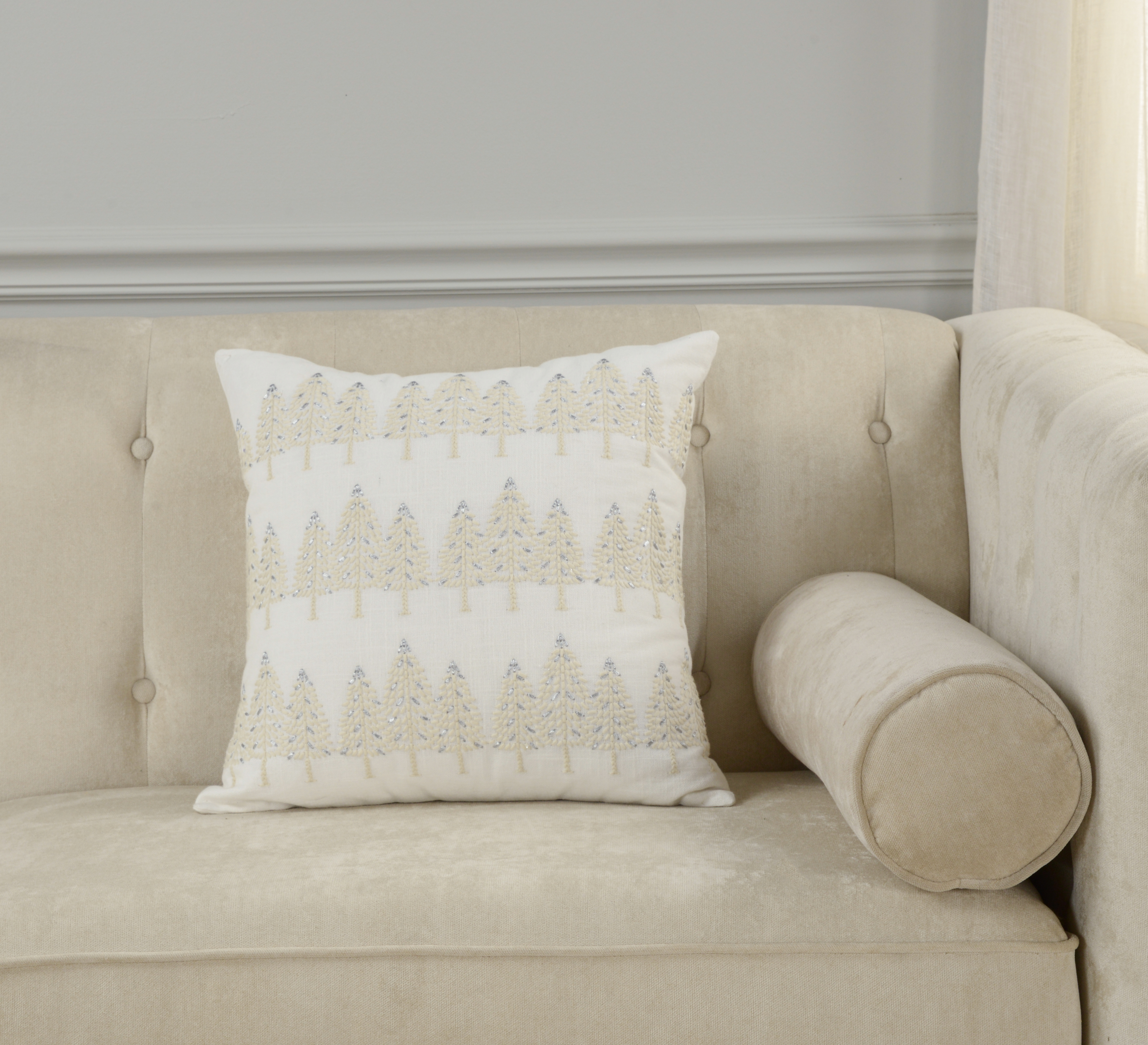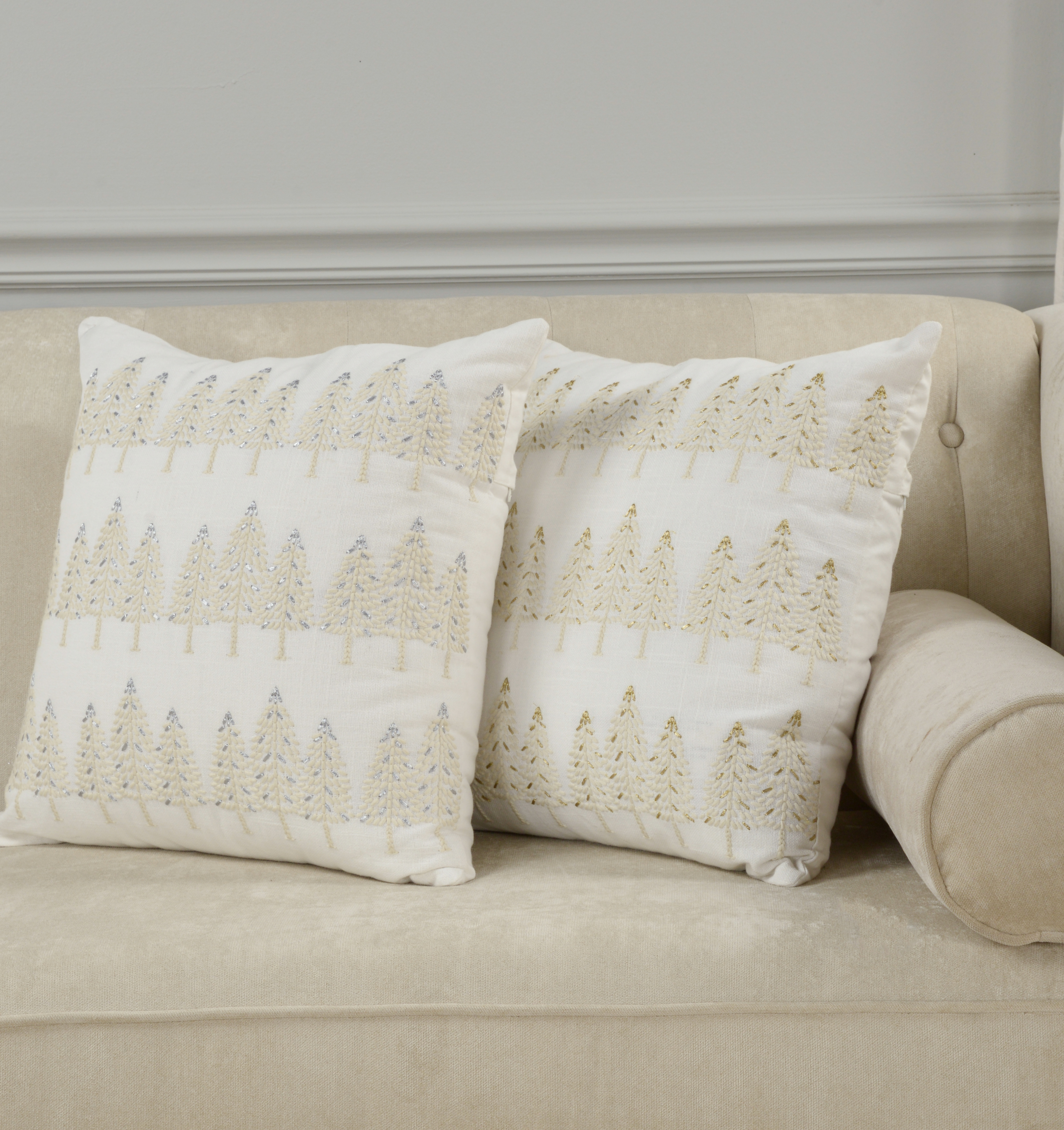 This 18-inch ivory and silver cotton Christmas trees throw pillow with embroidery is a great way to celebrate and decorate for the holidays. Features beautifully hand-embroidered decorative Christmas trees with metallic threads running through them that add some high end and hand-crafted textural designer touches. This soft polyfill filled pillow not only is decorative but made to be comfy and cozy all day long. For anyone that loves to decorate or accent their space with color and texture. A great decorative accessory to add color and dimension to your favorite chair, accent your sofa, or to use as part of your bed ensemble. 18.00-inch h x 18.00-inch w x 6.50-inch d.
