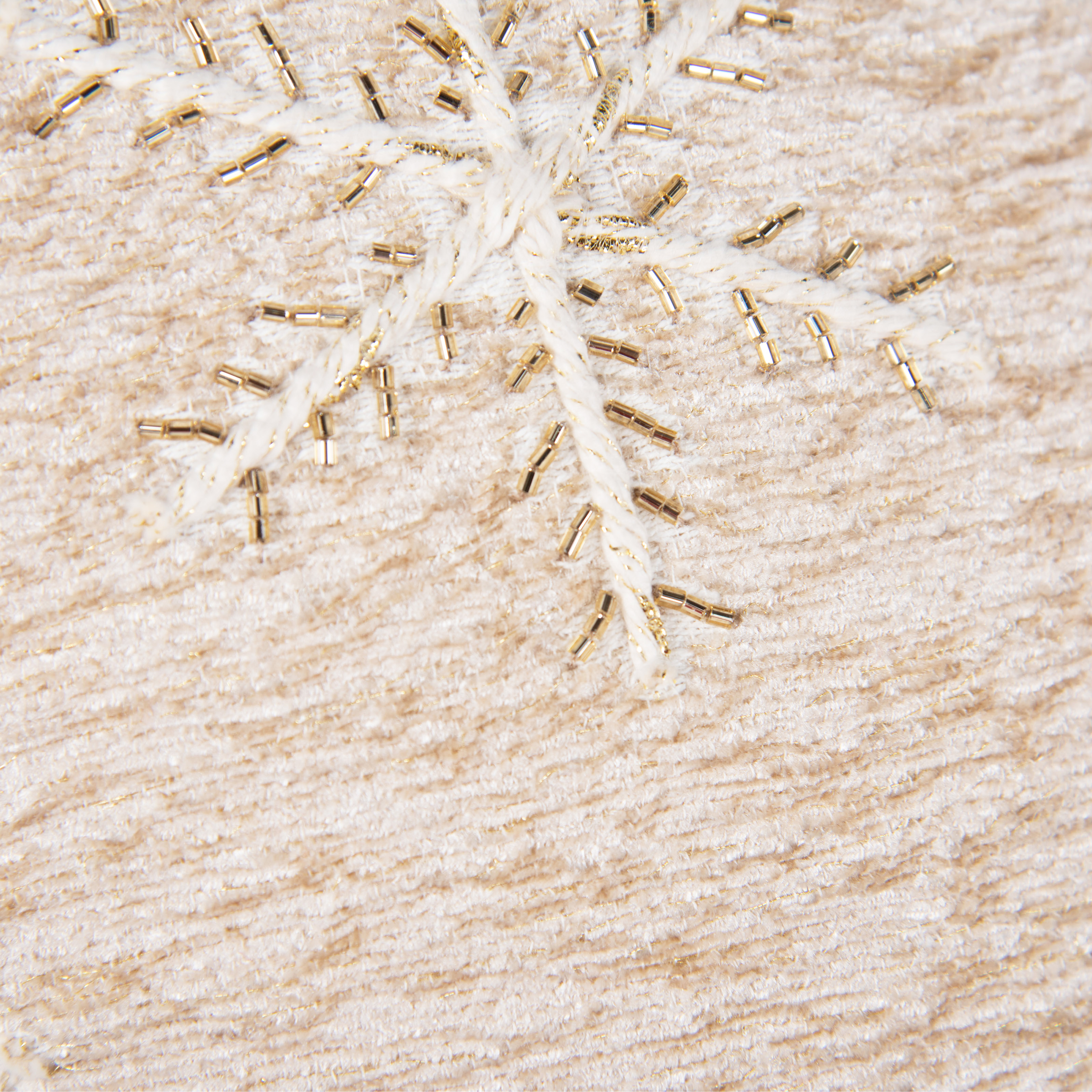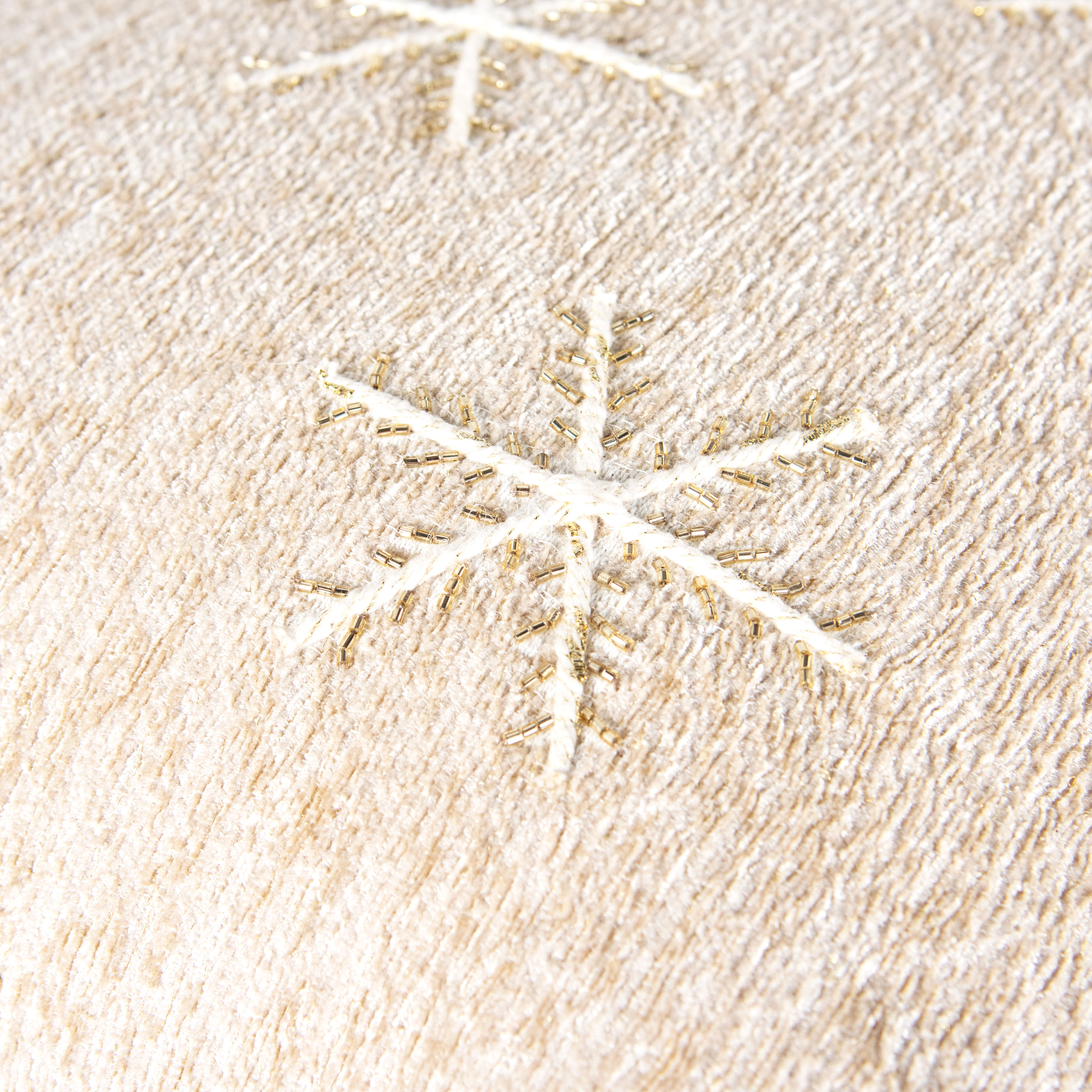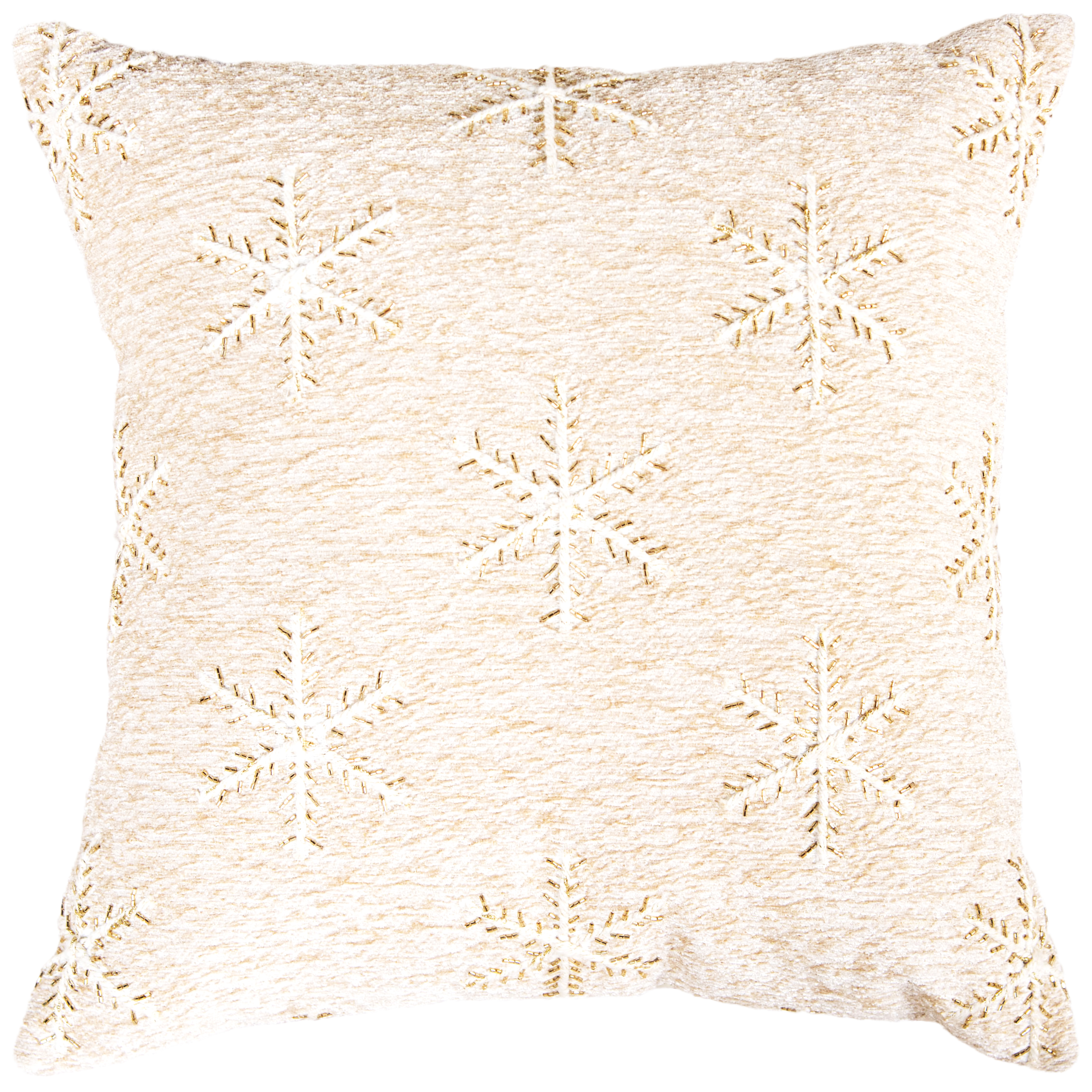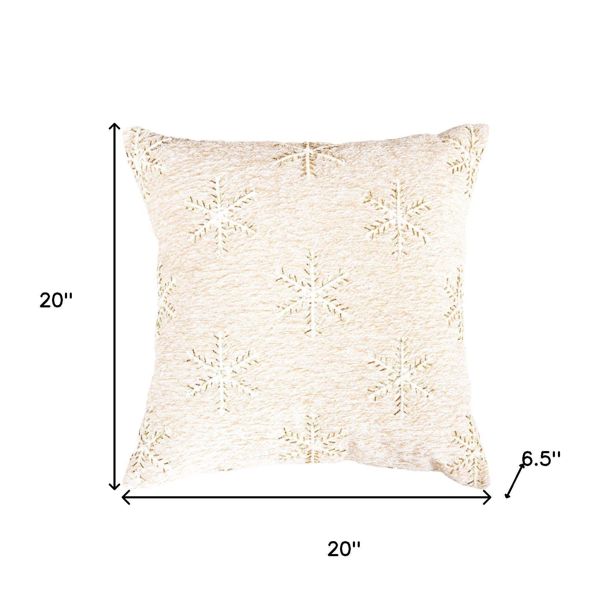 Add some holiday cheer to your space with this 20-inch natural and gold snowflakes throw pillow. Features beautifully hand-embroidered decorative Christmas trees with metallic threads running through them that add some high end and hand-crafted textural designer touches. This soft polyfill filled pillow not only is decorative but made to be comfy and cozy all day long. For anyone that loves to decorate or accent their space with color and texture. A great decorative accessory to add color and dimension to your favorite chair, accent your sofa, or to use as part of your bed ensemble. 20.00-inch h x 20.00-inch w x 6.50-inch d.