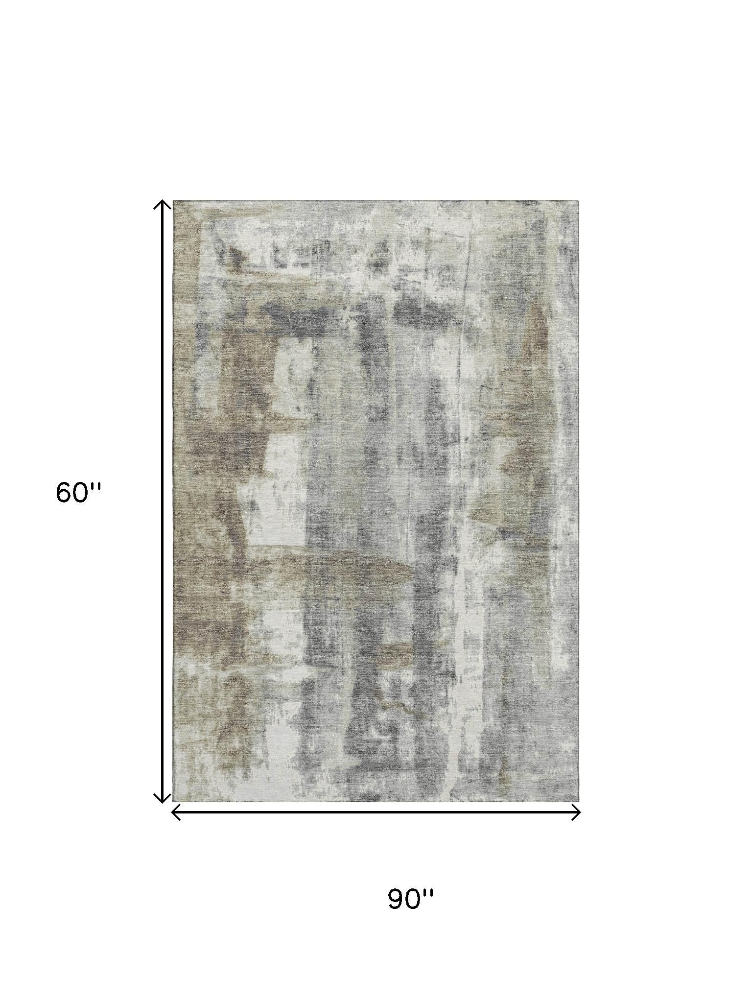Add great coloration and comfortable texture to your space with this 5-foot x 8-foot beige gray and ivory abstract washable area rug with uv protection. Ideal for spaces with kids and pets, this rug is stain resistant to help repel dirt and spilled liquids. Built to last, this rug crafted from polyester fibers is known for its durability and long lasting appeal. Rugs are a great way to showcase your style, hide imperfections, warm your home and reduce noise. This larger sized, transitional styled rug is ready to create a focal point or statement piece in your room. 60.00-inch h x 90.00-inch w x 0.39-inch d.