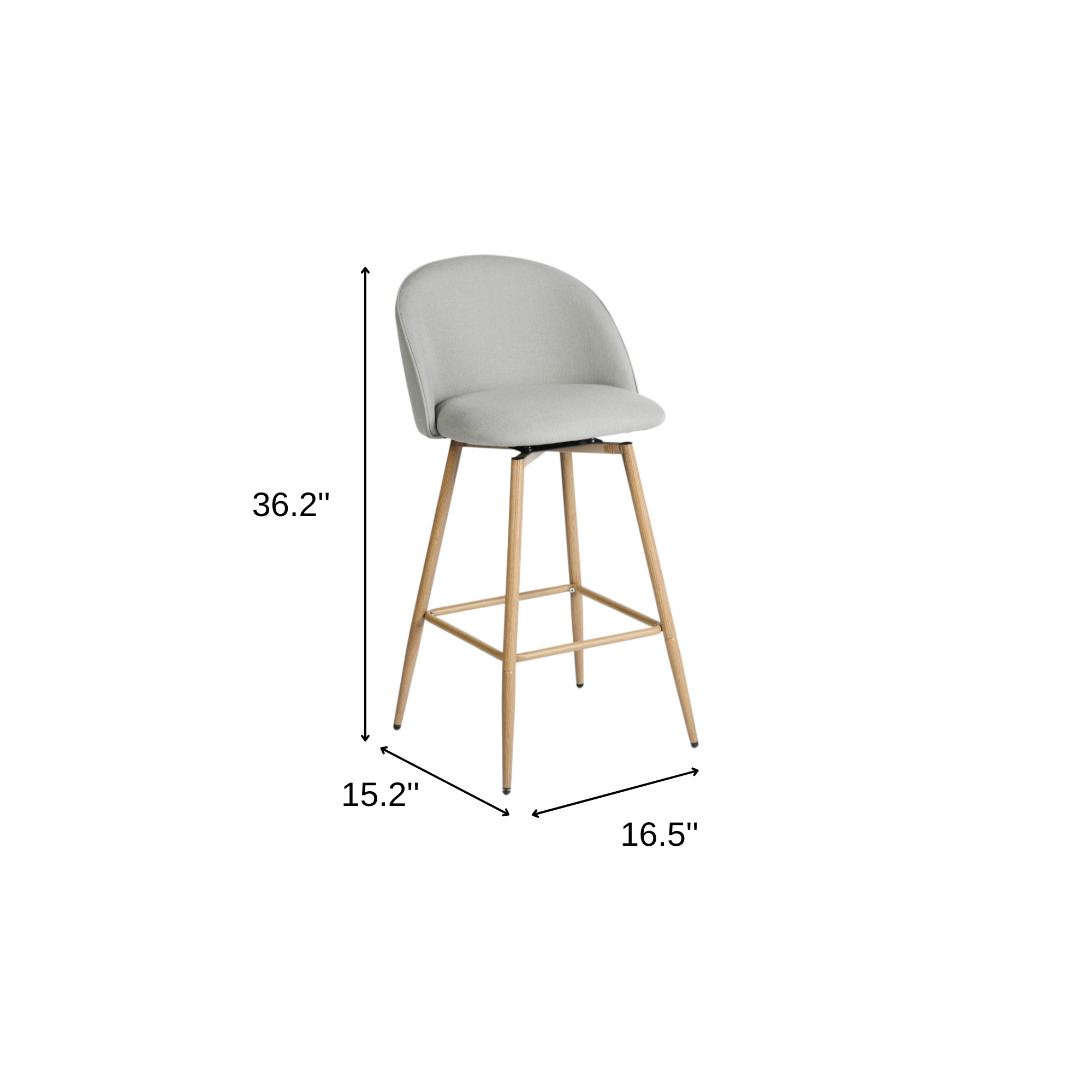 Comfortable enough to sit in for awhile, this set of two 27-inch gray and oak fabric and metal low back counter height swivel bar chairs will transcend the look of your room. Quality construction from metal with an oak brown faux wood finish combines with soft and durable polyester fabric to give these stools a fresh, neutral, and updated look. A slightly curved back and bucket shaped seat design makes these versatile bar chairs both comfortable and fashionable. 36.20-inch h x 16.50-inch w x 15.20-inch d.