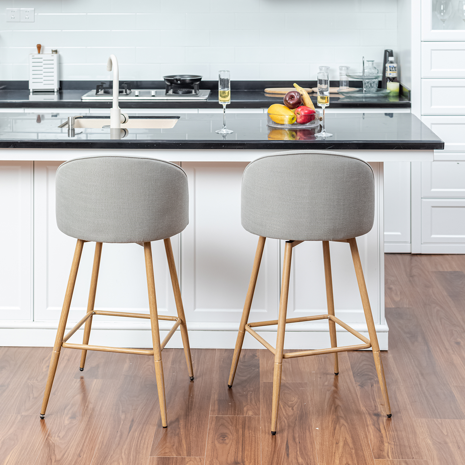 grey counter stool, swivel counter stool, fabric bar stool, oak leg stool, modern counter seating, kitchen counter stool |