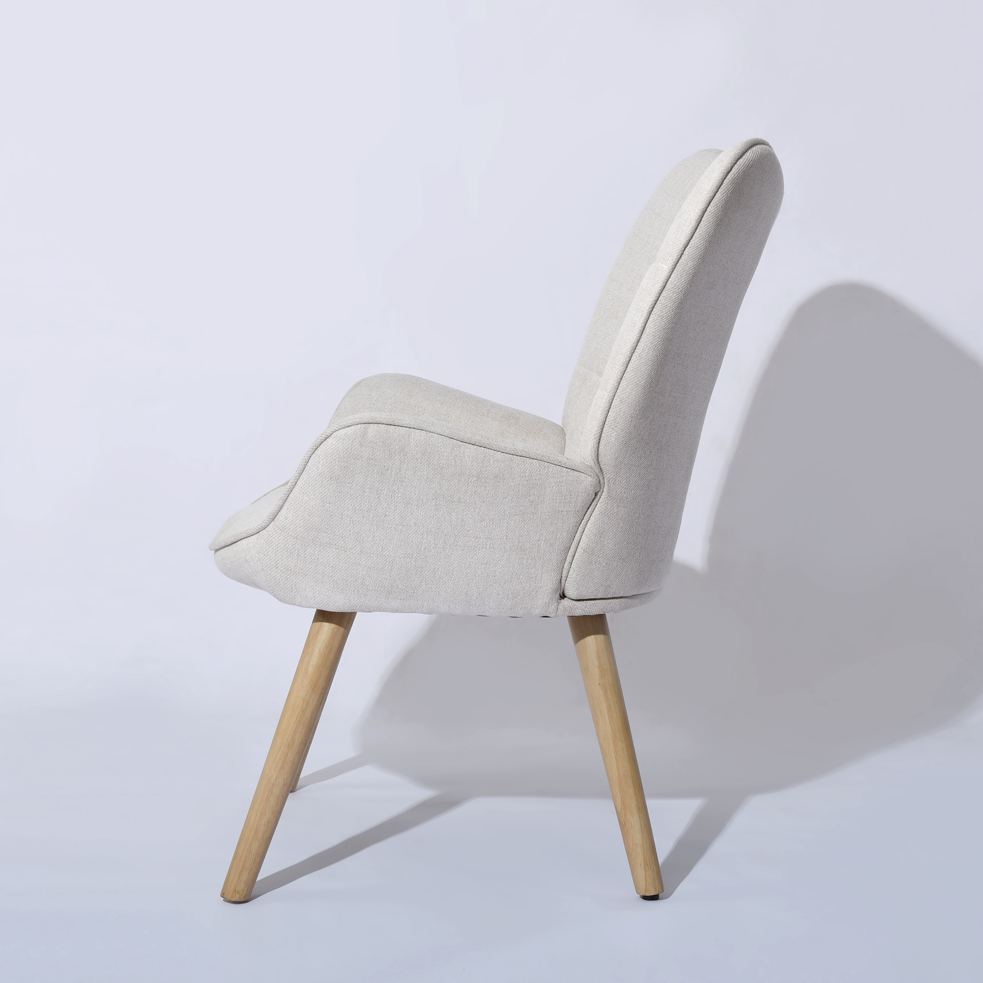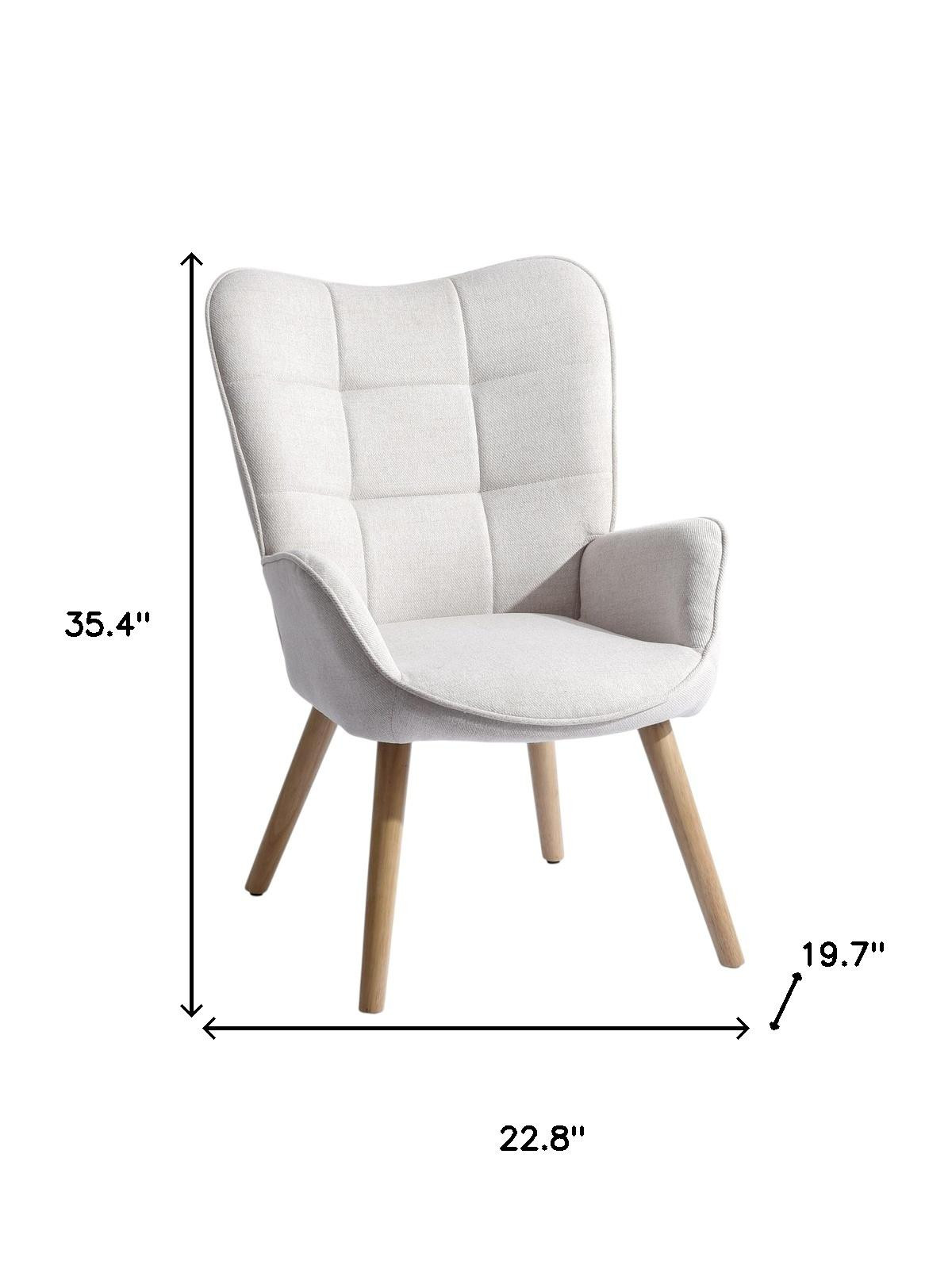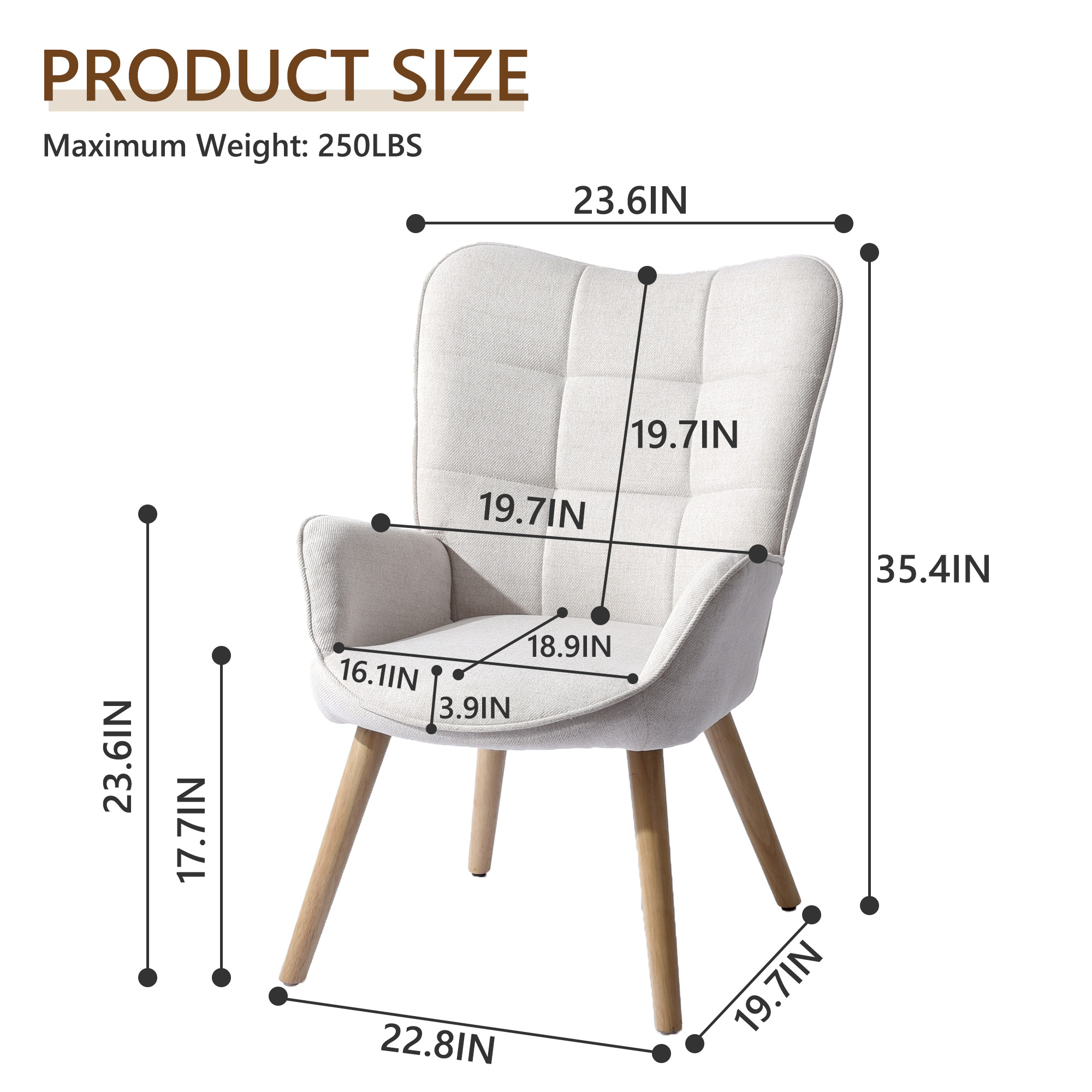 Stylish, elegant and fully functional, the 23-inch beige and natural tufted chenille and solid wood wingback chair adds a touch of panache to any set up. This versatile solid color beige wingback chair is masterfully upholstered in durable chenille with button tufted stitching. The high quality solid wood frame and legs are a natural color that creates a harmonious look with the neutral beige upholstery. 35.40-inch h x 22.80-inch w x 19.70-inch d.
