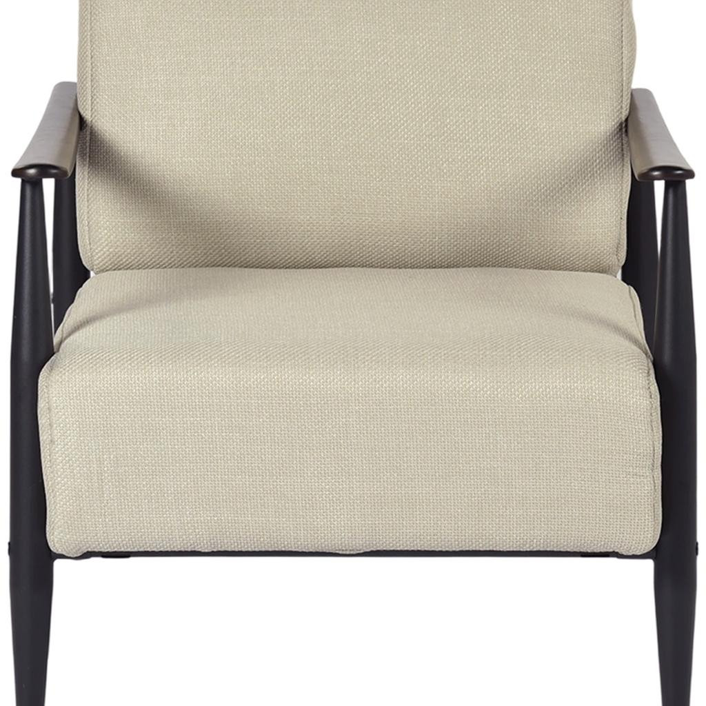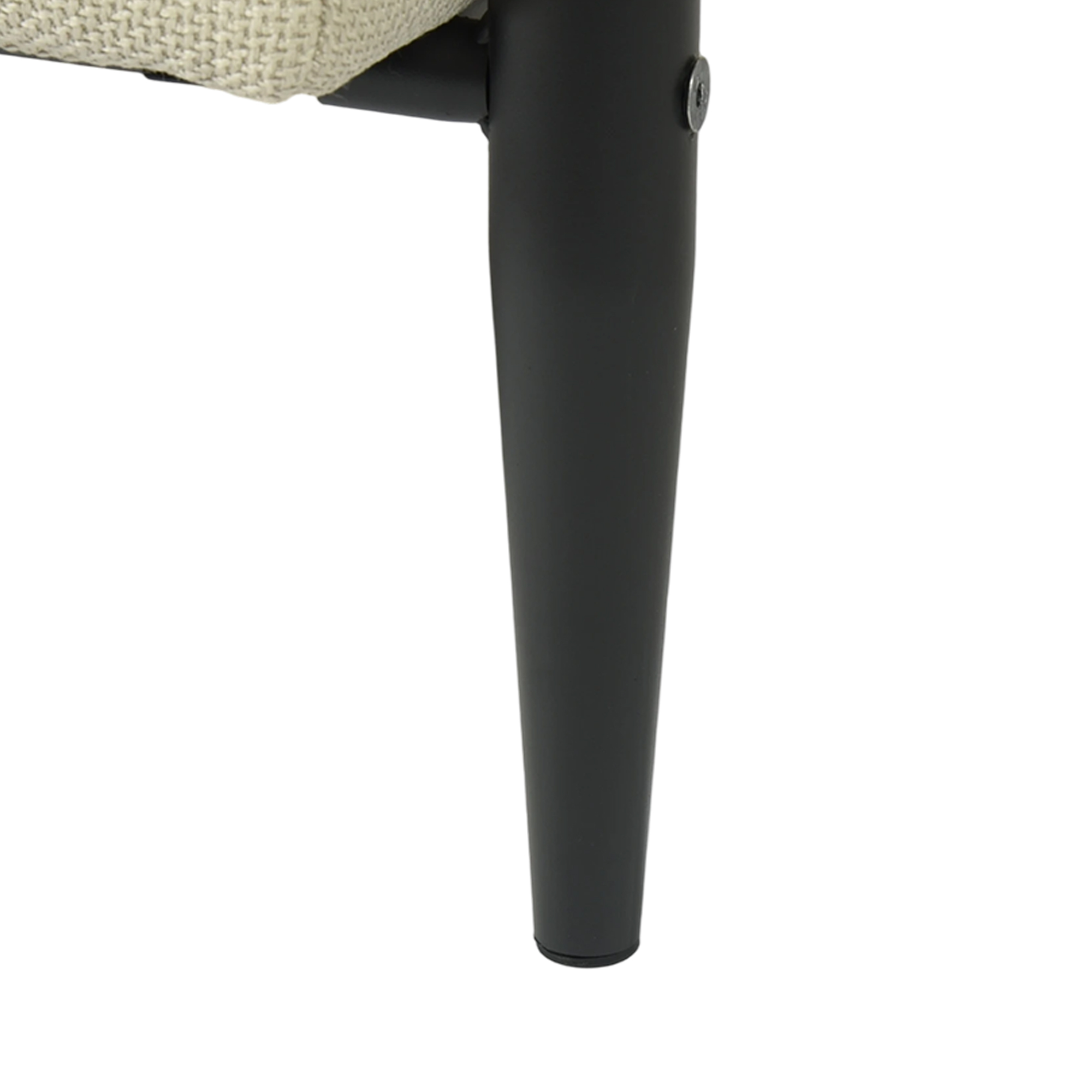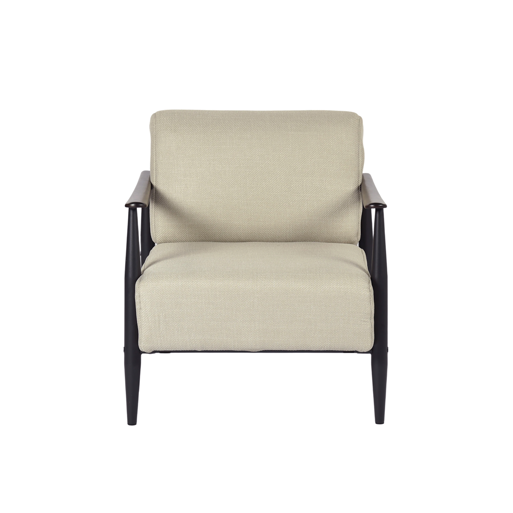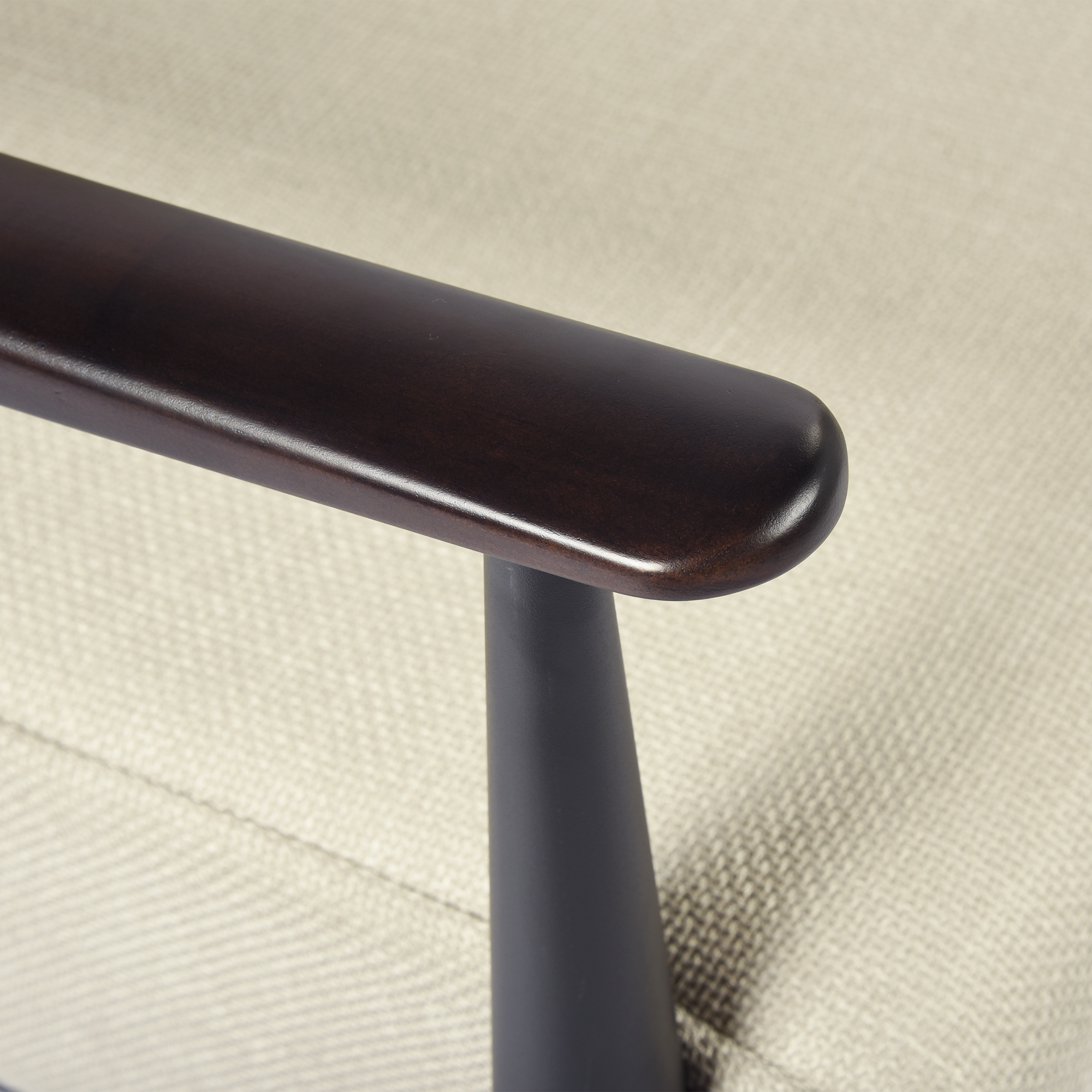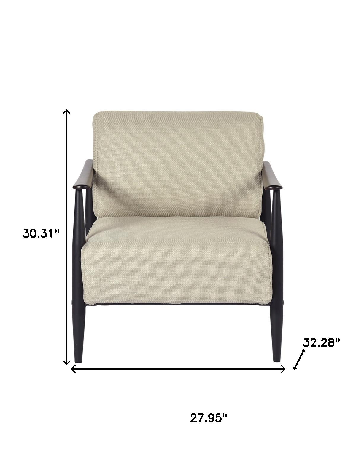 A mix of form and function, this 28-inch beige and black upholstered cushion and solid wood arm chair will bring a good looking and usable accent to your space. Built to last, this accent chair gives a mid-century modern vibe with its textured beige faux linen polyester upholstered cushioning and solid wood legs and arms. The neutral coloration and chic style make this chair not only good looking but comfortable to read a book, watch TV, or relax with your family and friends. 30.31-inch h x 27.95-inch w x 32.28-inch d.
