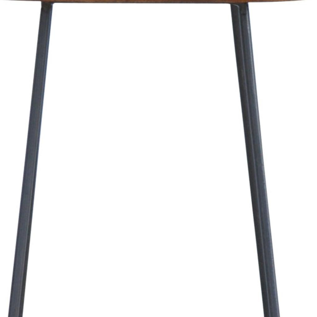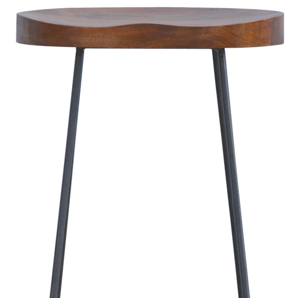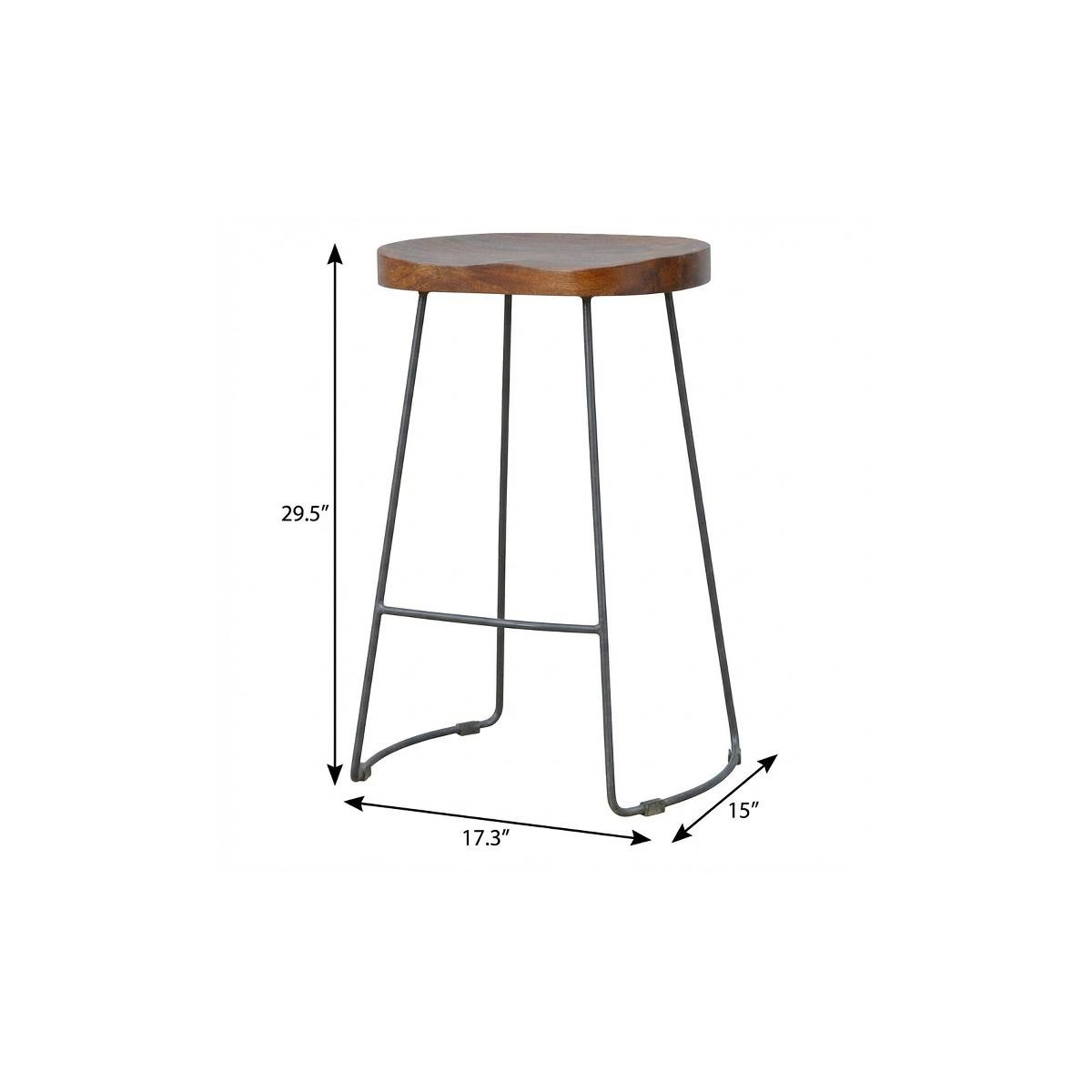 Comfortable enough to sit in for awhile, this 30-inch brown and black solid wood and iron bar height bar chair will transcend the look of your room. The unique saddle seat design provides extra comfort and support, making it an ideal choice for gatherings or casual dining. Handcrafted with precision, this modern bar chair features a striking combination of solid wood and a durable iron frame, ensuring both style and stability. Its 29.5-inch seat height is perfect for standard bar counters. 29.50-inch h x 17.30-inch w x 15.00-inch d.