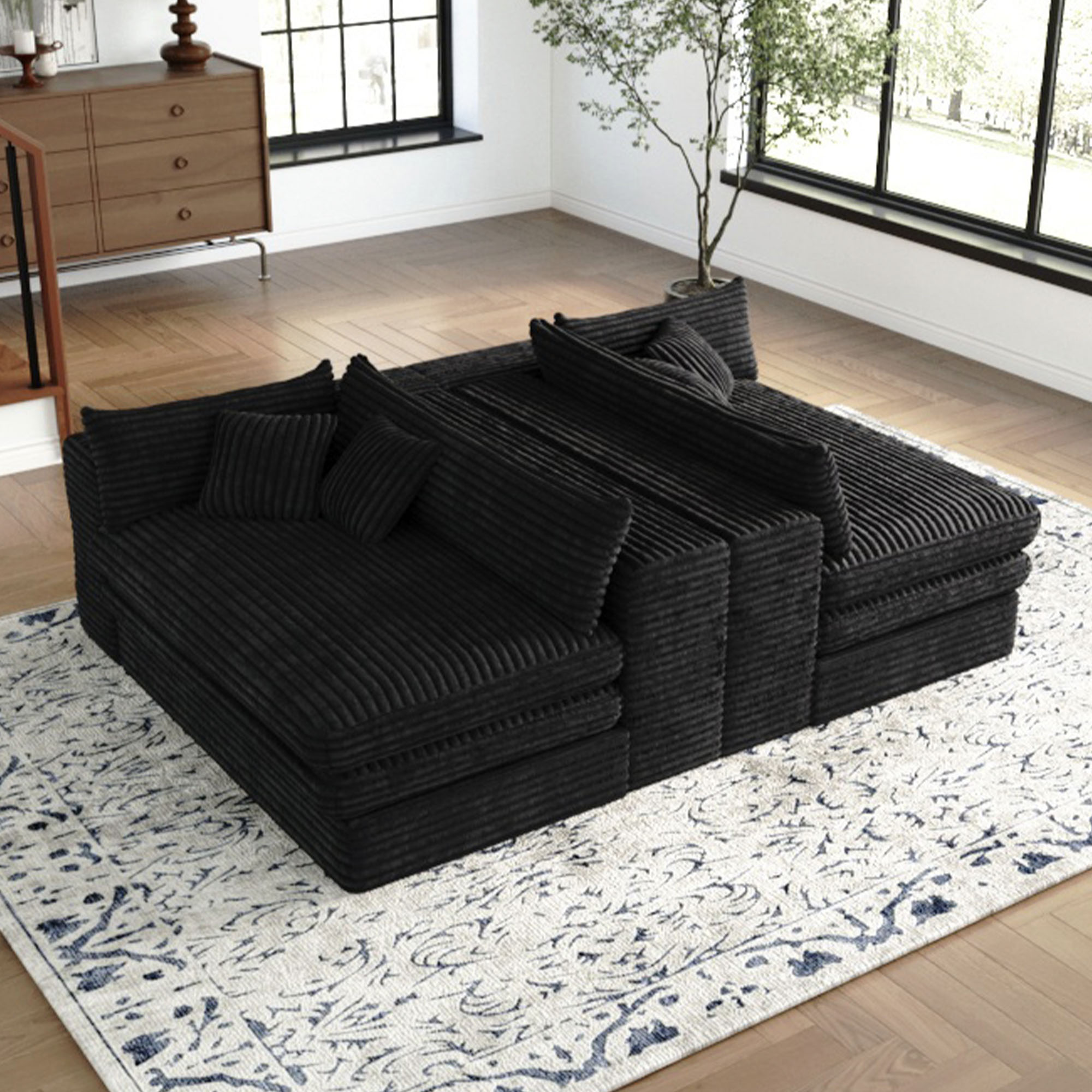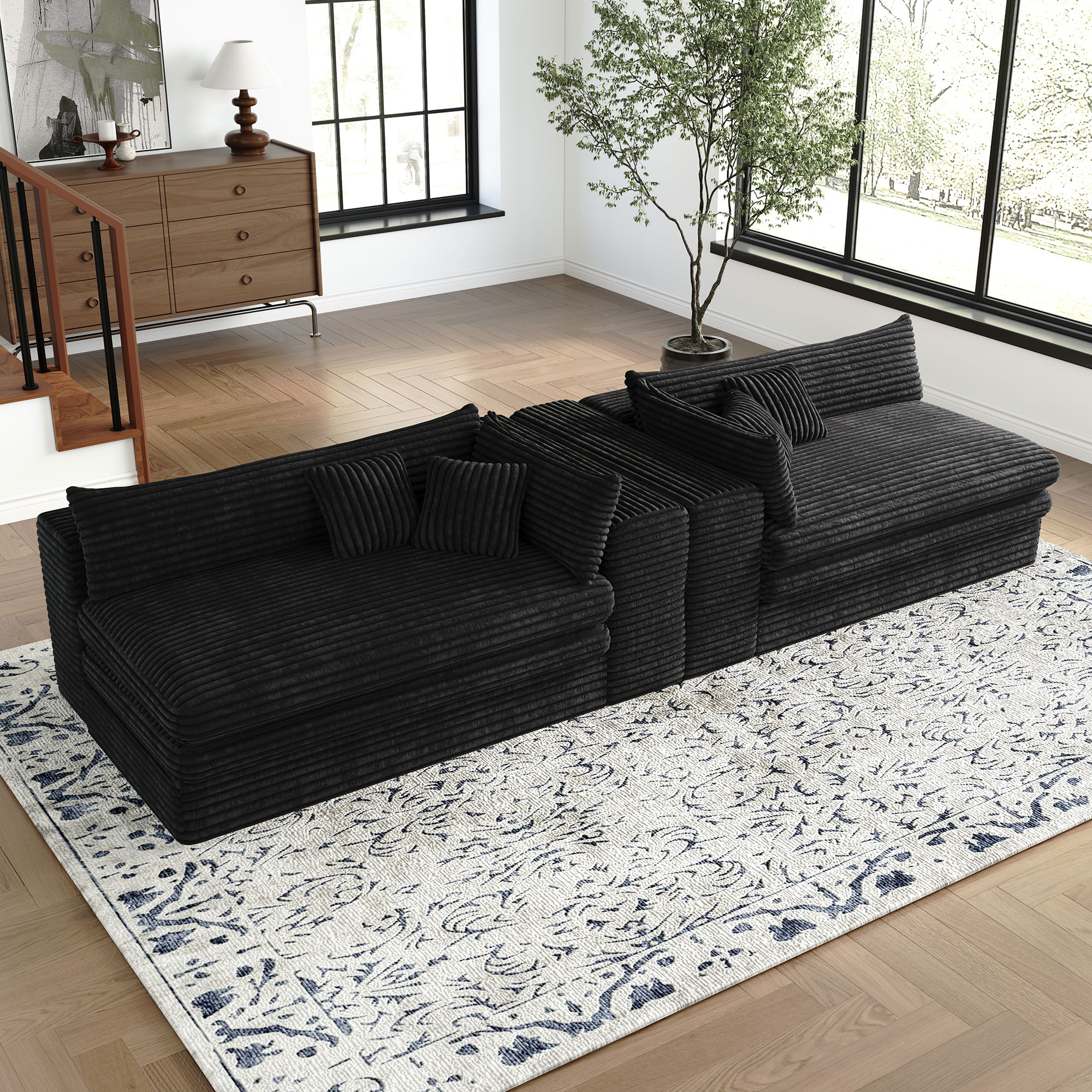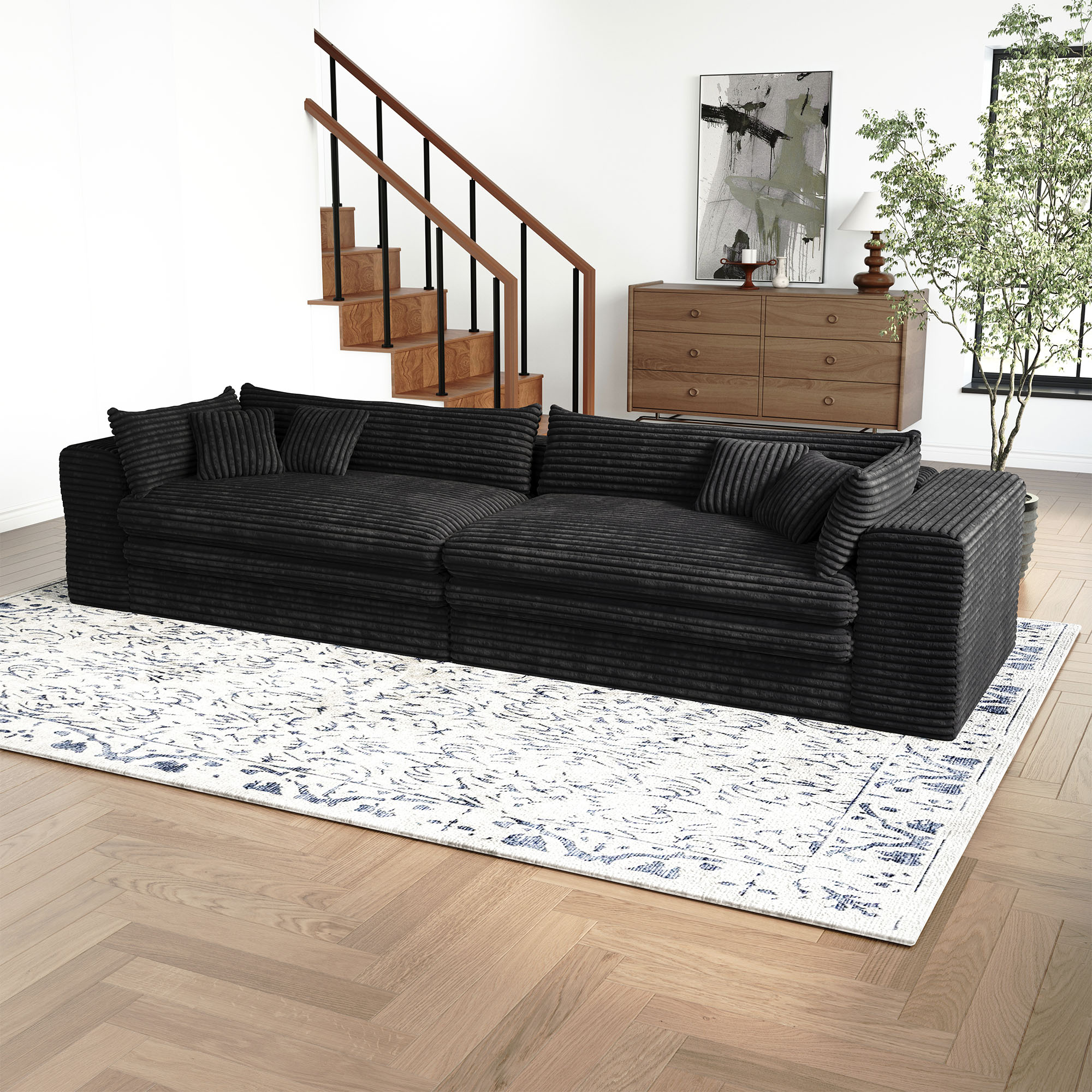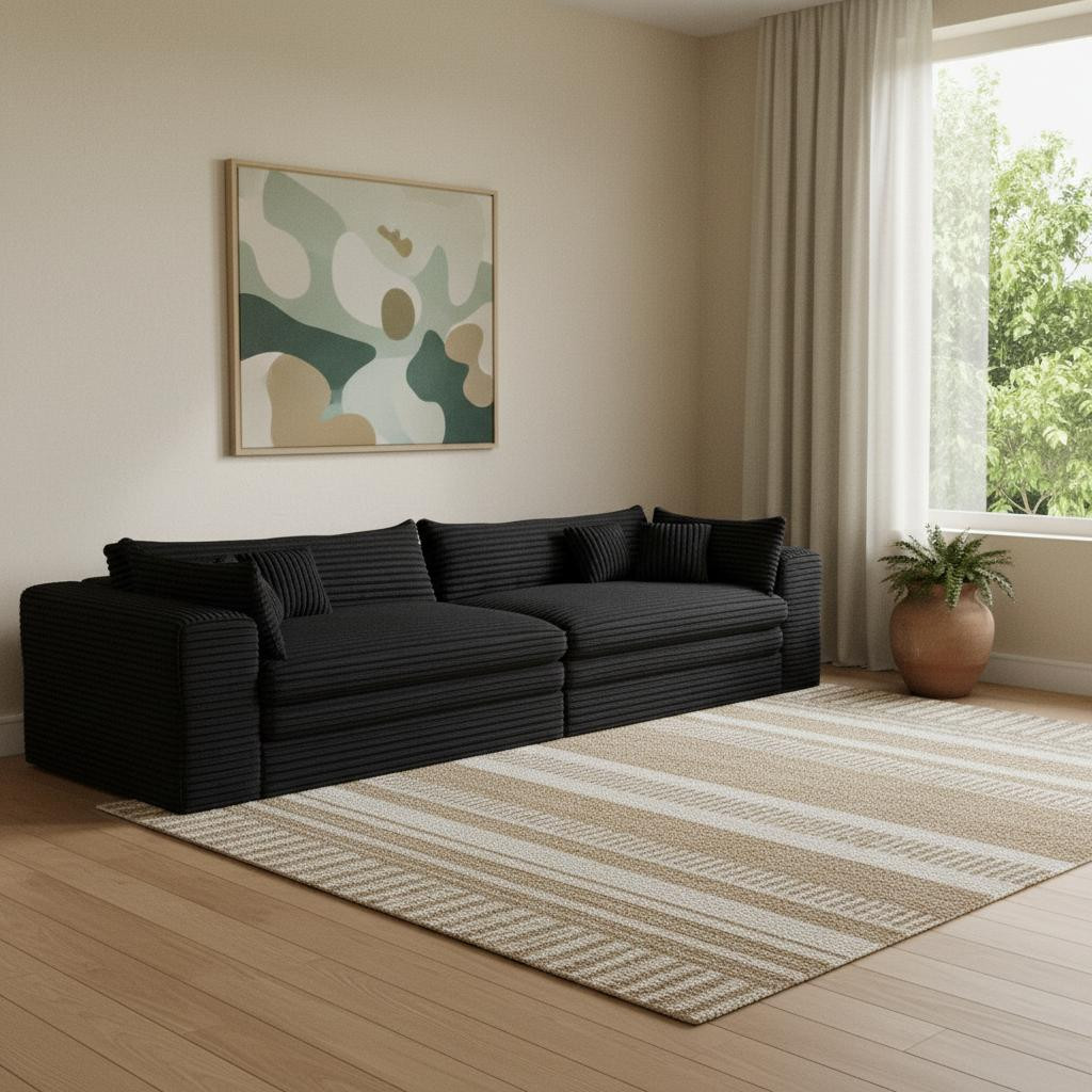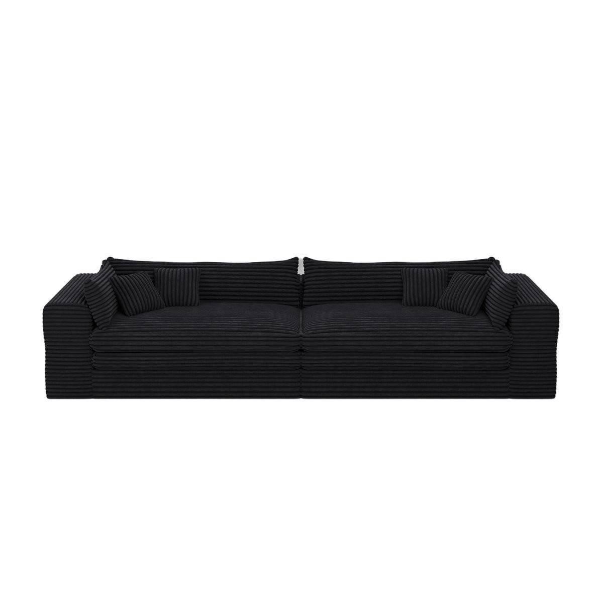 The 162-inch black corduroy compression foam sofa is a stunning addition to any living space. Upholstered in luxurious black corduroy, this sofa exudes a casual style with its solid color design. It features a single cushion seat that provides ample comfort and support. The cushion back offers a cozy feel, perfect for relaxation. With removable cushion covers, maintenance is simple and hassle-free. Designed with modularity in mind, it can easily adapt to your room's layout, making it versatile for various configurations. The foam frame ensures durability and a lightweight structure, allowing for easy rearrangement. Complete with arms for added comfort, this sofa strikes the perfect balance between style and practicality. 29.50-inch h x 162.20-inch w x 39.40-inch d.