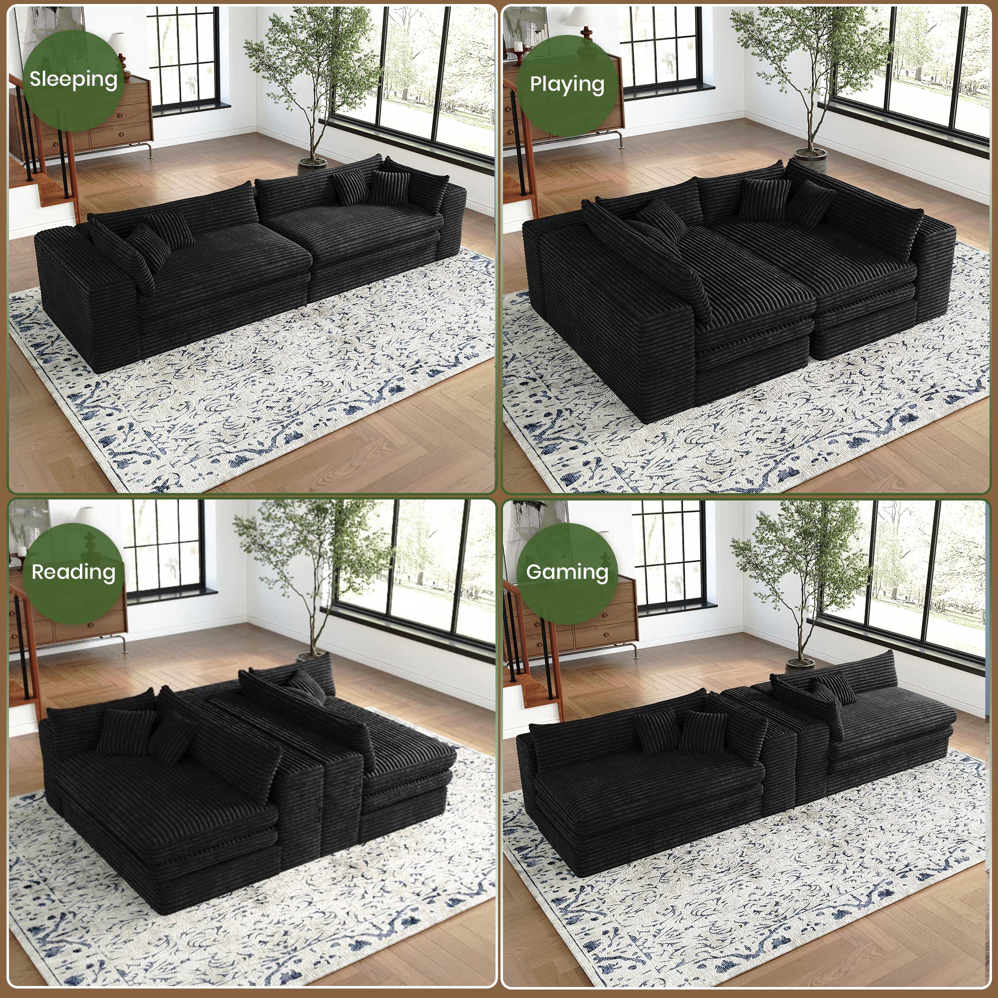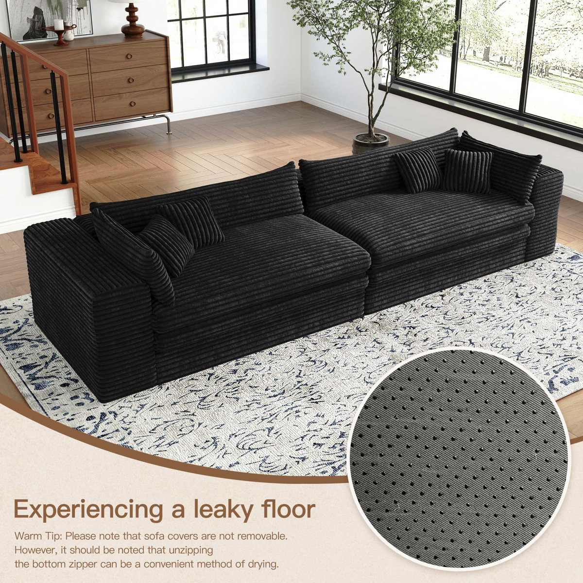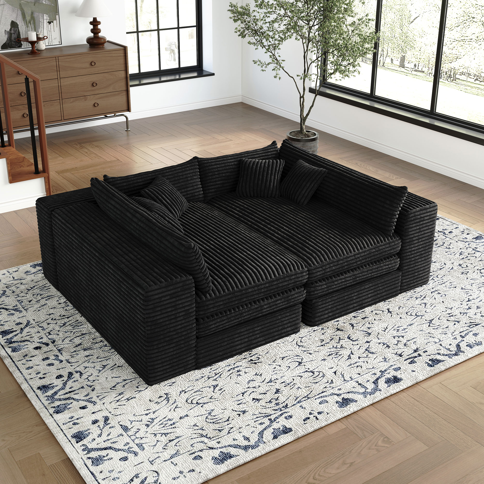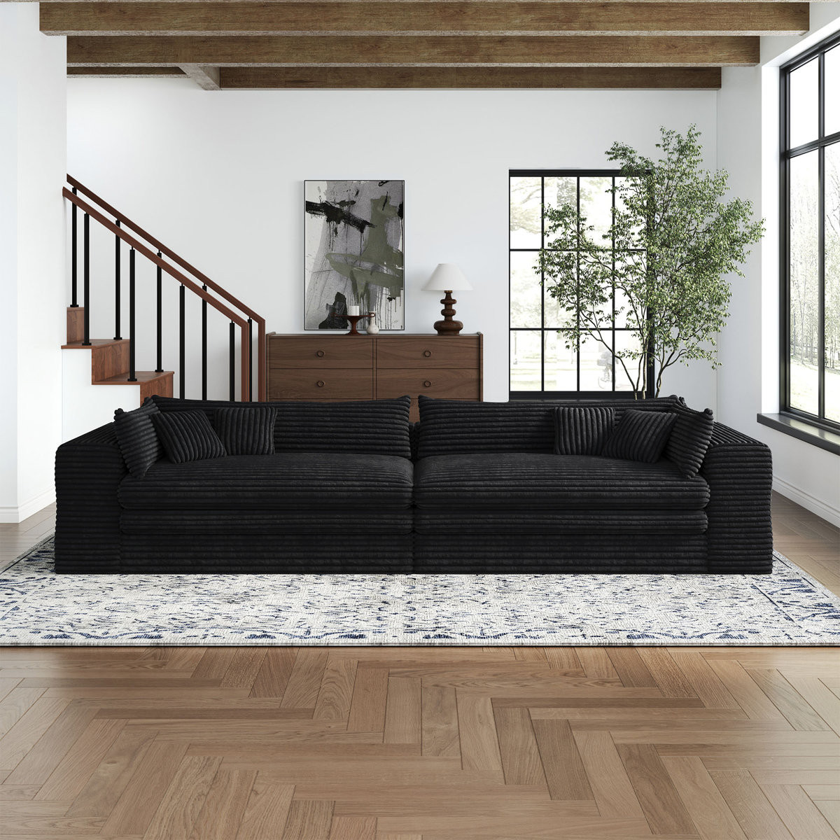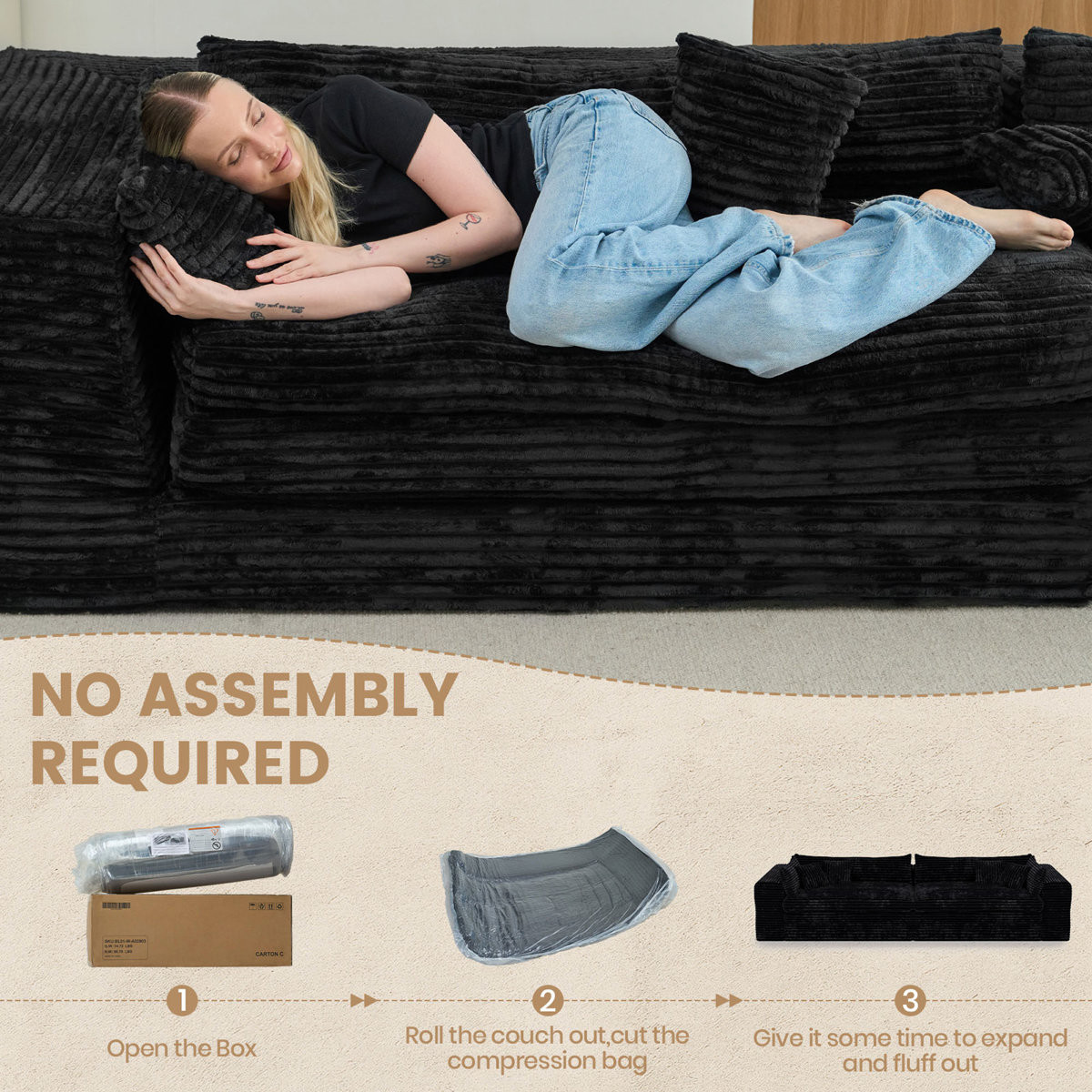 The 162-inch black corduroy compression foam sofa is a stunning addition to any living space. Upholstered in luxurious black corduroy, this sofa exudes a casual style with its solid color design. It features a single cushion seat that provides ample comfort and support. The cushion back offers a cozy feel, perfect for relaxation. With removable cushion covers, maintenance is simple and hassle-free. Designed with modularity in mind, it can easily adapt to your room's layout, making it versatile for various configurations. The foam frame ensures durability and a lightweight structure, allowing for easy rearrangement. Complete with arms for added comfort, this sofa strikes the perfect balance between style and practicality. 29.50-inch h x 162.20-inch w x 39.40-inch d.
