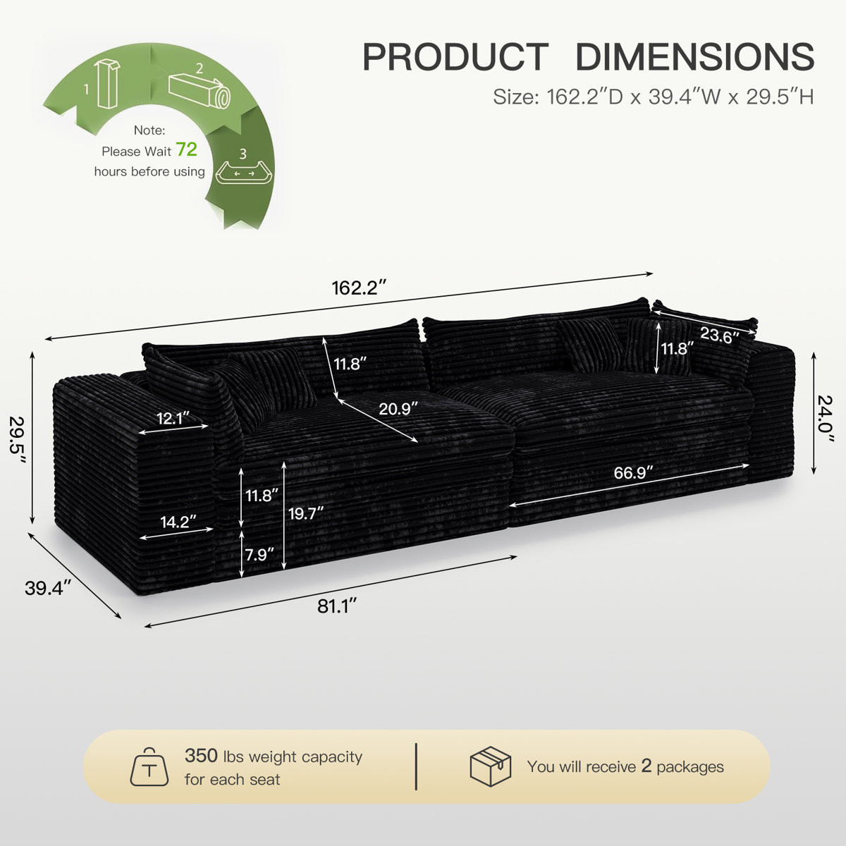 black corduroy compression foam sofa, corduroy compression foam sofa, compression foam sofa, 162" black corduroy compression foam, corduroy compression foam |