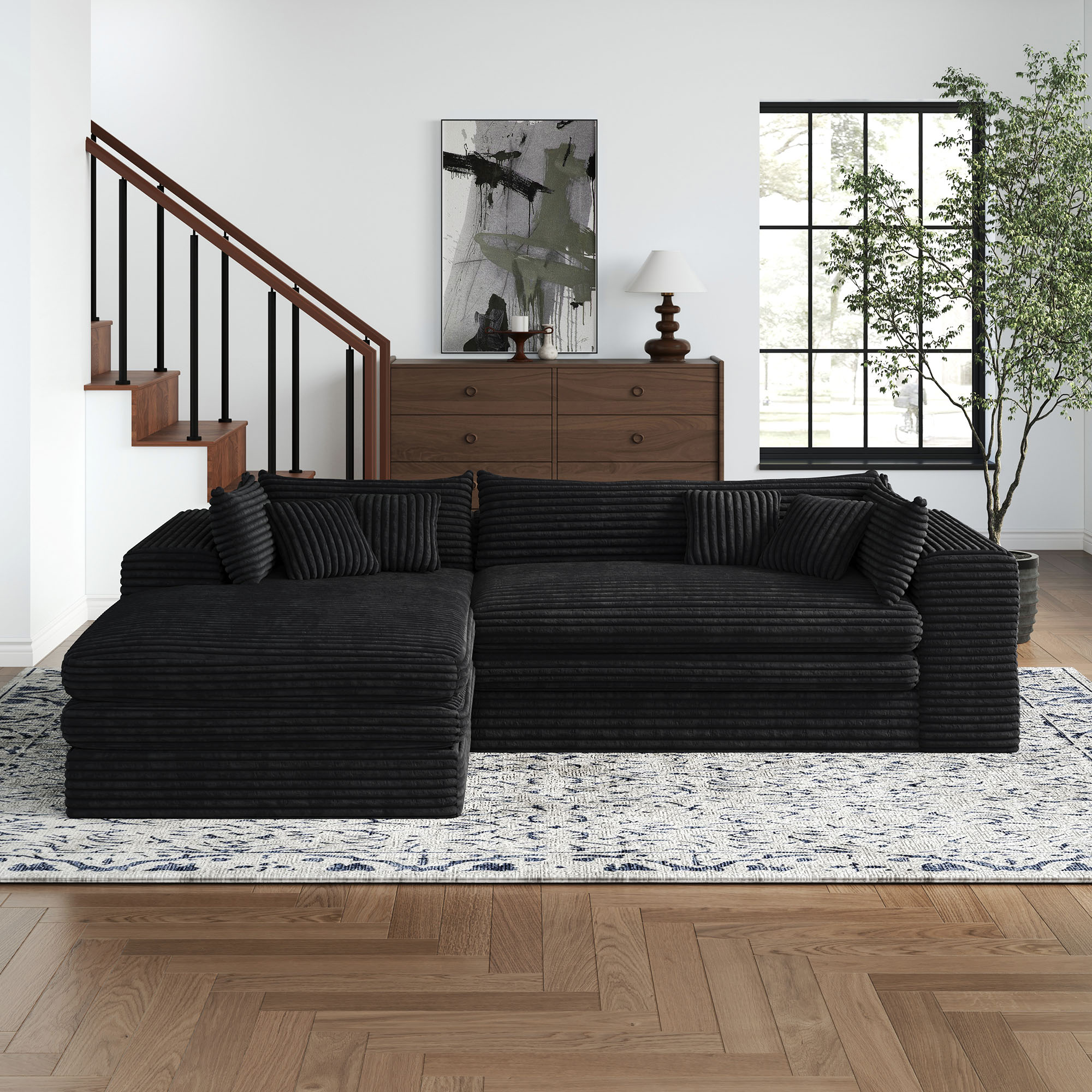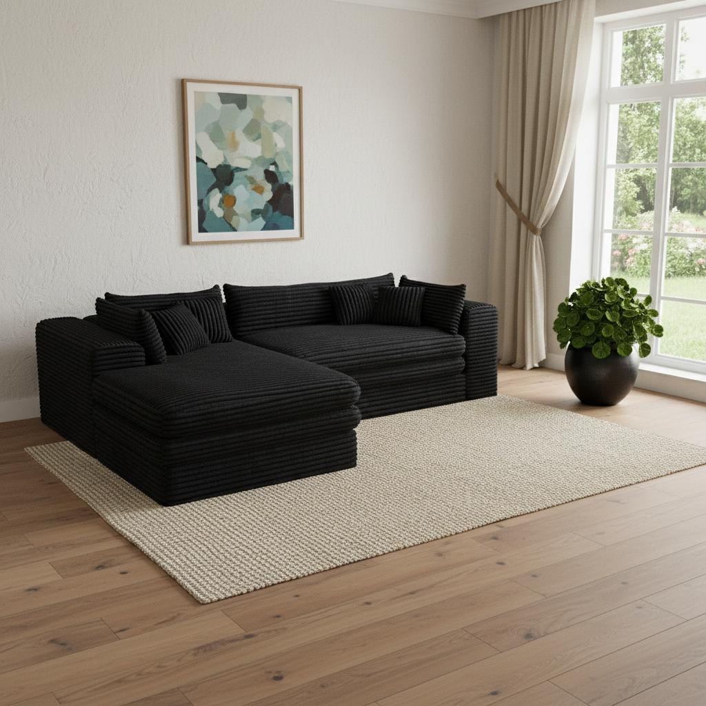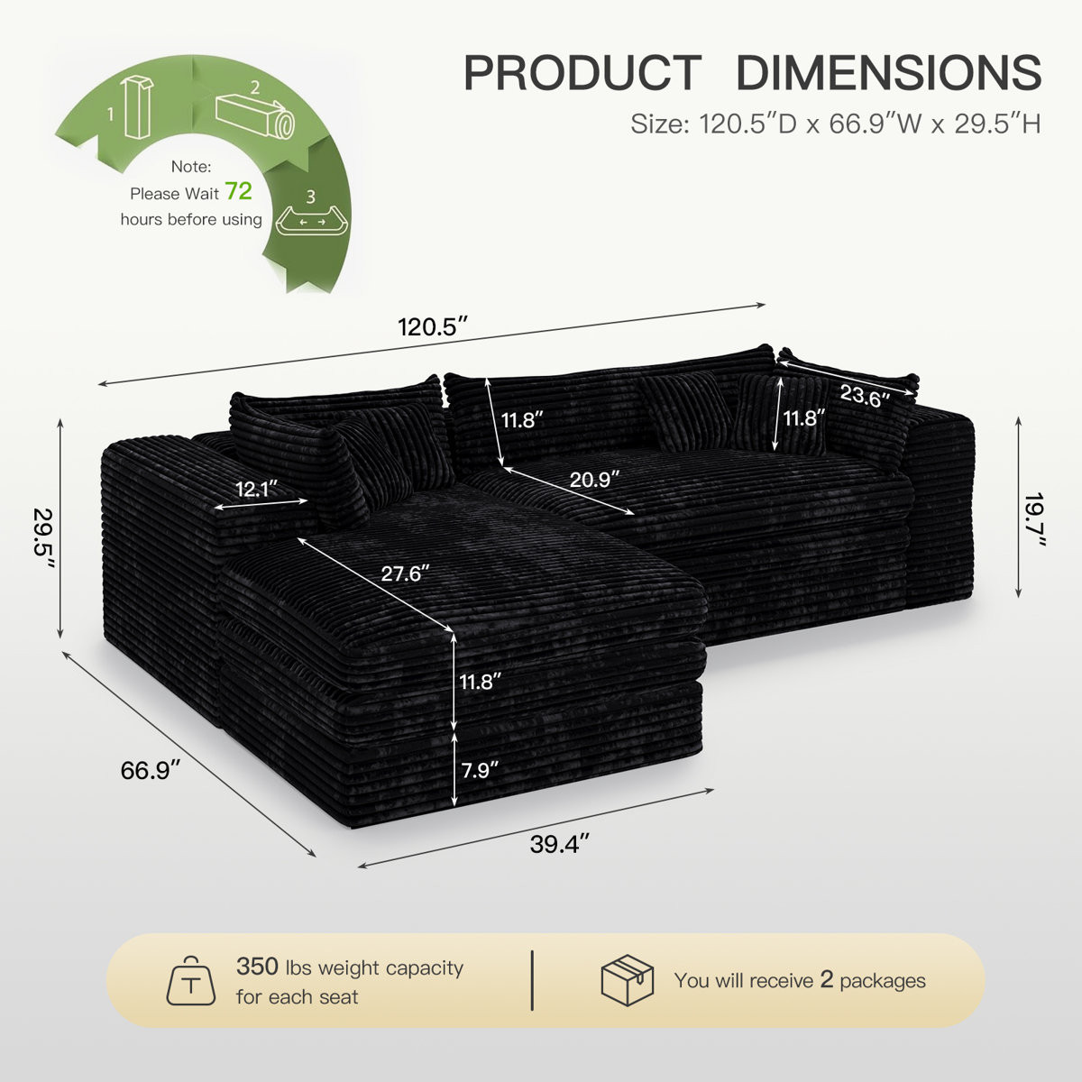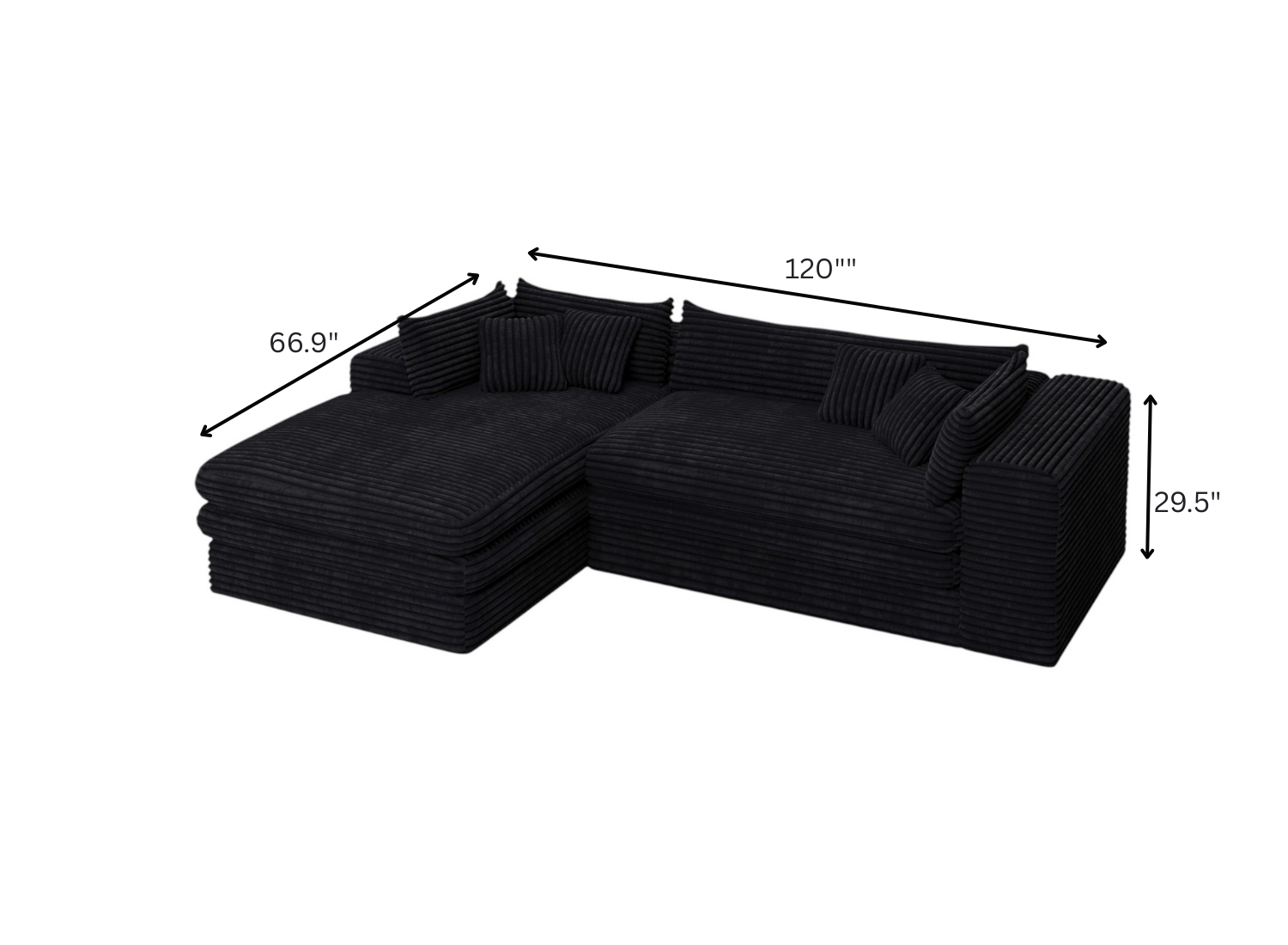 Transform your home's interior with this luxurious 121-inch black corduroy compression foam sofa. This solid color standard is made from corduroy that is unique and gives this piece some special flair. Solid colors give you lots of decorative options and are easy to work into your decor scheme. Removable back cushions make this sofa easy to manage. Square arms offer a comfy place to rest. Built to last, this sofa will be a great centerpiece for your room. 29.50-inch h x 120.50-inch w x 66.90-inch d.