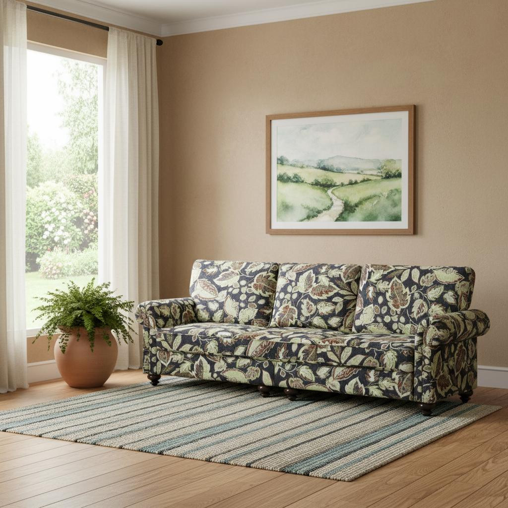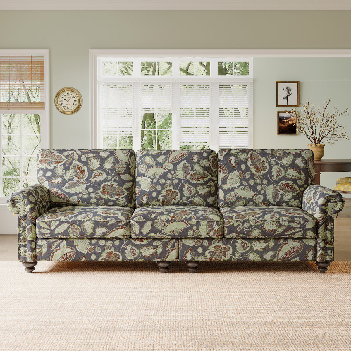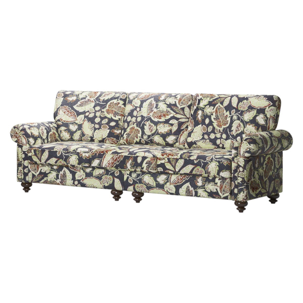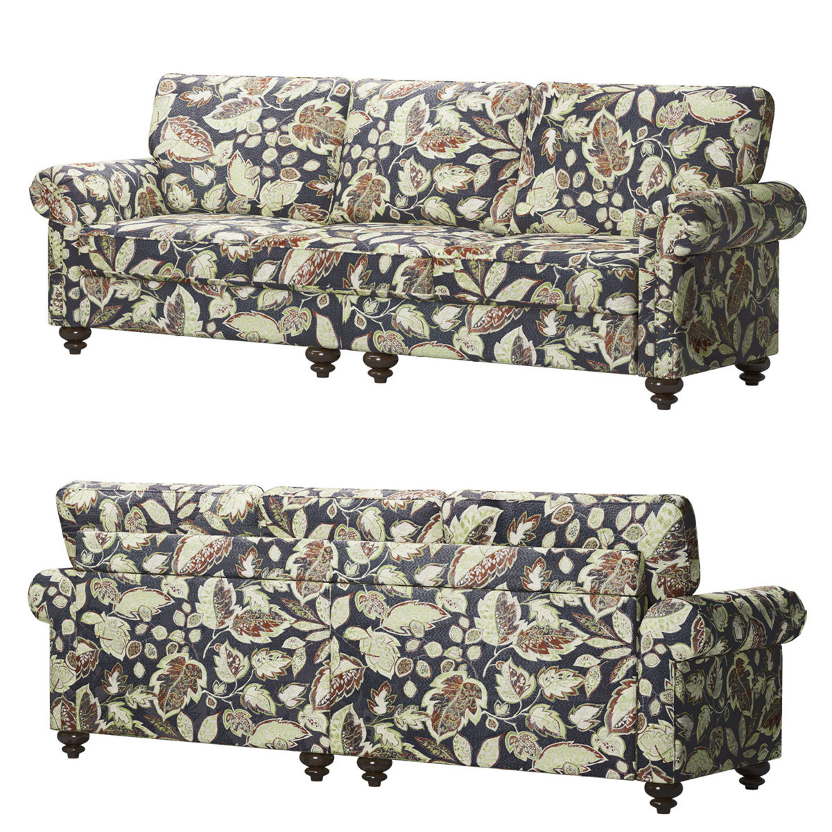 Transform your home's interior with this luxurious 76-inch sage navy blue burgundy and off white upholstered floral sofa. Built to last, this floral standard is upholstered with polyester blend that is designed to be soft, resilient, easy to maintain, and stand the test of time. Sinuous springs construction gives this piece strong support and makes it comfortable to sit even for long periods of time. Removable seat cushions make this sofa easy to manage. This piece includes high end detailing such as nailhead trim for a refined look. Round arms offer a comfy place to rest. Natural solid wood legs effortlessly elevate the room and add a touch of contemporary design. Built to last, this sofa will be a great centerpiece for your room. 35.40-inch h x 76.00-inch w x 32.70-inch d.