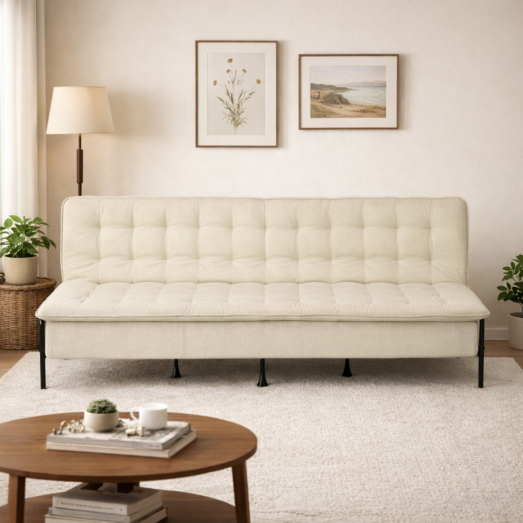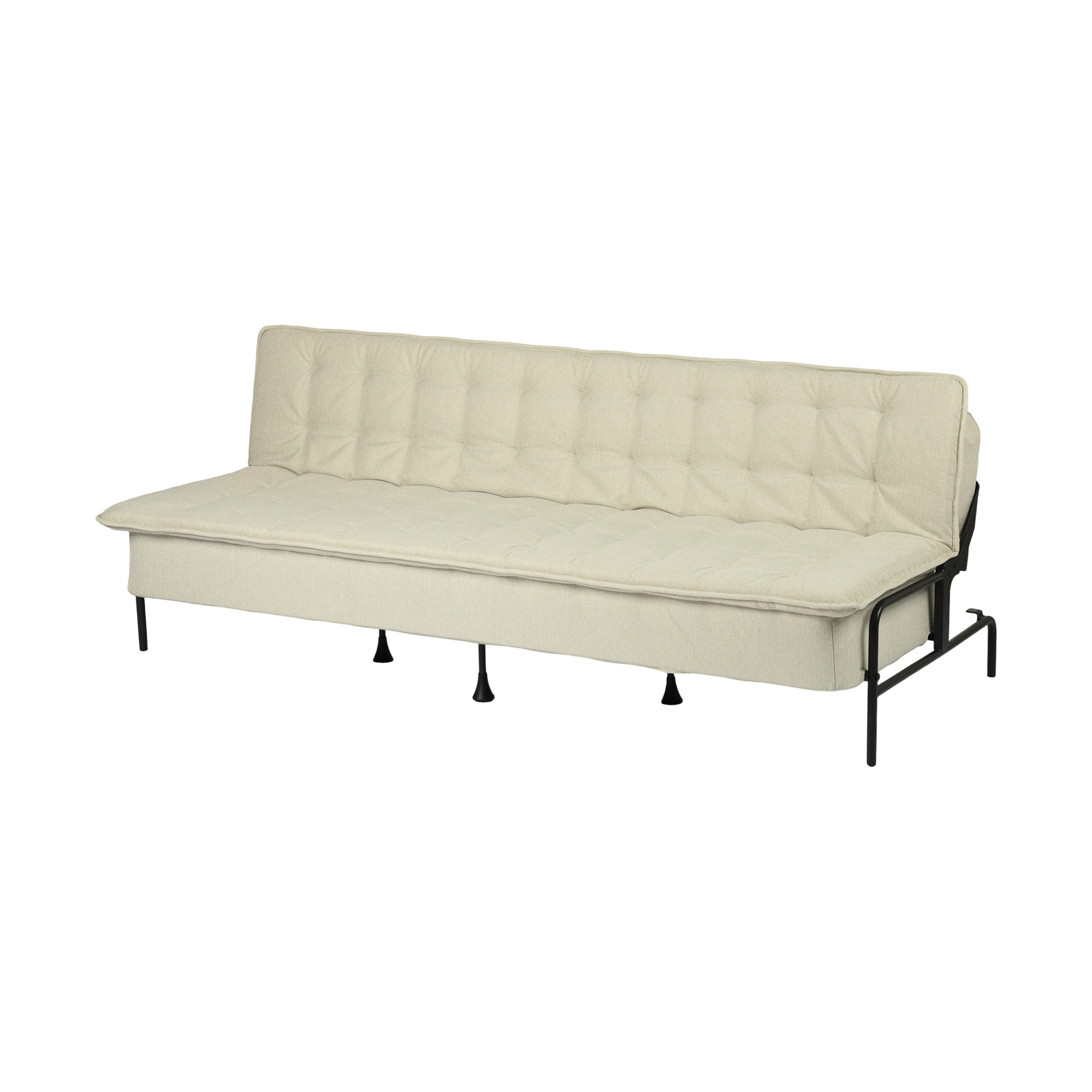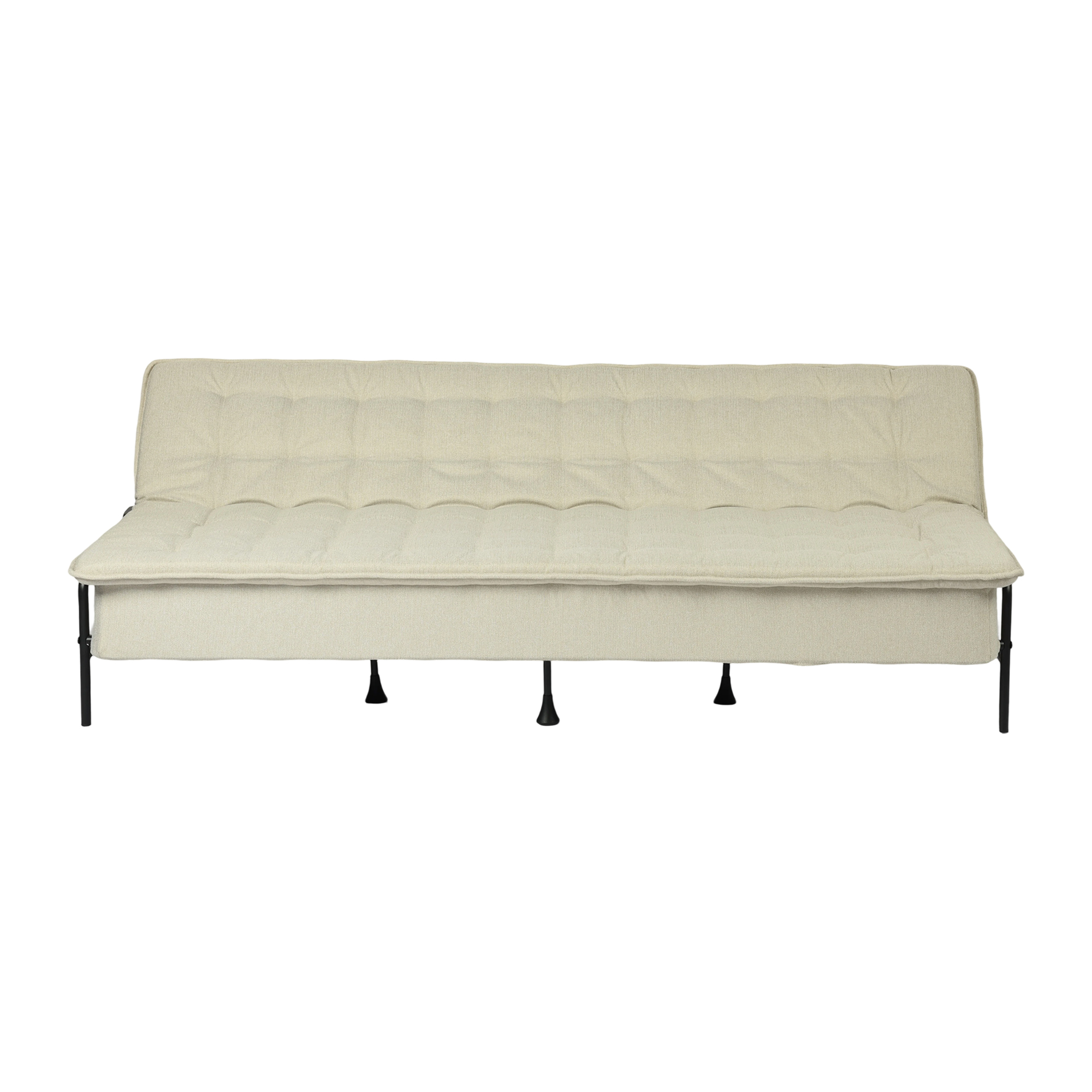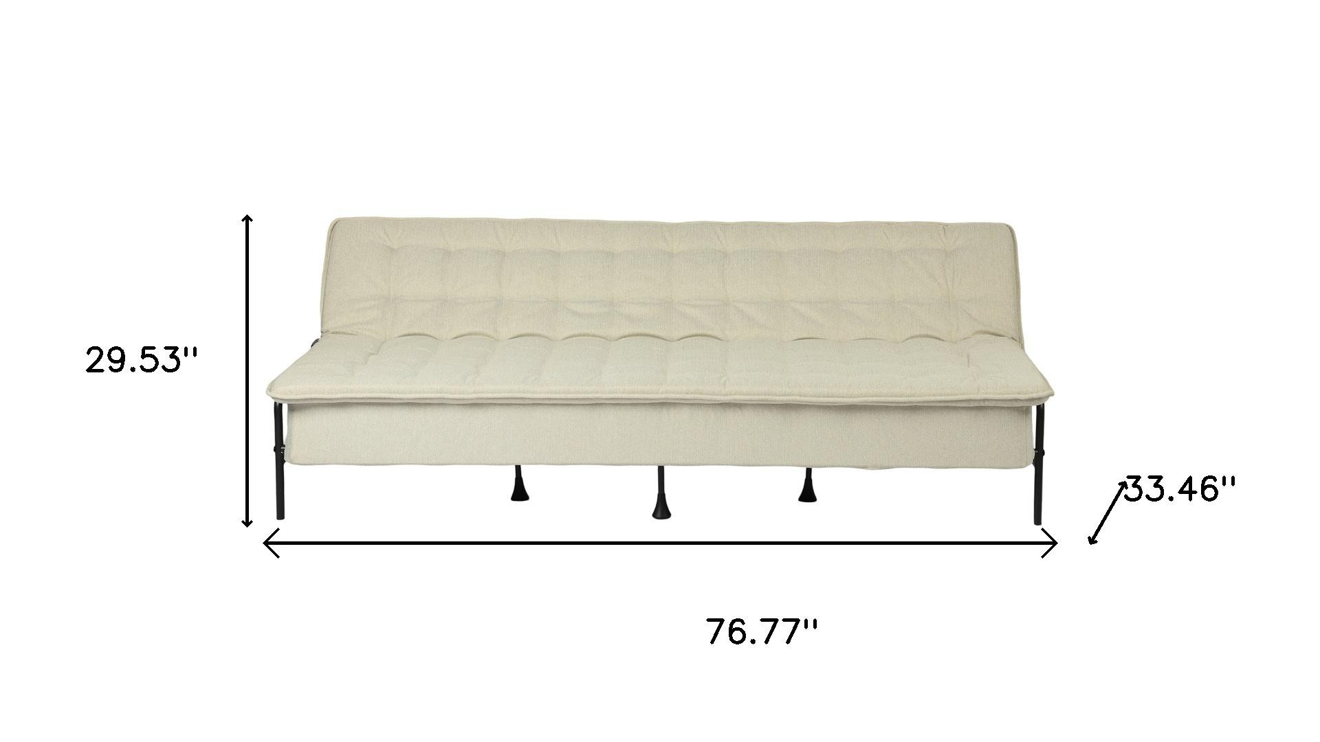 Transform your home's interior with this luxurious 77-inch beige fabric convertible futon sleeper reclining sofa. Solid colors give you lots of decorative options and are easy to work into your decor scheme. Designed with an updated and refreshing style, this sofa is armless to create that unique contemporary or modern aesthetic. Black metal legs effortlessly elevate the room and add a touch of contemporary design. A great showpiece for your room, this sofa is a must have. 29.53-inch h x 76.77-inch w x 33.46-inch d.