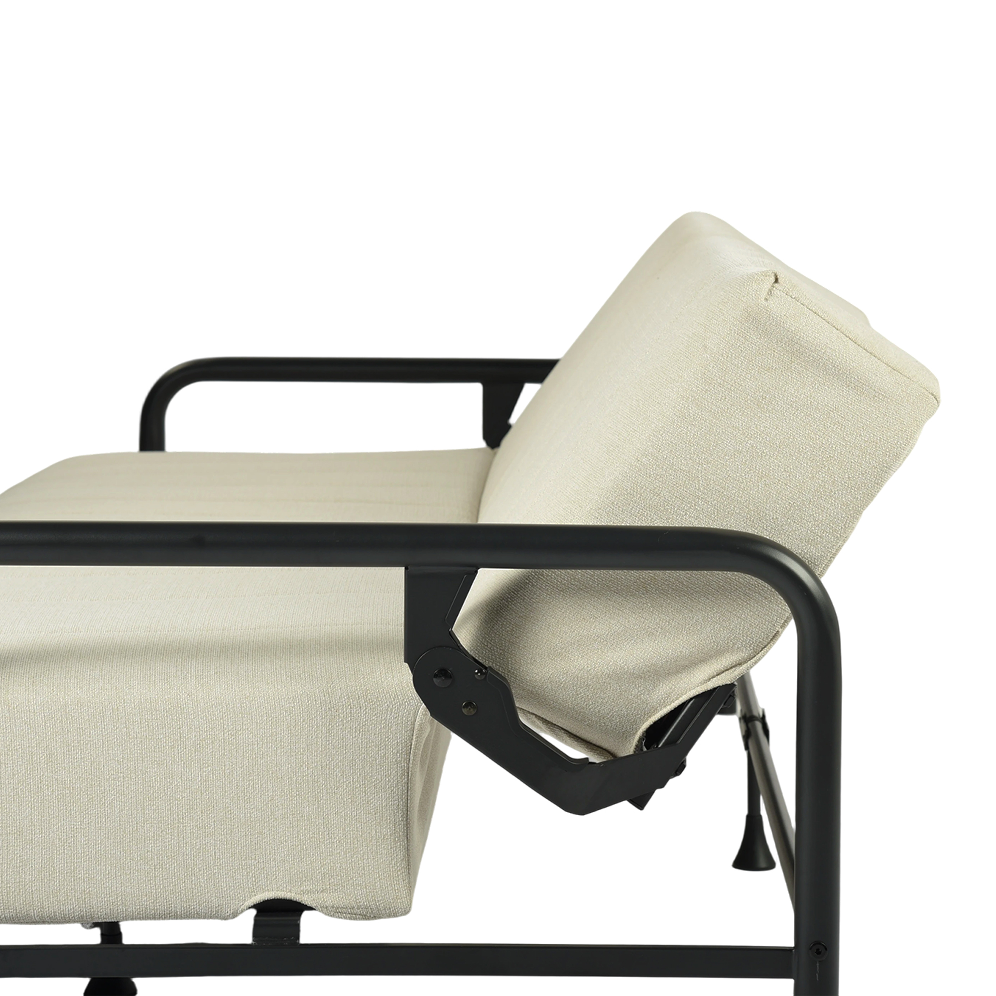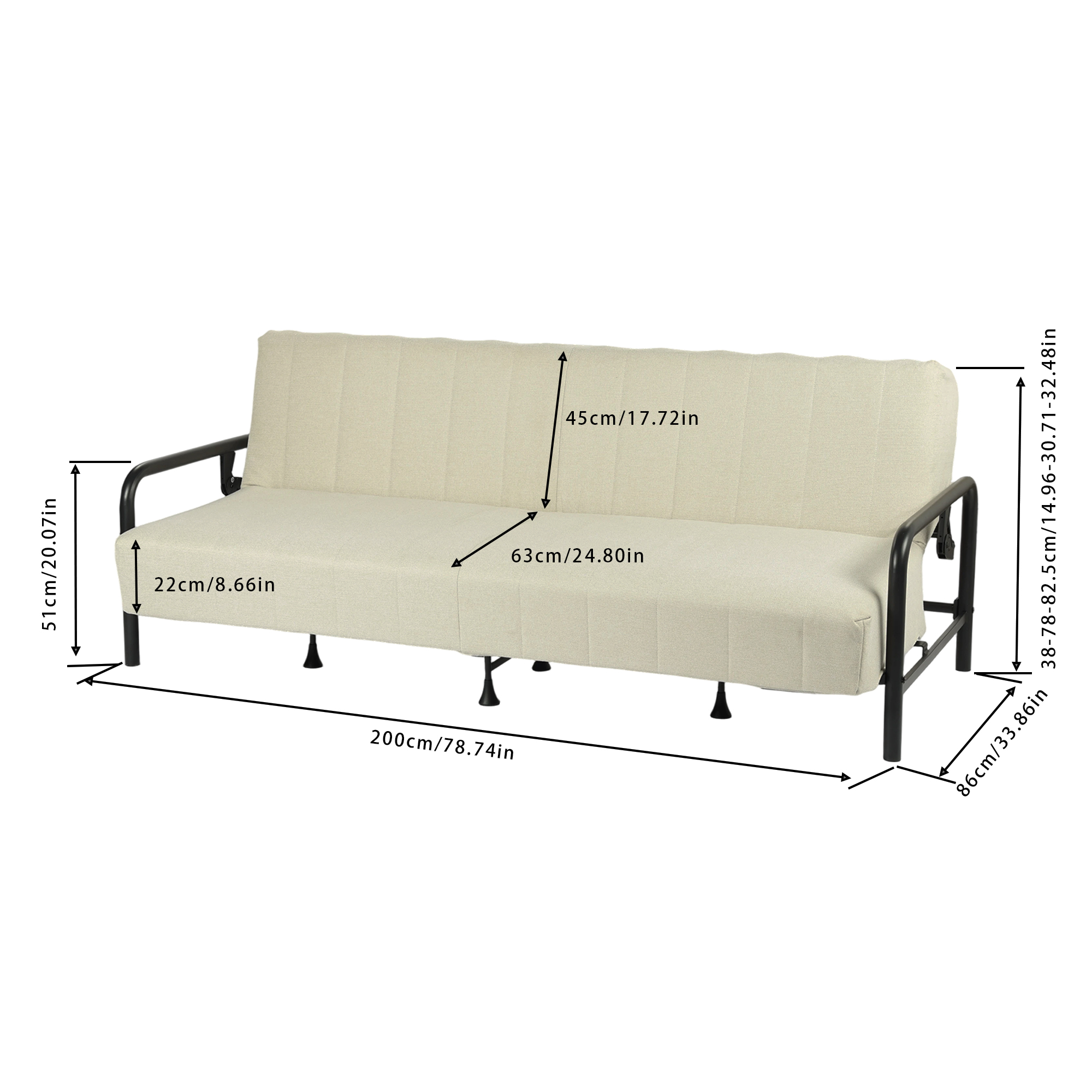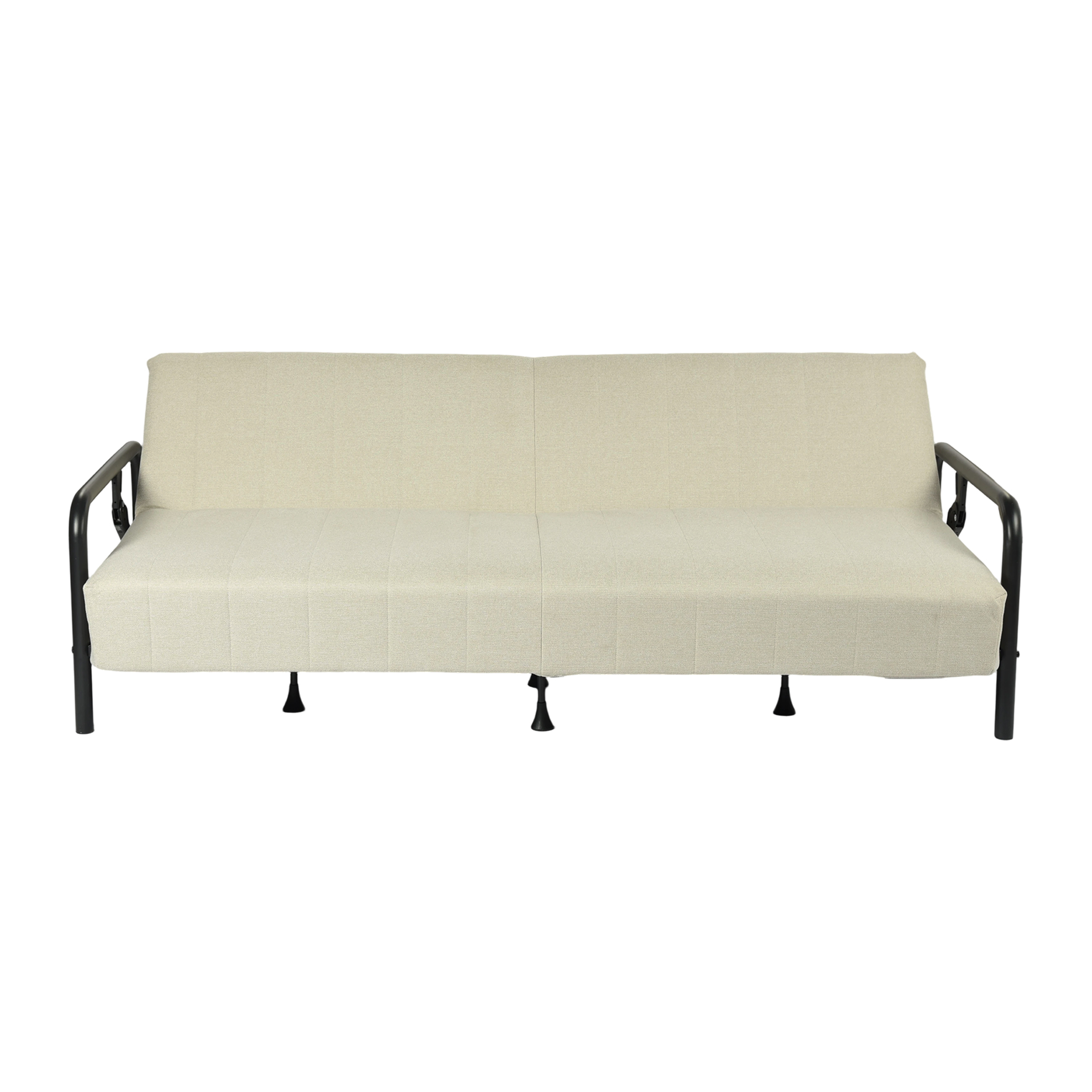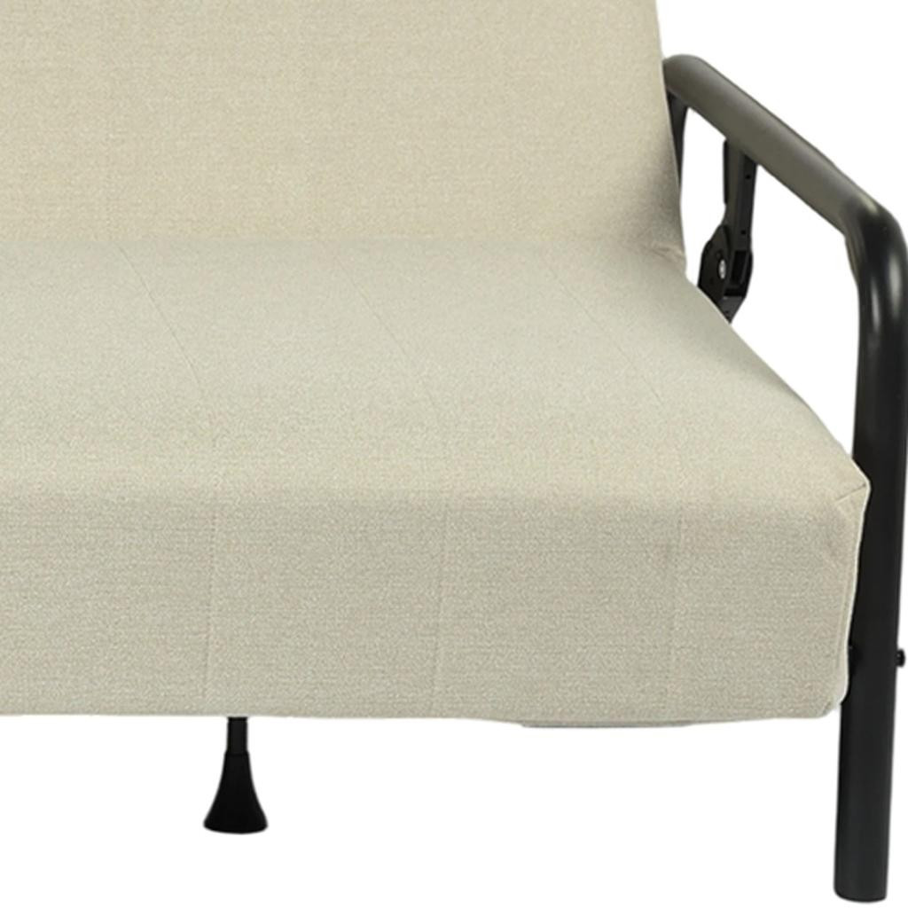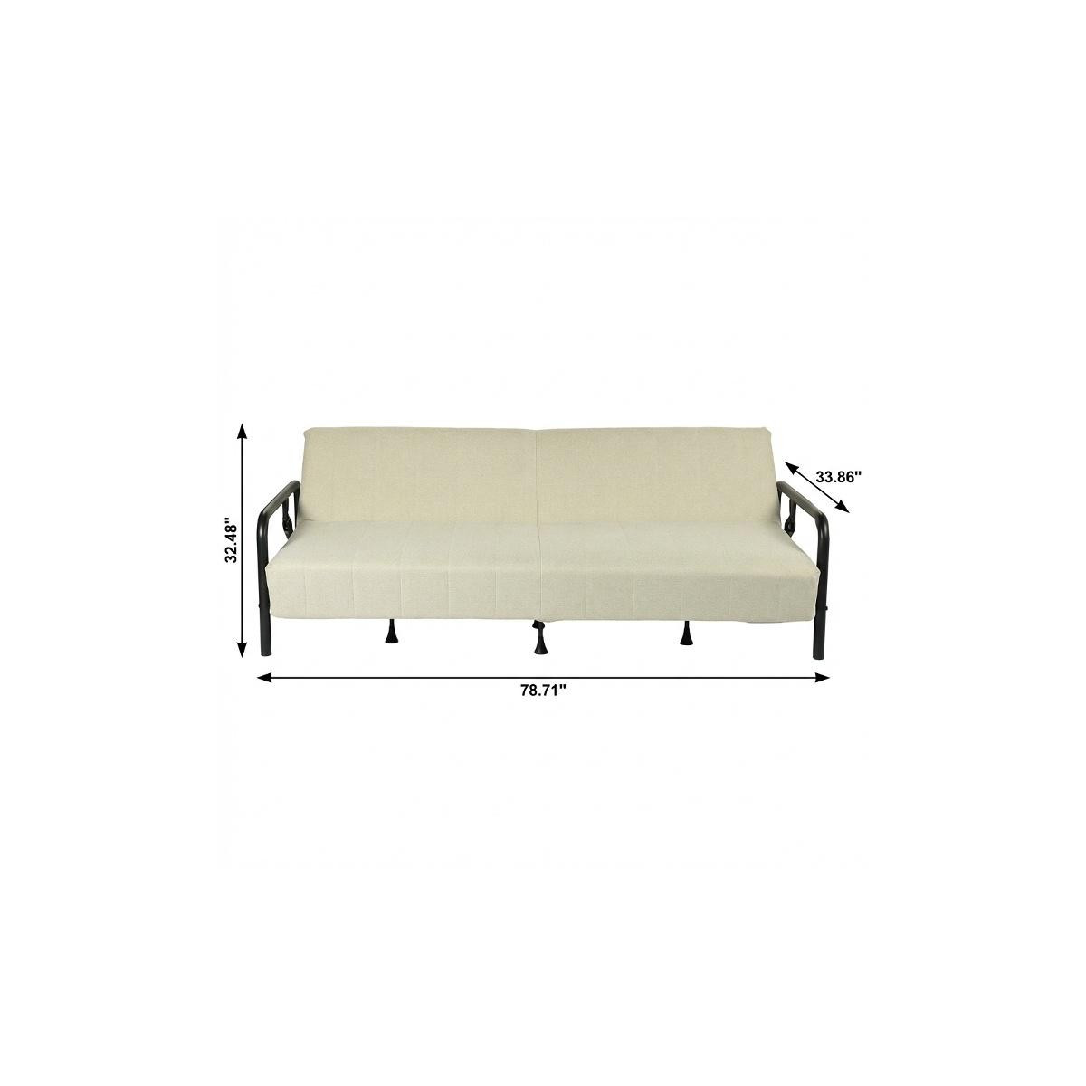 Add an air of fashion to your space with this fabulous 79-inch beige fabric convertible futon steel sleeper reclining sofa. Solid colors give you lots of decorative options and are easy to work into your decor scheme. Fixed arms offer a comfy place to rest. Black metal legs effortlessly elevate the room and add a touch of contemporary design. Built to last, this sofa will be a great centerpiece for your room. 32.48-inch h x 78.71-inch w x 33.86-inch d.