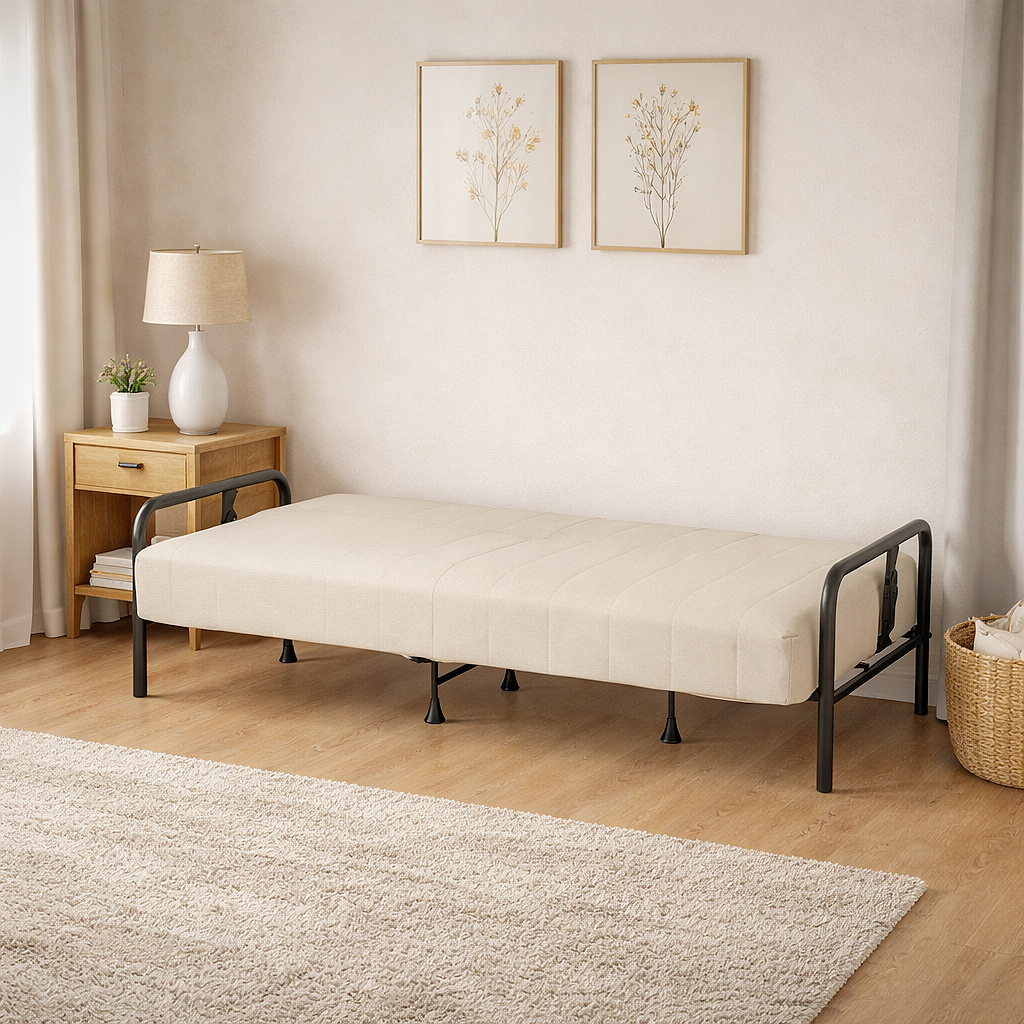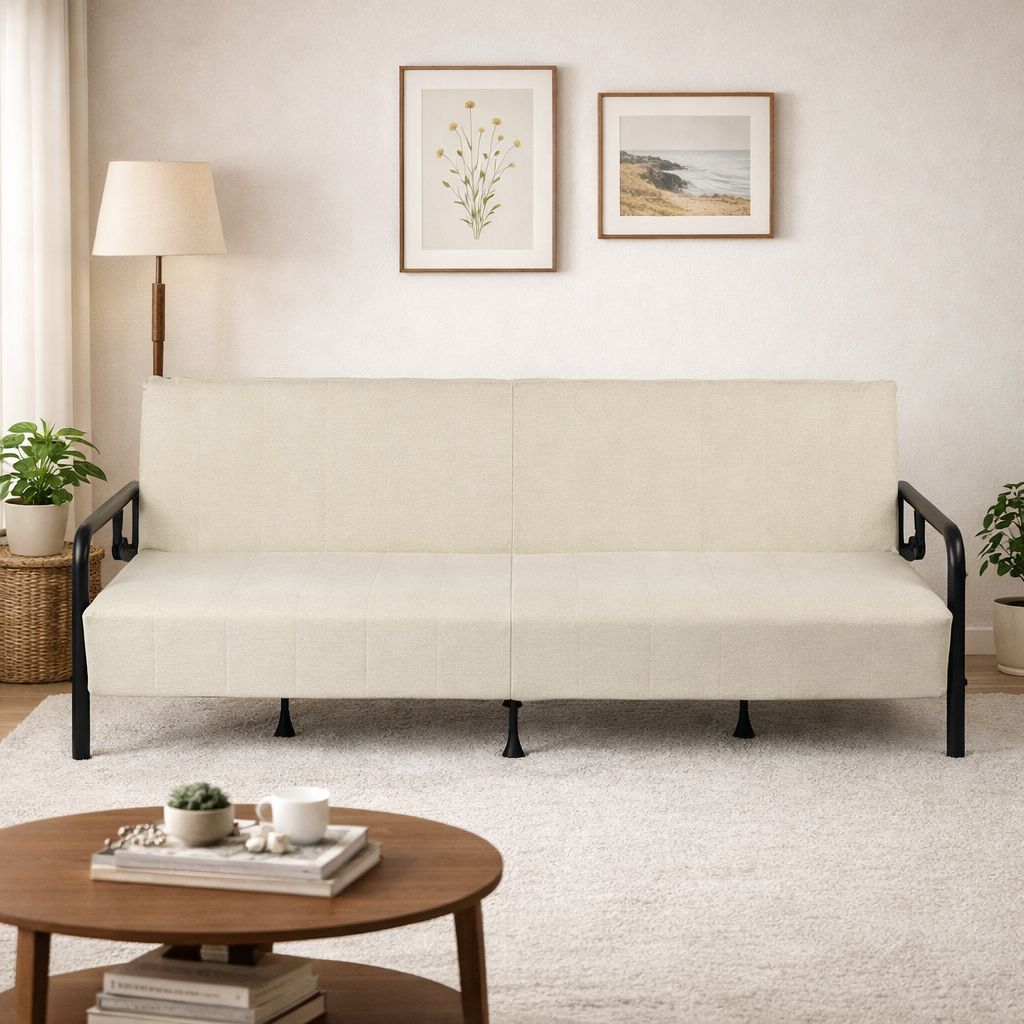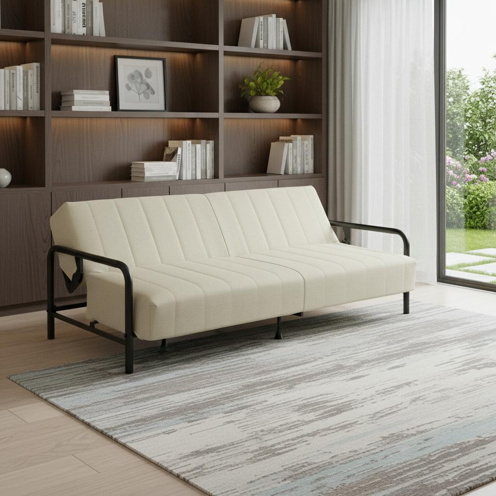 convertible futon sofa,beige sleeper sofa, modern sofa bed, steel frame futon |