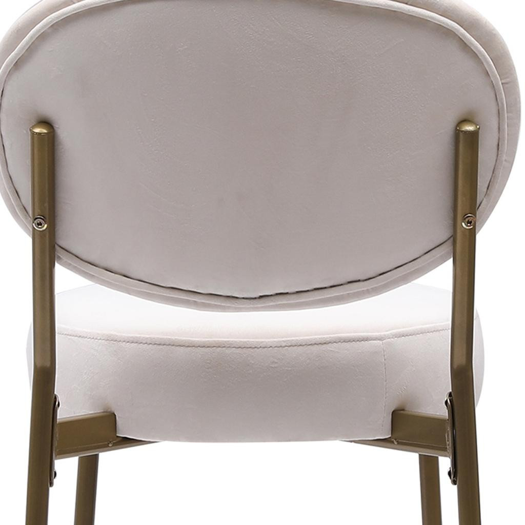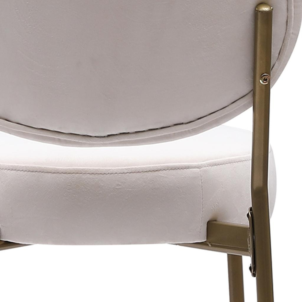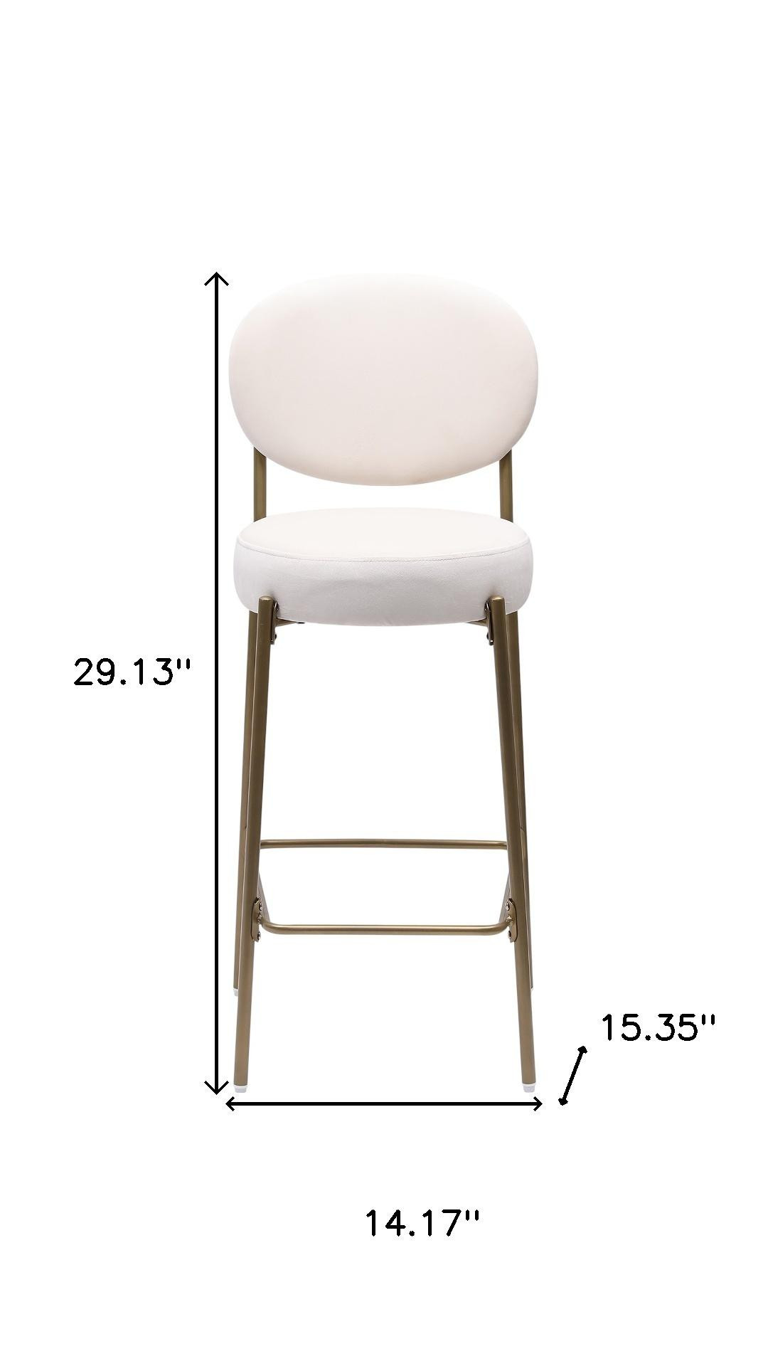 Comfortable enough to sit in for awhile, this set of two 29-inch white and gold velvet and metal low back bar height bar chairs will transcend the look of your room. The white velvet seat of this stool is a nice contrast to the high quality, gold metal of the base. Not only good looking and stylish, this chair features a round shaped seat and a low back for the ultimate in comfort and enjoyment. 29.13-inch h x 14.17-inch w x 15.35-inch d.