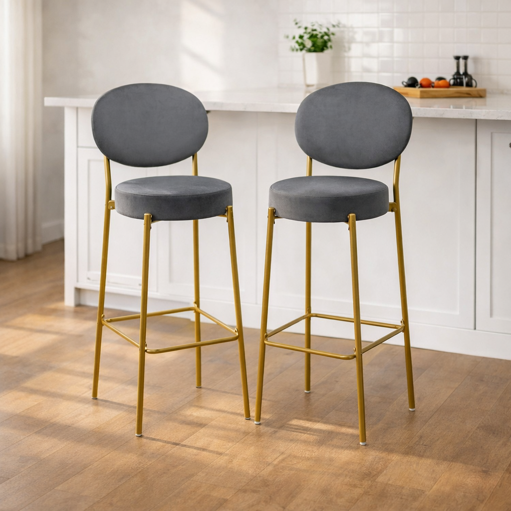 height bar chairs, low bar height bar chairs, bar height bar chairs, set 29" gray gold velvet, gold velvet metal low bar |