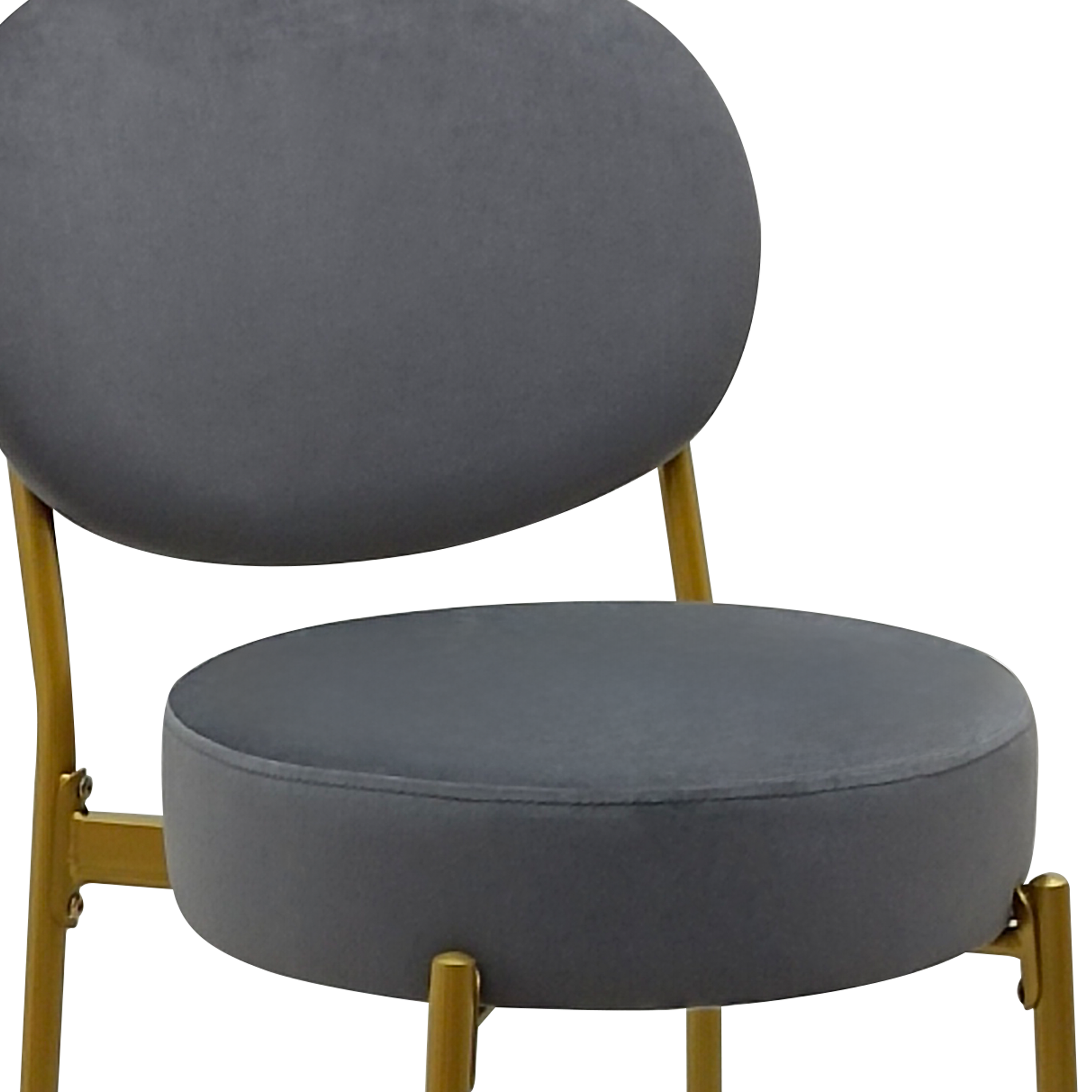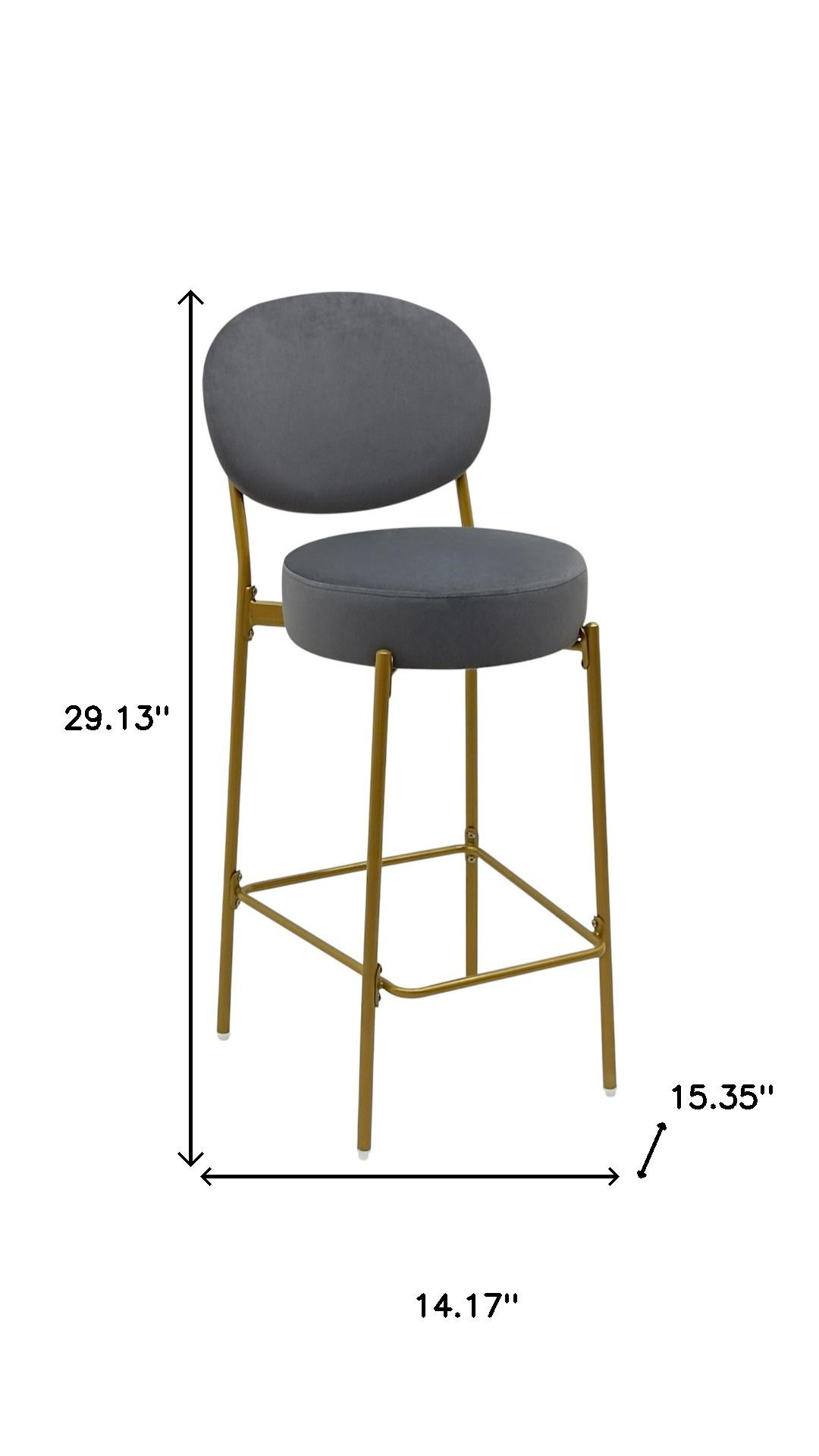 Comfortable enough to sit in for awhile, this set of two 29-inch gray and gold velvet and metal low back bar height bar chairs will transcend the look of your room. The gray upholstered seat of this stool is a nice contrast to the high quality, gold metal of the base. Not only good looking and stylish, this chair features a round shaped seat and a low back for the ultimate in comfort and enjoyment. 29.13-inch h x 14.17-inch w x 15.35-inch d.