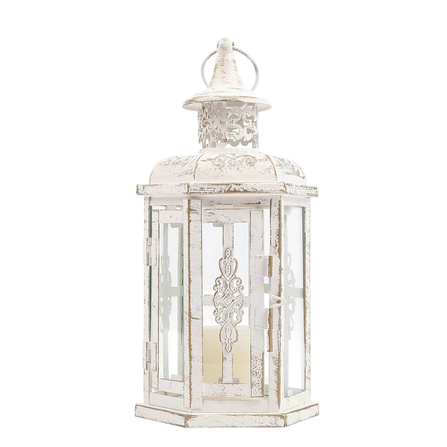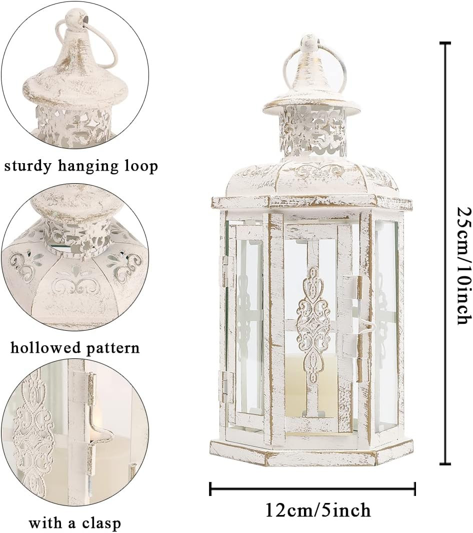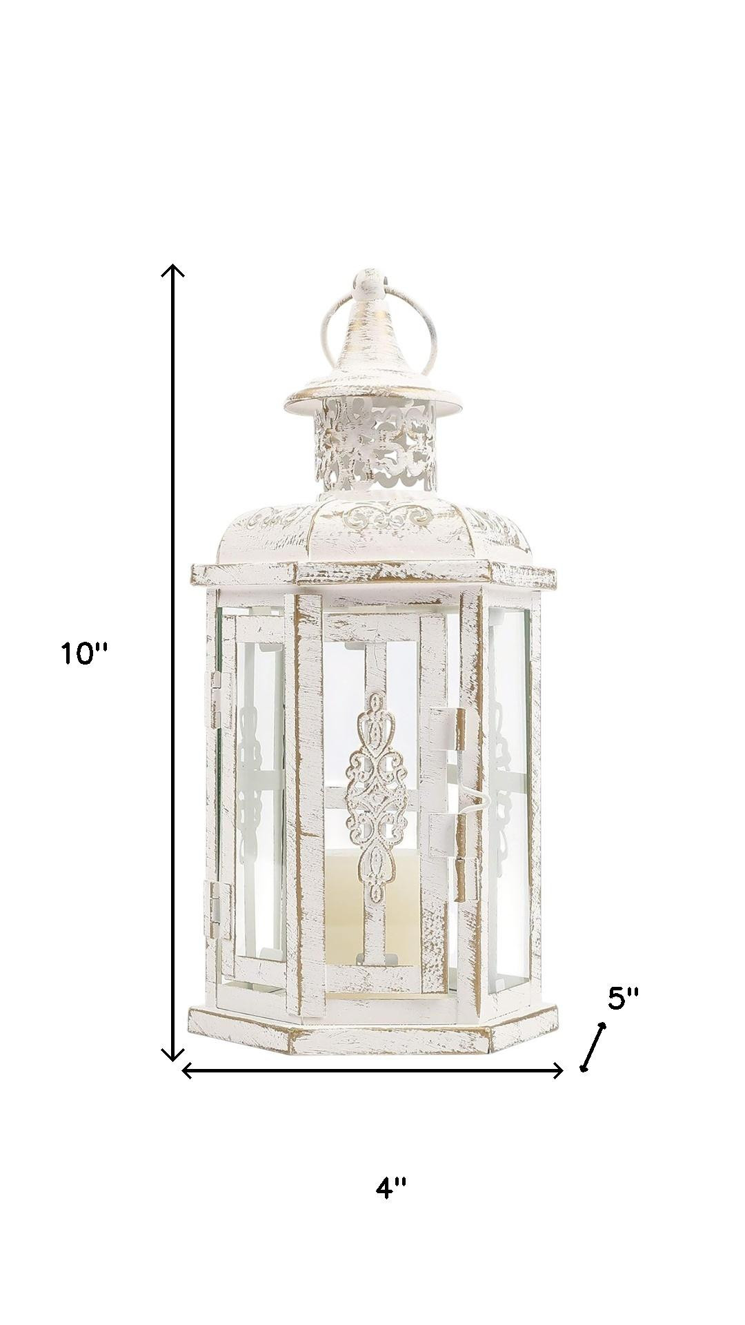 Stylize your tabletop, light up your back patio or add the perfect touch of low light to your living room with this 10-inch white distressed glass and metal tabletop lantern candle holder. Dress up your home to impress every season with this fabulous candleholder that brings a delightful look and glow to your space. Ideal for everyday use but would also be a stunning accent for entertaining or a special event. This hexagon shaped lantern features a rustic, vintage style, and is a pretty decorative accent on its own, with or without a candle. 10.00-inch h x 4.00-inch w x 5.00-inch d.