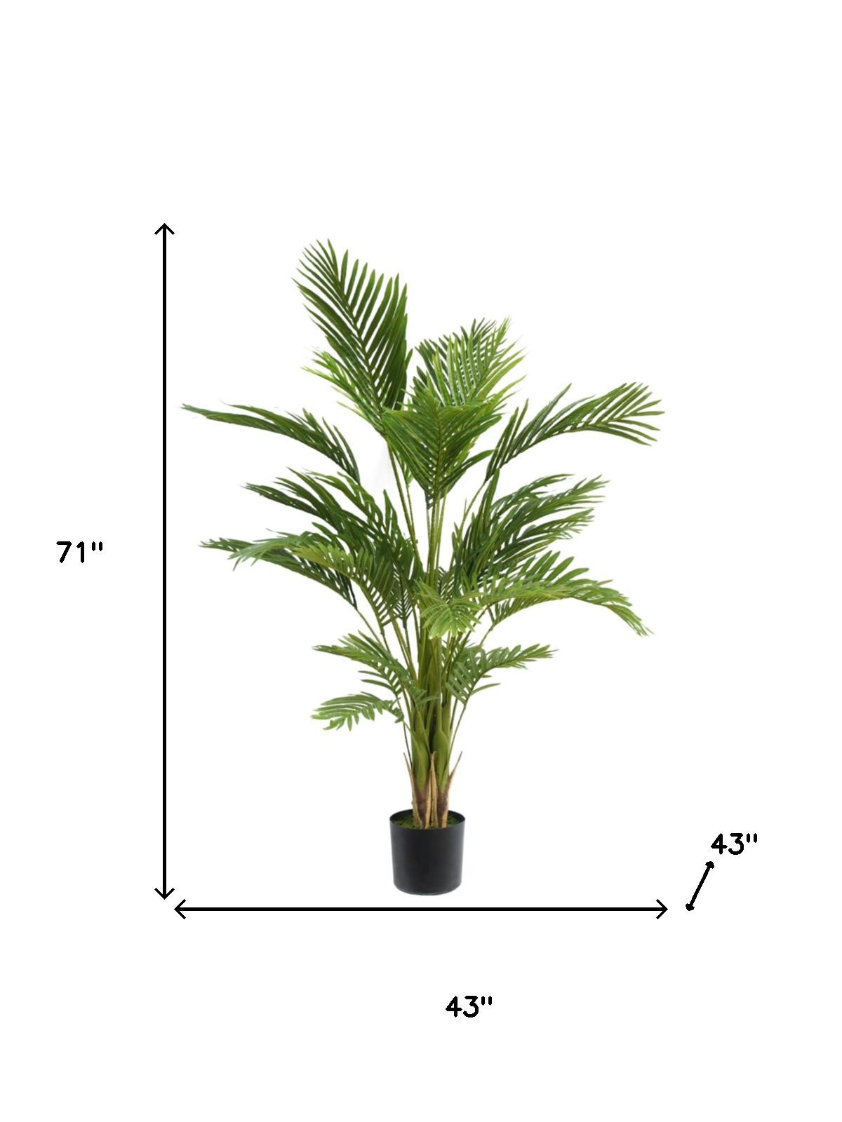 The 43-inch green artificial palm in cylindrical black pot adds a touch of nature to any space. This stunning palm tree is perfect for floor placement, making it a bold statement piece in your home or office. Its vibrant green color brings life to any decor while requiring no maintenance. Crafted from durable plastic, this artificial plant is designed to withstand outdoor use, allowing you to enhance your patio or garden effortlessly. The included black cylindrical pot offers a modern and stylish base that complements any interior. Ideal for birthdays or festive occasions, this versatile plant can transform your surroundings and elevate your space without the worry of upkeep. Enjoy the beauty of nature indoors with this elegant artificial palm tree. 71.00-inch h x 43.00-inch w x 43.00-inch d.
