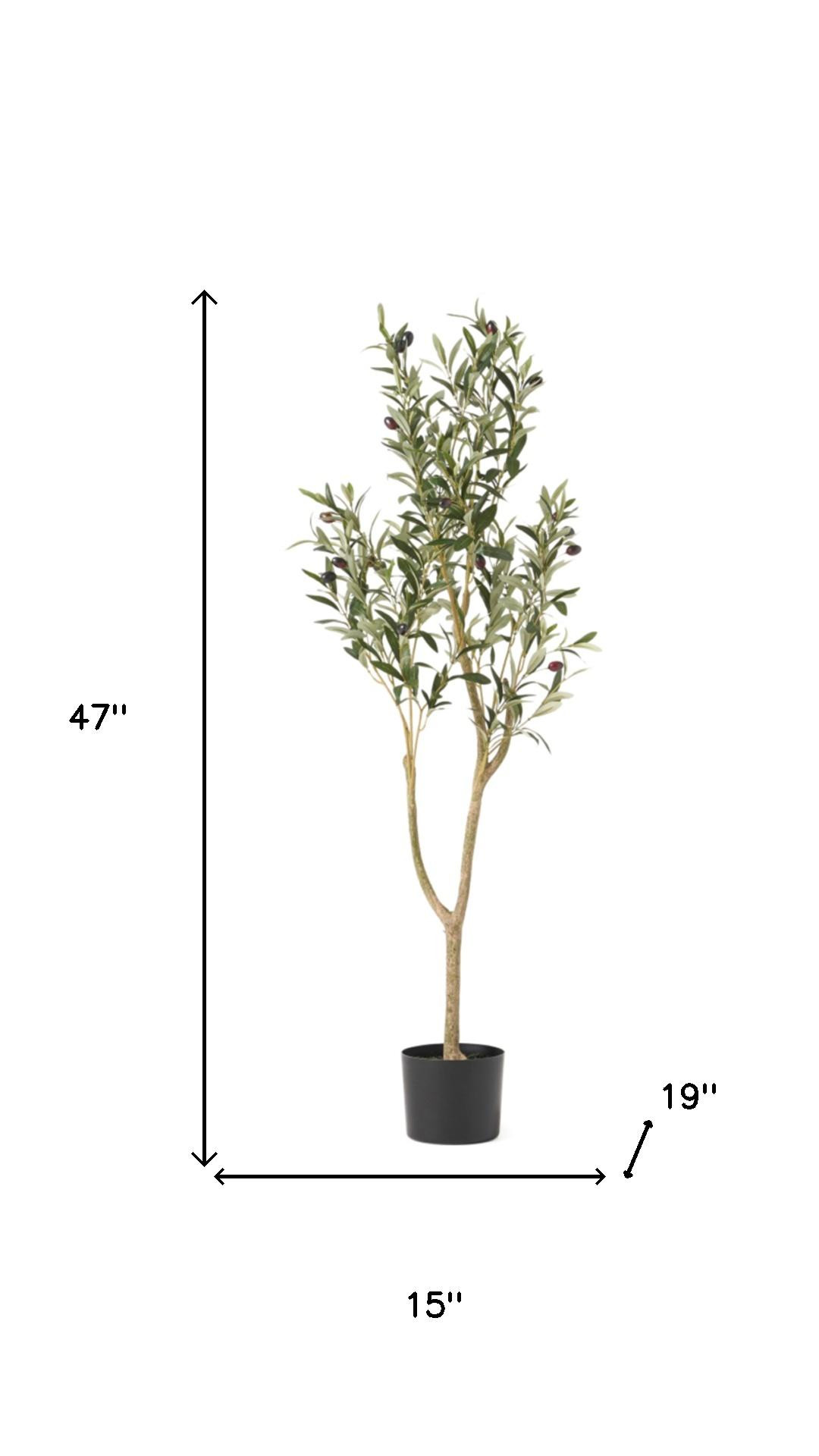 The 15-inch green artificial olive in cylindrical black pot is a stunning addition to any space. This lifelike olive tree, crafted from durable plastic, offers the charm of greenery without the maintenance. Perfectly suited for floor placement, it brightens up your home or office effortlessly. The sleek black cylindrical pot provides a modern touch while ensuring stability and style. Ideal for birthdays or to enhance your décor for various occasions, this artificial plant can also be used outdoors, bringing a refreshing element to your patio or garden. Add a splash of green to your interior or exterior with this vibrant olive tree that adds elegance and sophistication to any setting. 47.00-inch h x 15.00-inch w x 19.00-inch d.