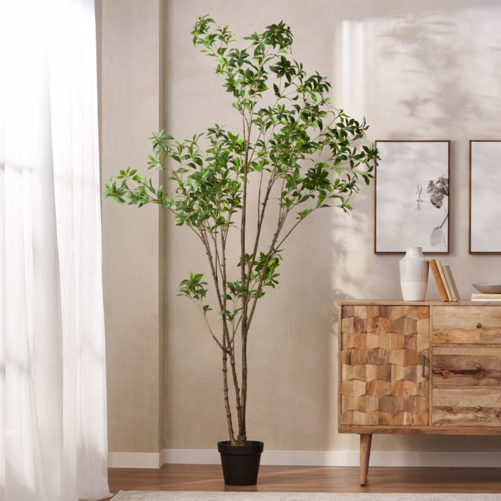 The 47-inch green artificial in cylindrical black pot is a stunning addition to any interior space. This vibrant green tree offers a refreshing touch of nature without the maintenance of live plants. Designed for floor placement, it seamlessly fits into various decor styles. The cylindrical black pot provides a sleek and modern base that enhances the overall aesthetic. Perfect for birthday celebrations or simply brightening up your home, this versatile artificial plant combines style and ease. Crafted from durable plastic, it is suitable for outdoor use, adding charm to patios or gardens. With its lifelike appearance, this artificial tree effortlessly brings a touch of greenery to your surroundings. Enjoy the beauty of nature year-round with this exquisite piece. 94.50-inch h x 47.00-inch w x 47.00-inch d.