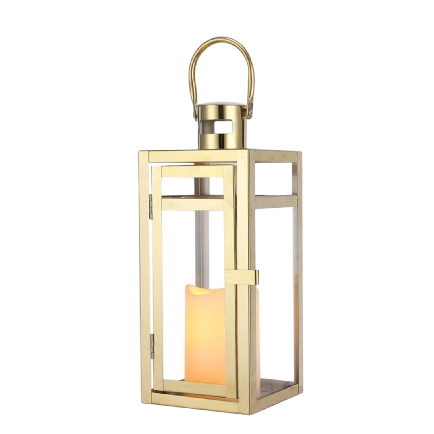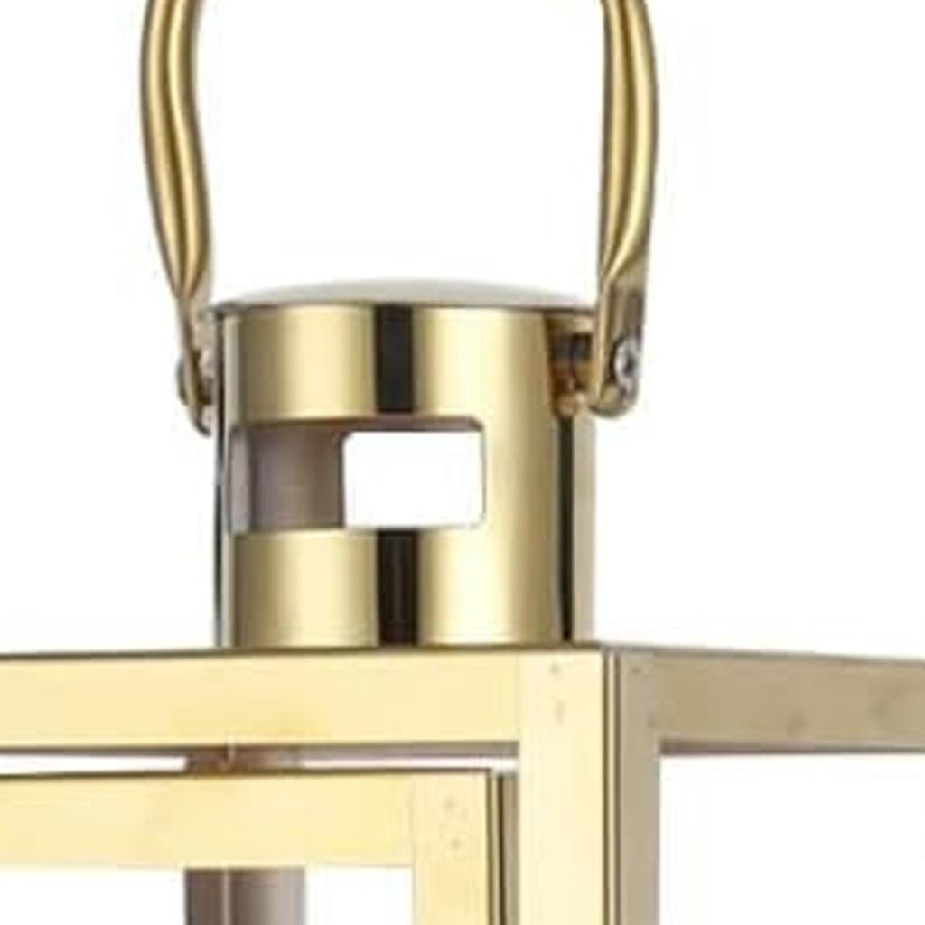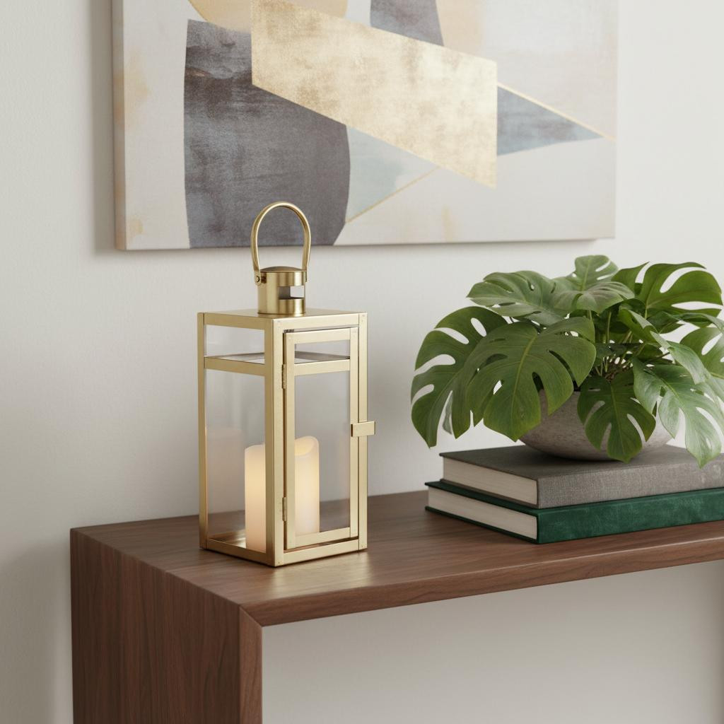 Stylize your tabletop, light up your back patio or add the perfect touch of low light to your living room with this 12-inch clear and gold glass and stainless steel tabletop lantern candle holder. Dress up your home to impress every season with this fabulous candleholder that brings a delightful look and glow to your space. Ideal for everyday use but would also be a stunning accent for entertaining or a special event. This lantern features an angular, modern style, and is a pretty decorative accent on its own, with or without a candle. 12.00-inch h x 5.00-inch w x 5.00-inch d.