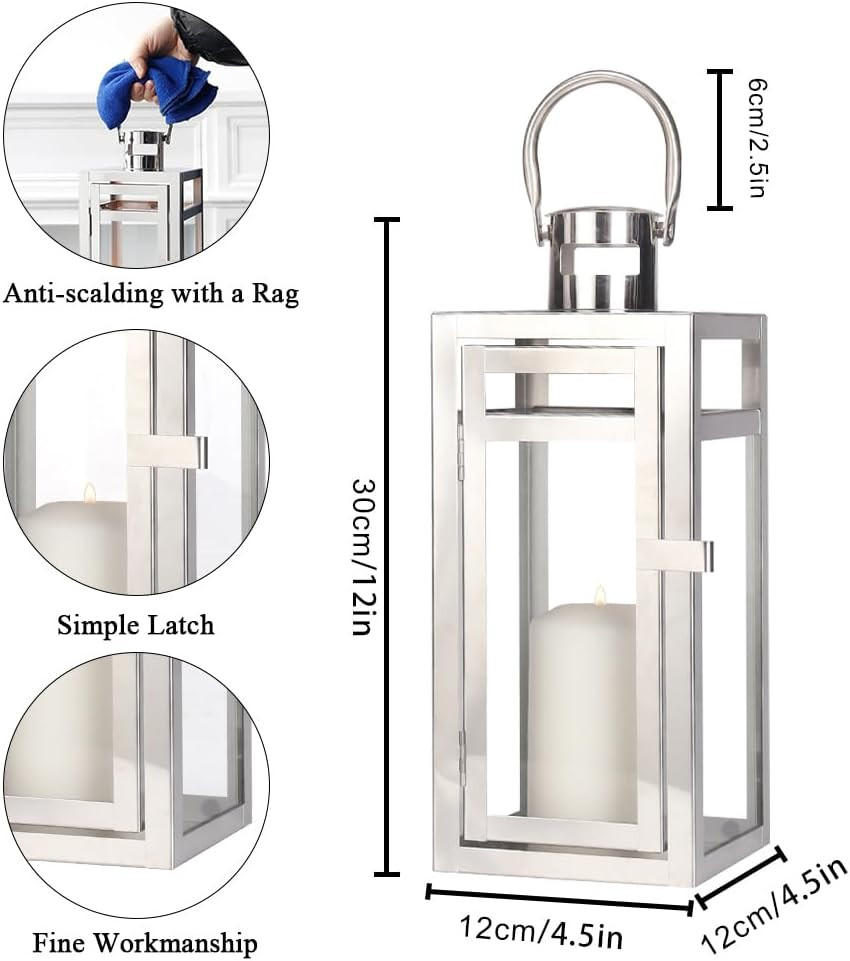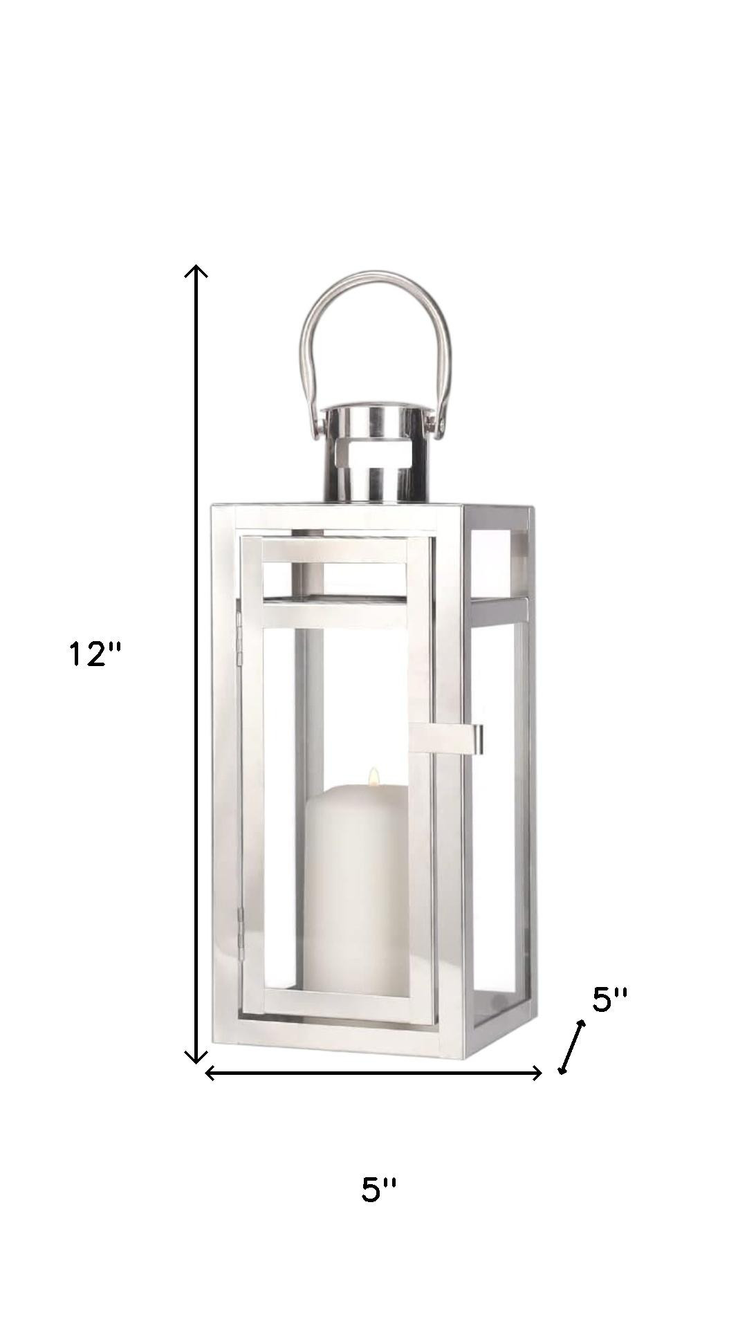 This 12-inch clear and silver glass and stainless steel floor lantern candle holder adds flair, function, and visual interest to any home or special occasion. Dress up your home to impress every season with this fabulous candleholder that brings a delightful look and glow to your space. Ideal for everyday use but would also be a stunning accent for entertaining or a special event. This lantern features an angular, modern style with clear glass panels, and is a pretty decorative accent on its own, with or without a candle. 12.00-inch h x 5.00-inch w x 5.00-inch d.