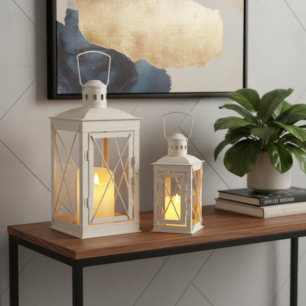 This set of two clear and white glass and metal tabletop lantern candle holders adds flair, function, and visual interest to any home or special occasion. Sold as a set of 2, these candleholders are the perfect illuminating design to accent your space in style. Dress up your home to impress every season with these fabulous decor pieces that bring a delightful look and glow to your space. Ideal for everyday use but would also be a stunning accent for entertaining or a special event. These lanterns feature a rustic, modern farmhouse style with clear glass panels and X design, making them a pretty decorative addition to your space on their own, with or without candles.