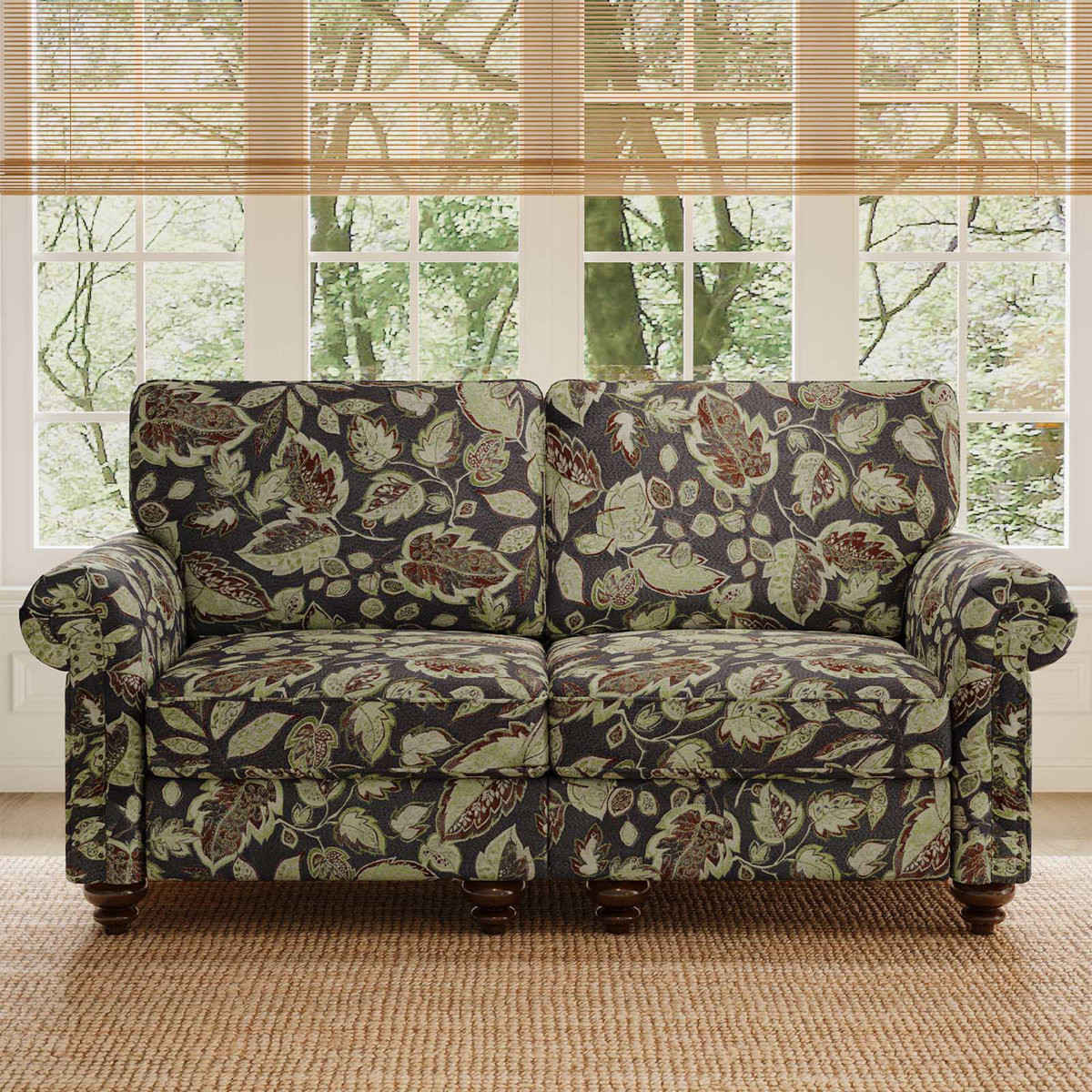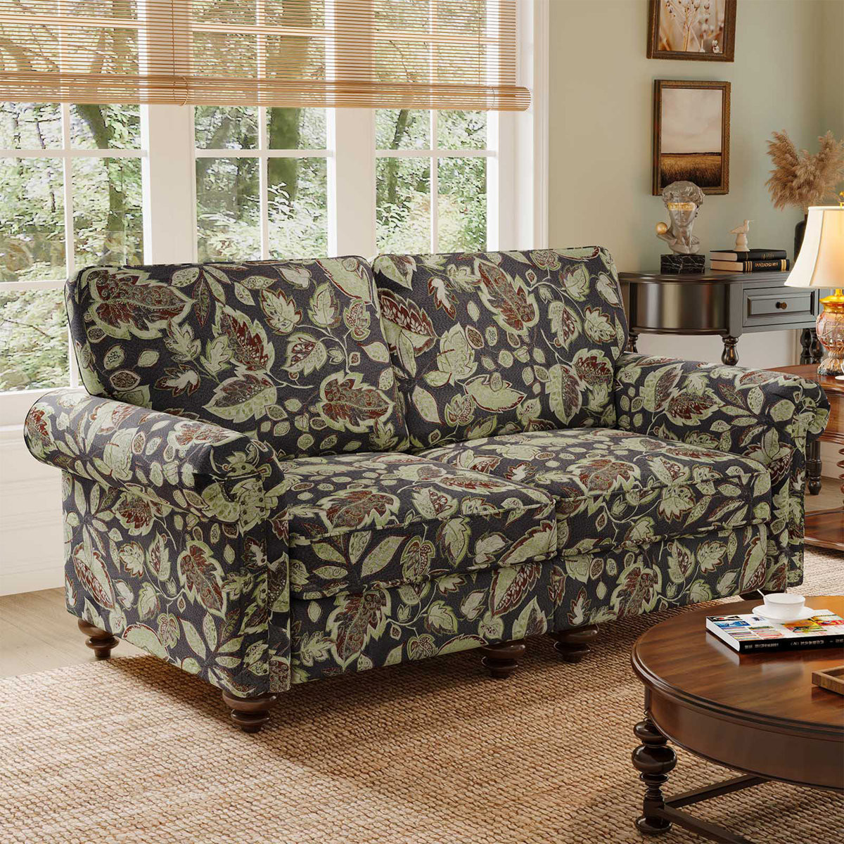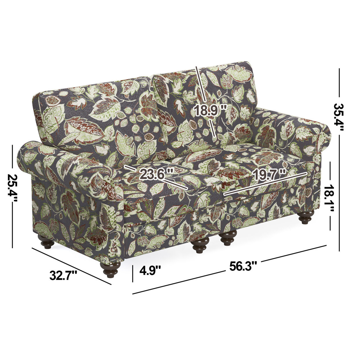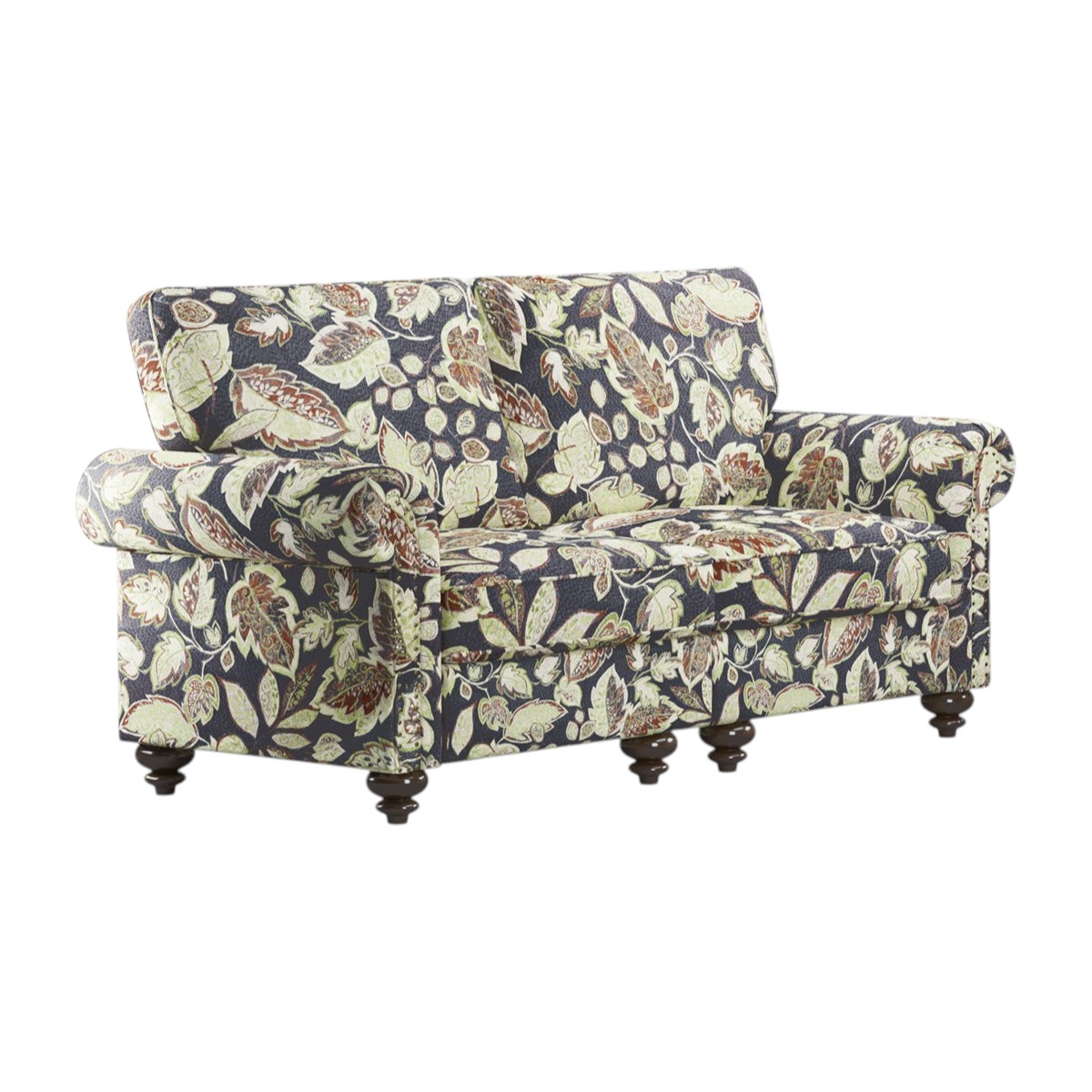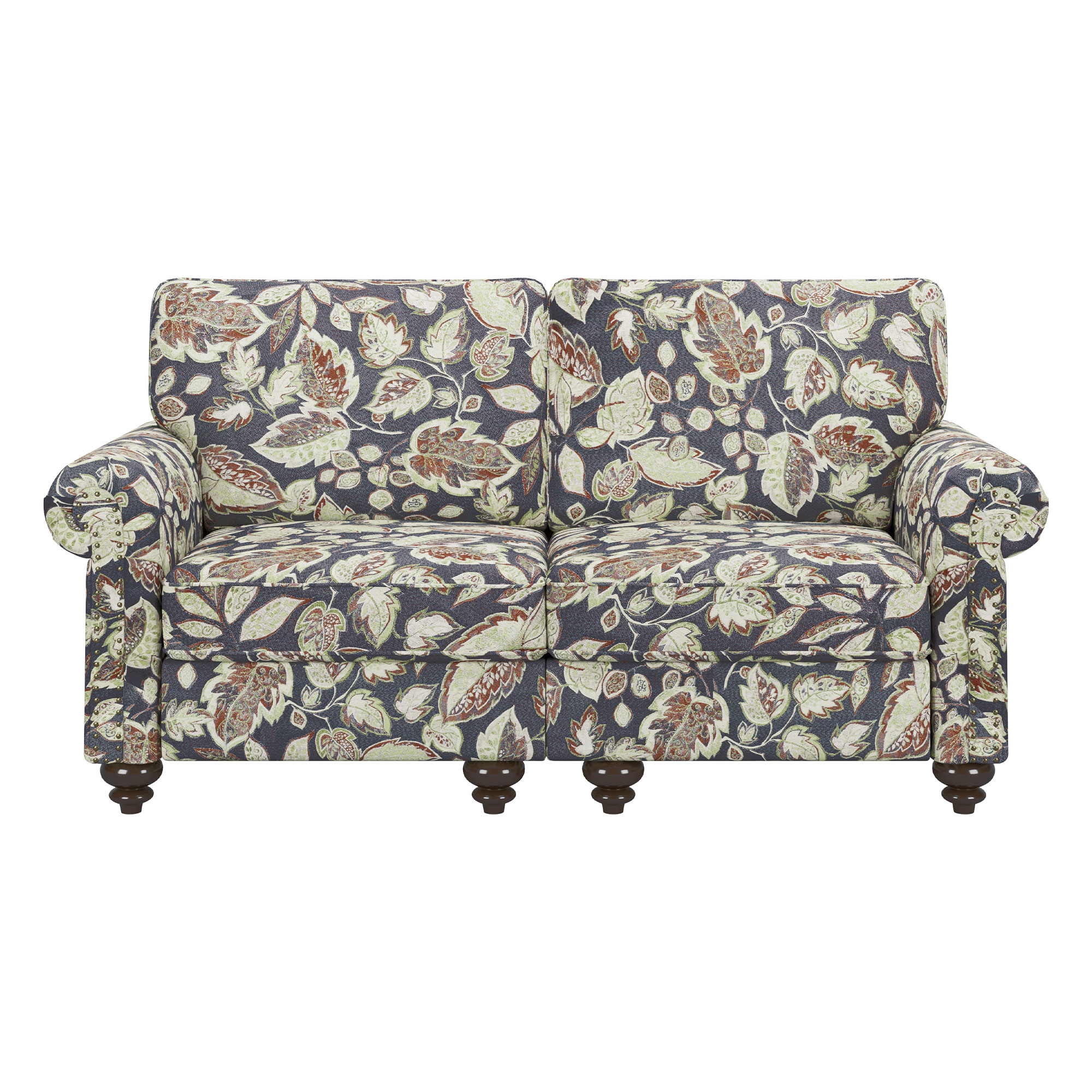 Designed for comfort and good looks, this 56-inch sage navy blue beige and brown floral loveseat is a great option to anchor your space. Rolled arms offer a comfy place to rest and give this piece some interest and shape. Brown solid wood legs effortlessly elevate the room and add a touch of contemporary design. A great showpiece for your room, this sofa is a must have. 35.40-inch h x 56.30-inch w x 32.70-inch d.