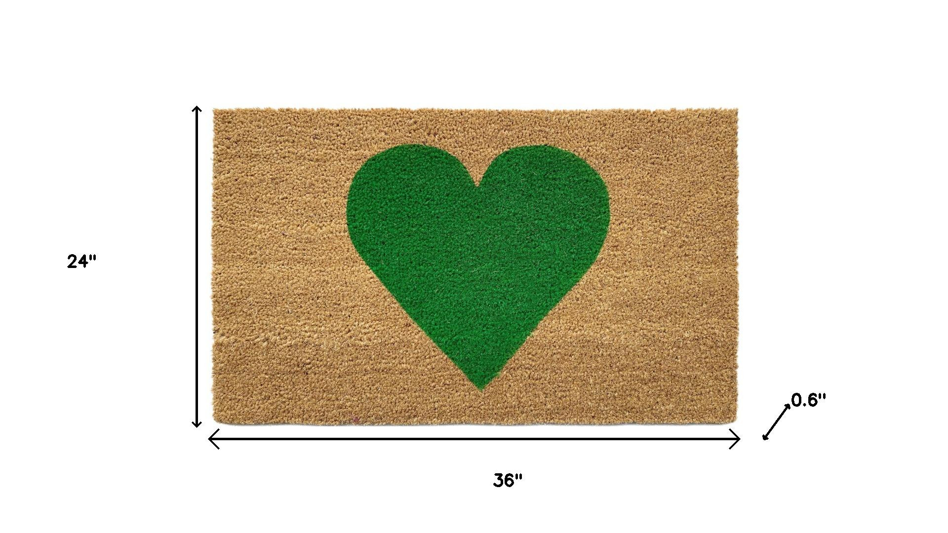 Known for it's extreme durability and ability to withstand heavy foot traffic, this 24-inch x 36-inch brown and green heart outdoor coir door mat is an ideal option for the front door or entrance way of your home or business. Crafted from coconut husks, this mat is not only functional but is an an eco-friendly and visually appealing accessory. The naturally bristled texture of coir is an efficient way to clean dirt and mud from shoes and is easy to clean and maintain. Add this festive and decorative mat to create a practical yet inviting welcome to all who enter. Add this decorative mat to create a practical yet inviting welcome to all who enter. 24.00-inch h x 36.00-inch w x 0.60-inch d.