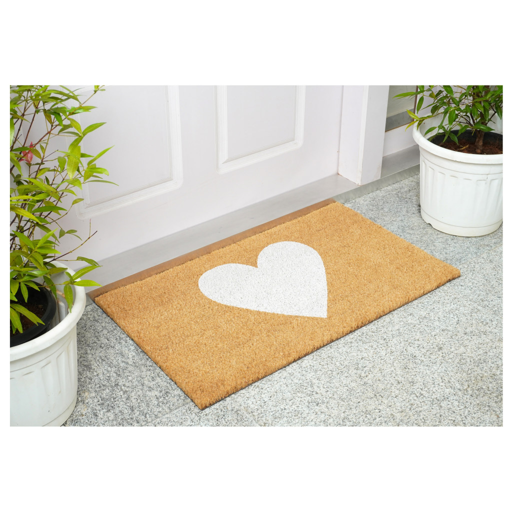 Known for it's extreme durability and ability to withstand heavy foot traffic, this 24-inch x 36-inch brown and white heart outdoor coir door mat is an ideal option for the front door or entrance way of your home or business. Crafted from coconut husks, this mat is not only functional but is an an eco-friendly and visually appealing accessory. The naturally bristled texture of coir is an efficient way to clean dirt and mud from shoes and is easy to clean and maintain. Add this festive and decorative mat to create a practical yet inviting welcome to all who enter. Add this decorative mat to create a practical yet inviting welcome to all who enter. 24.00-inch h x 36.00-inch w x 0.60-inch d.