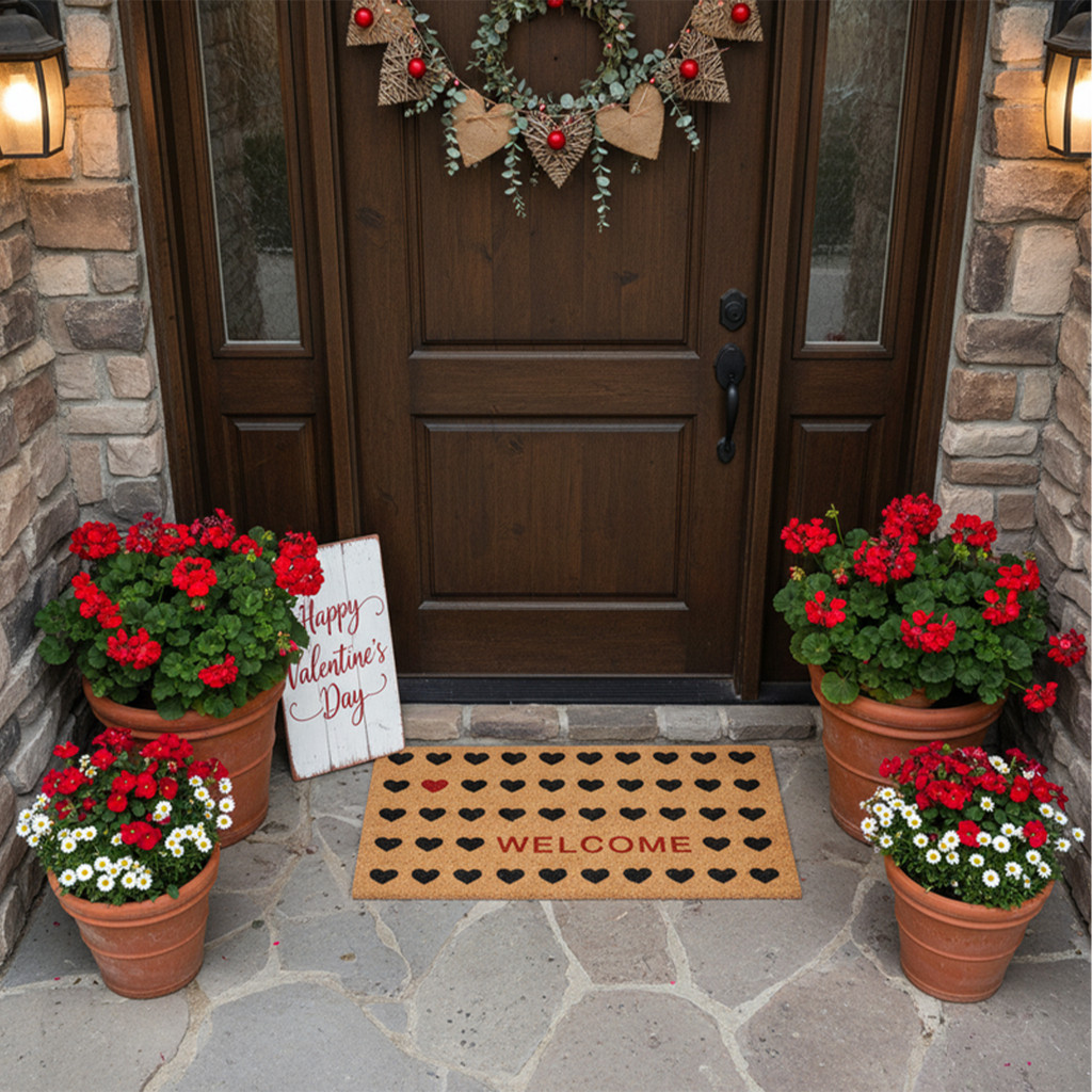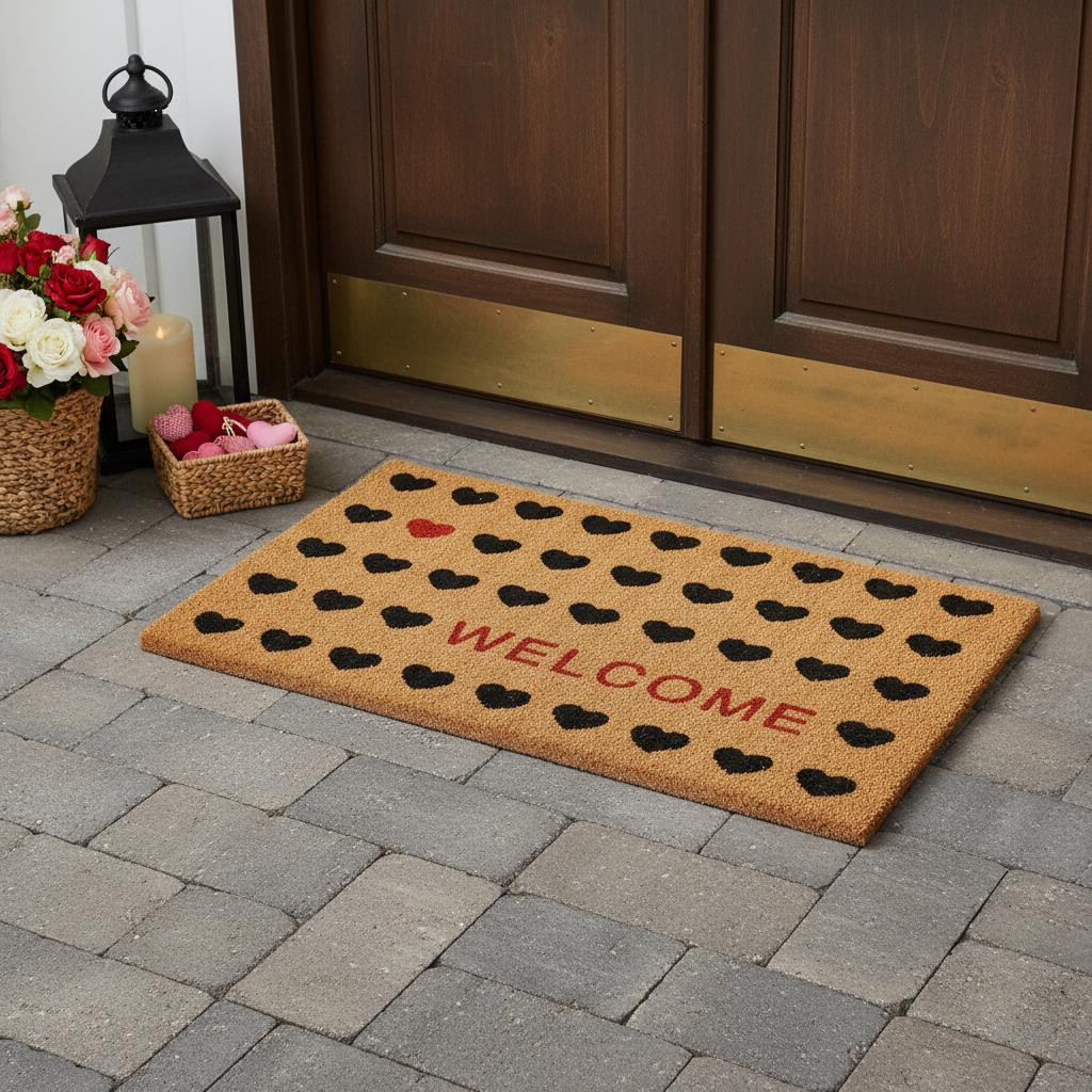 Known for it's extreme durability and ability to withstand heavy foot traffic, this 36-inch x 72-inch red and black valentine's day welcome outdoor coir door mat is an ideal option for the front door or entrance way of your home or business. Crafted from coconut husks, this mat is not only functional but is an an eco-friendly and visually appealing accessory. The naturally bristled texture of coir is an efficient way to clean dirt and mud from shoes and is easy to clean and maintain. Add this festive and decorative valentine's day mat to create a practical yet inviting welcome to all who enter. 36.00-inch h x 72.00-inch w x 0.60-inch d.