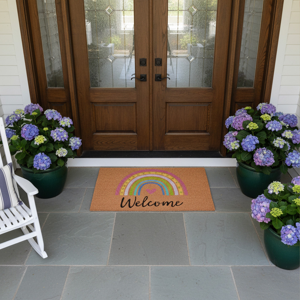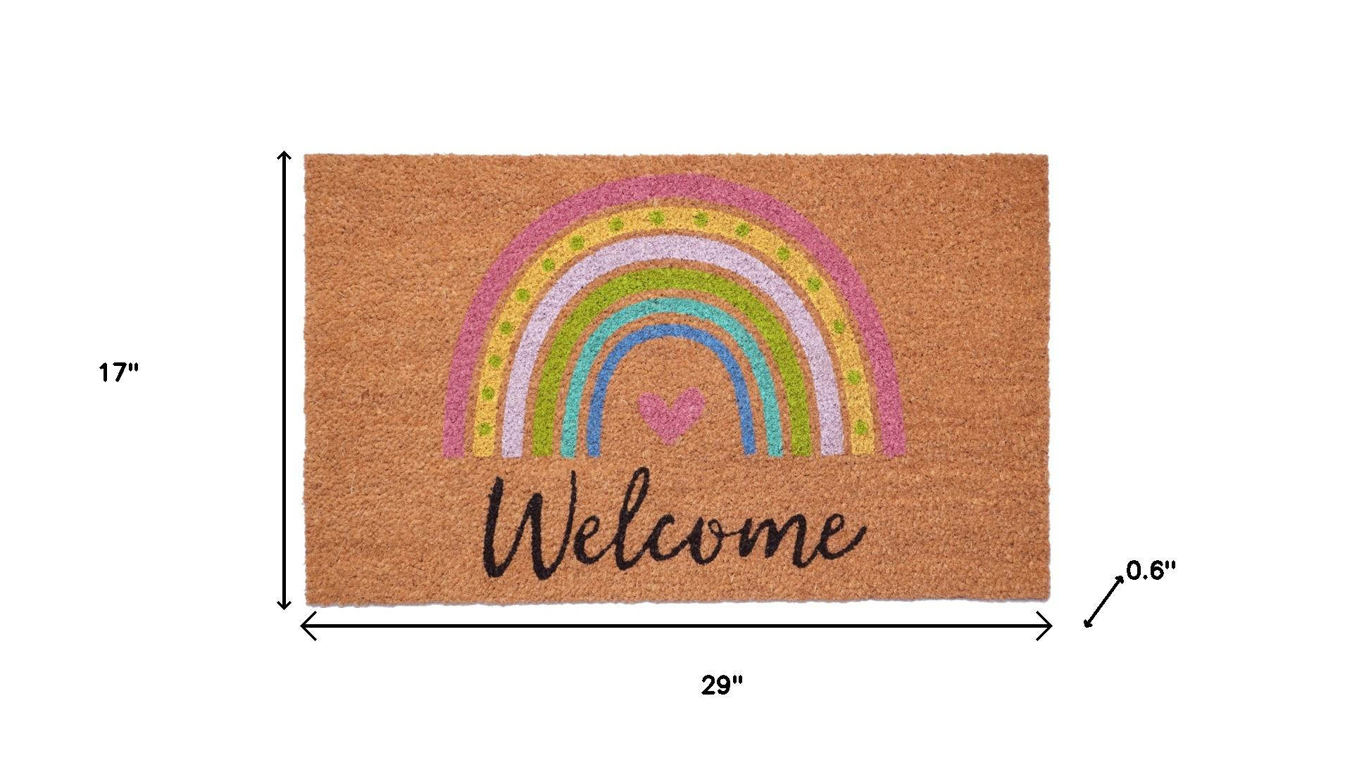 Known for it's extreme durability and ability to withstand heavy foot traffic, this 17-inch x 29-inch brown and pink rainbow welcome outdoor coir door mat is an ideal option for the front door or entrance way of your home or business. Crafted from coconut husks, this mat is not only functional but is an an eco-friendly and visually appealing accessory. The naturally bristled texture of coir is an efficient way to clean dirt and mud from shoes and is easy to clean and maintain. 17.00-inch h x 29.00-inch w x 0.60-inch d.