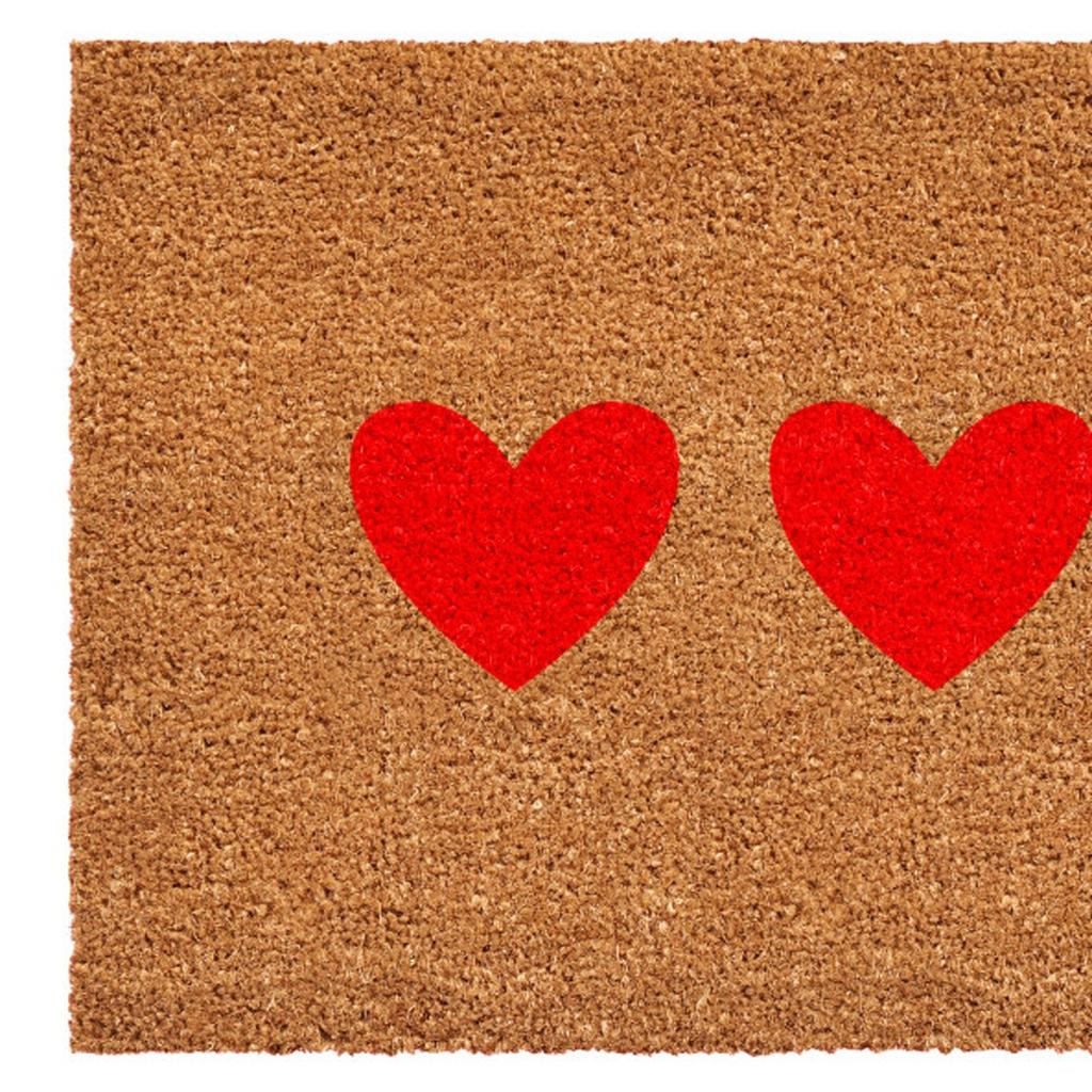 Known for it's extreme durability and ability to withstand heavy foot traffic, this 12-inch x 24-inch brown and red heart outdoor coir door mat is an ideal option for the front door or entrance way of your home or business. Crafted from coconut husks, this mat is not only functional but is an an eco-friendly and visually appealing accessory. The naturally bristled texture of coir is an efficient way to clean dirt and mud from shoes and is easy to clean and maintain. Add this festive and decorative mat to create a practical yet inviting welcome to all who enter. Add this decorative mat to create a practical yet inviting welcome to all who enter. 12.00-inch h x 24.00-inch w x 0.60-inch d.
