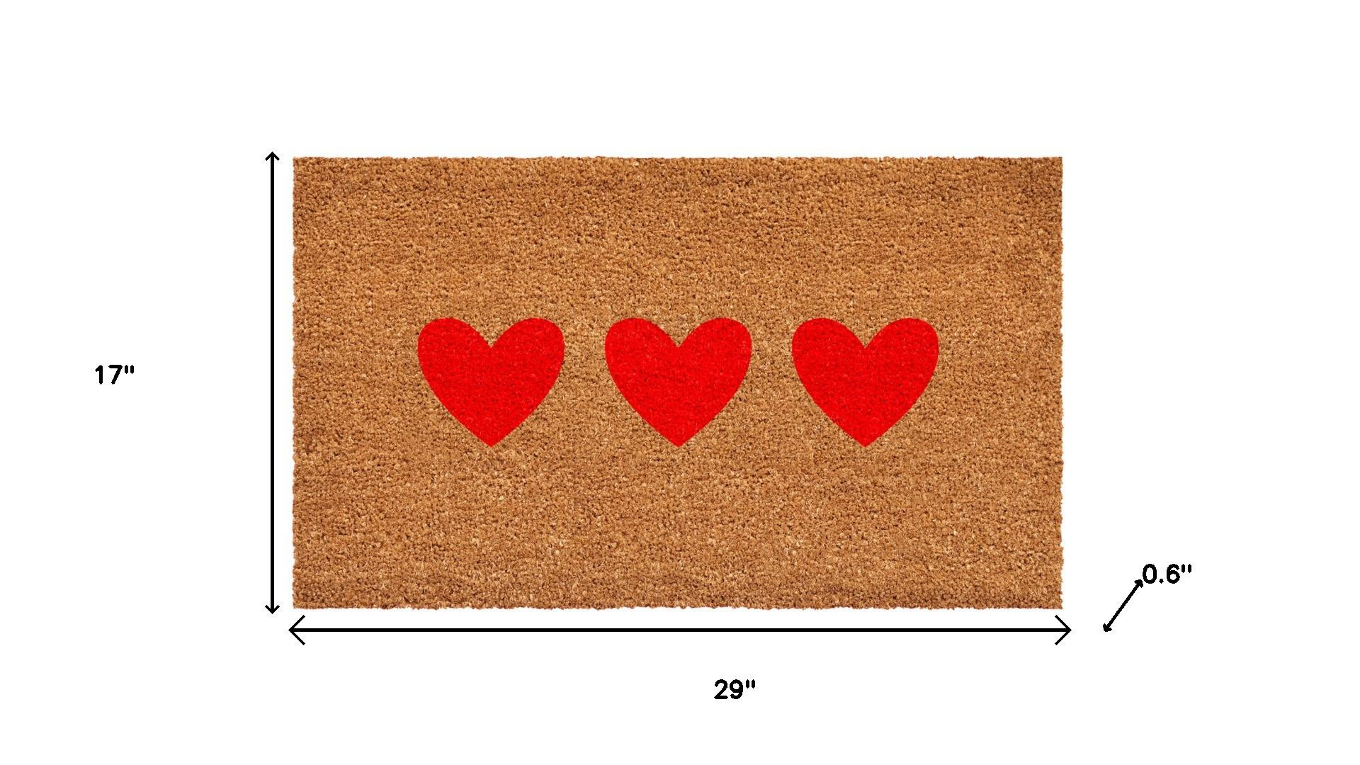 Known for it's extreme durability and ability to withstand heavy foot traffic, this 17-inch x 29-inch brown and red heart outdoor coir door mat is an ideal option for the front door or entrance way of your home or business. Crafted from coconut husks, this mat is not only functional but is an an eco-friendly and visually appealing accessory. The naturally bristled texture of coir is an efficient way to clean dirt and mud from shoes and is easy to clean and maintain. Add this festive and decorative mat to create a practical yet inviting welcome to all who enter. Add this decorative mat to create a practical yet inviting welcome to all who enter. 17.00-inch h x 29.00-inch w x 0.60-inch d.