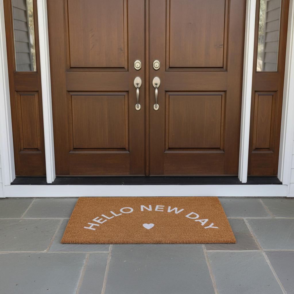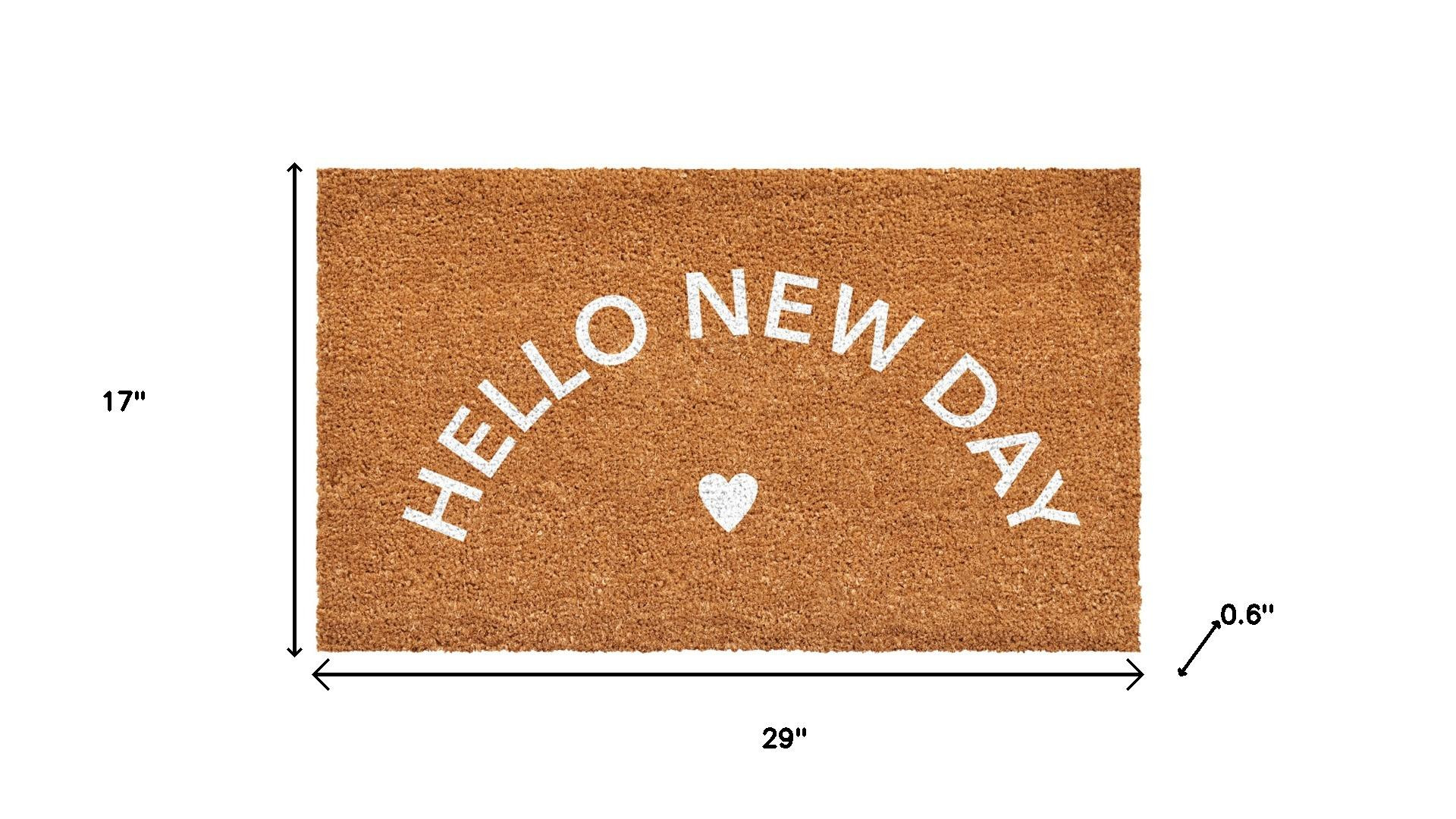 Known for it's extreme durability and ability to withstand heavy foot traffic, this 17-inch x 29-inch brown and white hello new day outdoor coir door mat is an ideal option for the front door or entrance way of your home or business. Crafted from coconut husks, this mat is not only functional but is an an eco-friendly and visually appealing accessory. The naturally bristled texture of coir is an efficient way to clean dirt and mud from shoes and is easy to clean and maintain. Add this festive and decorative mat to create a practical yet inviting welcome to all who enter. Add this decorative mat to create a practical yet inviting welcome to all who enter. 17.00-inch h x 29.00-inch w x 0.60-inch d.