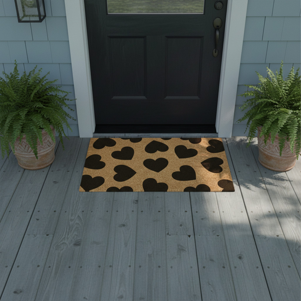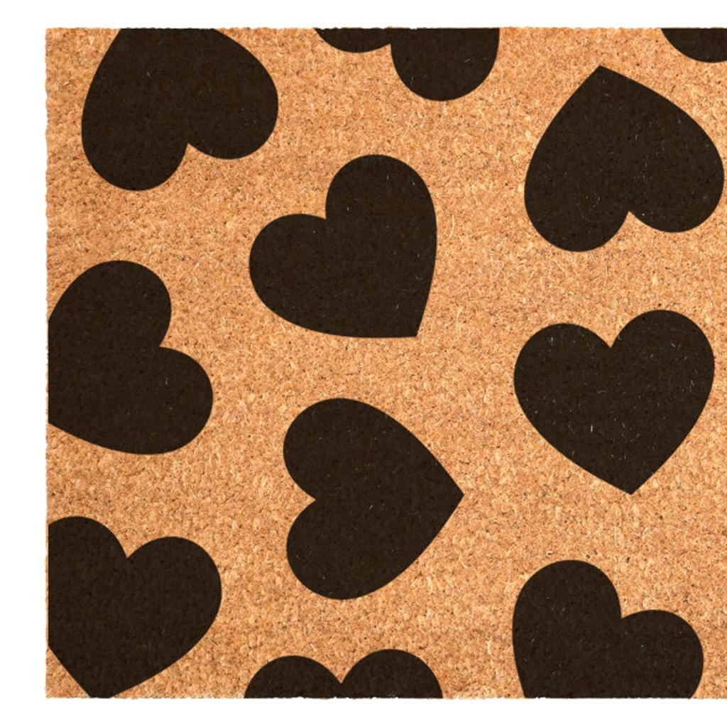 Known for it's extreme durability and ability to withstand heavy foot traffic, this 24-inch x 36-inch brown and black hearts outdoor coir door mat is an ideal option for the front door or entrance way of your home or business. Crafted from coconut husks, this mat is not only functional but is an an eco-friendly and visually appealing accessory. The naturally bristled texture of coir is an efficient way to clean dirt and mud from shoes and is easy to clean and maintain. Add this festive and decorative mat to create a practical yet inviting welcome to all who enter. Add this decorative mat to create a practical yet inviting welcome to all who enter. 24.00-inch h x 36.00-inch w x 0.60-inch d.
