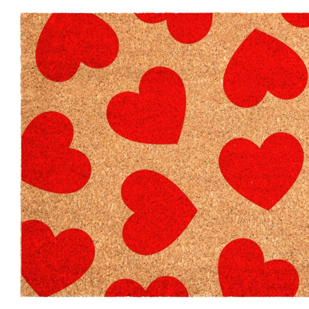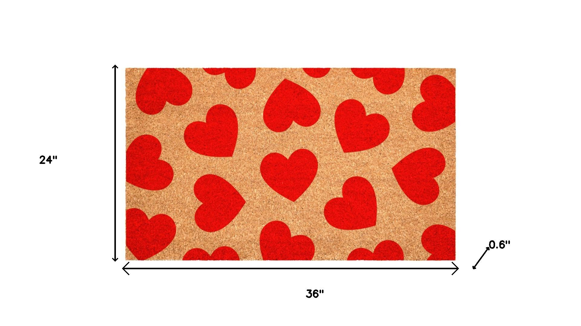 Known for it's extreme durability and ability to withstand heavy foot traffic, this 24-inch x 36-inch brown and red hearts outdoor coir door mat is an ideal option for the front door or entrance way of your home or business. Crafted from coconut husks, this mat is not only functional but is an an eco-friendly and visually appealing accessory. The naturally bristled texture of coir is an efficient way to clean dirt and mud from shoes and is easy to clean and maintain. Add this festive and decorative mat to create a practical yet inviting welcome to all who enter. Add this decorative mat to create a practical yet inviting welcome to all who enter. 24.00-inch h x 36.00-inch w x 0.60-inch d.