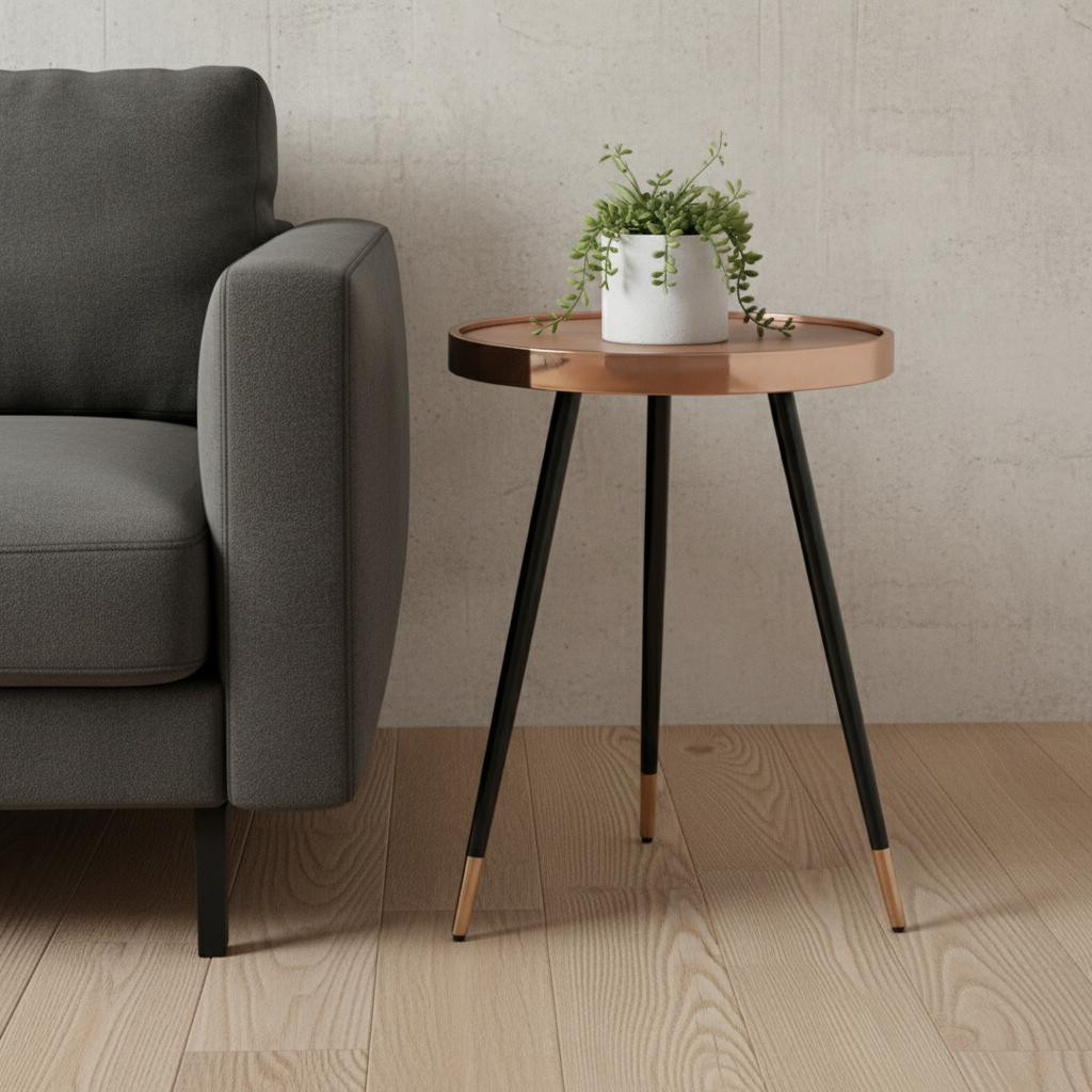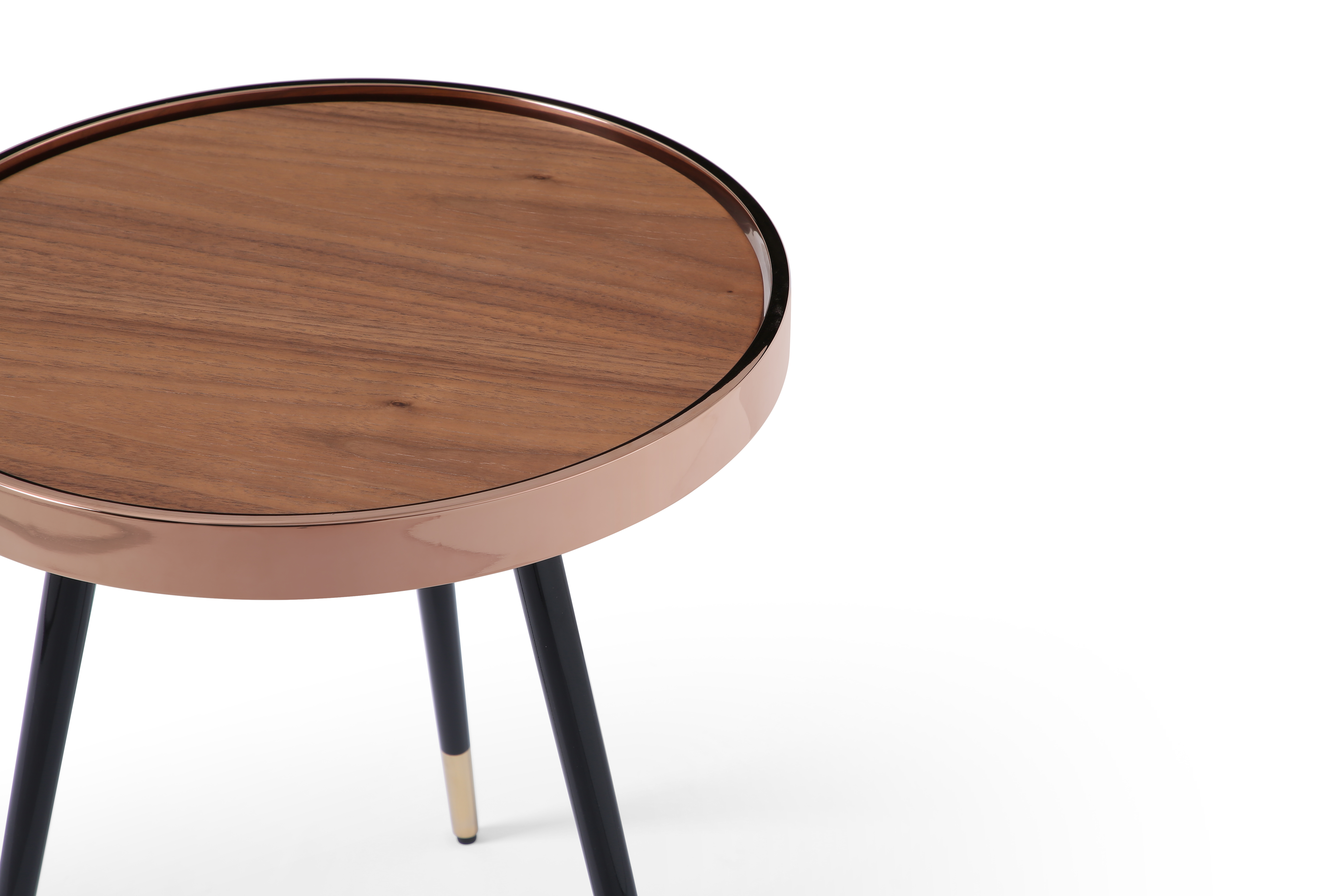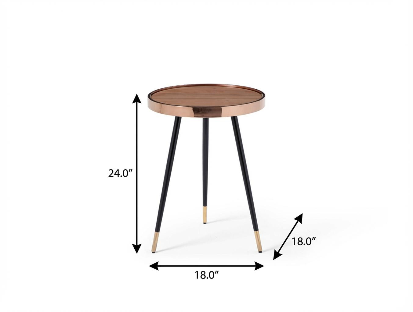 Show off your exquisite taste with this 24-inch walnut rose gold and black round end table. The walnut manufactured wood top of this table is accented by rose gold and flanked with black stainless steel legs for a modern chic look. An ideal location for placing your snacks and drinks, and a place to keep your lamp, frames, or other accessories. You can also use it as an entryway table to hold your keys. 24.00-inch h x 18.00-inch w x 18.00-inch d.